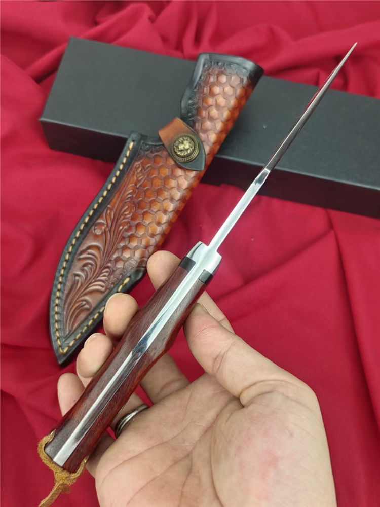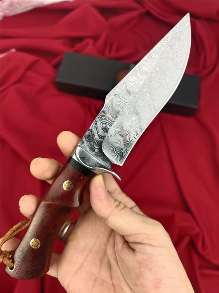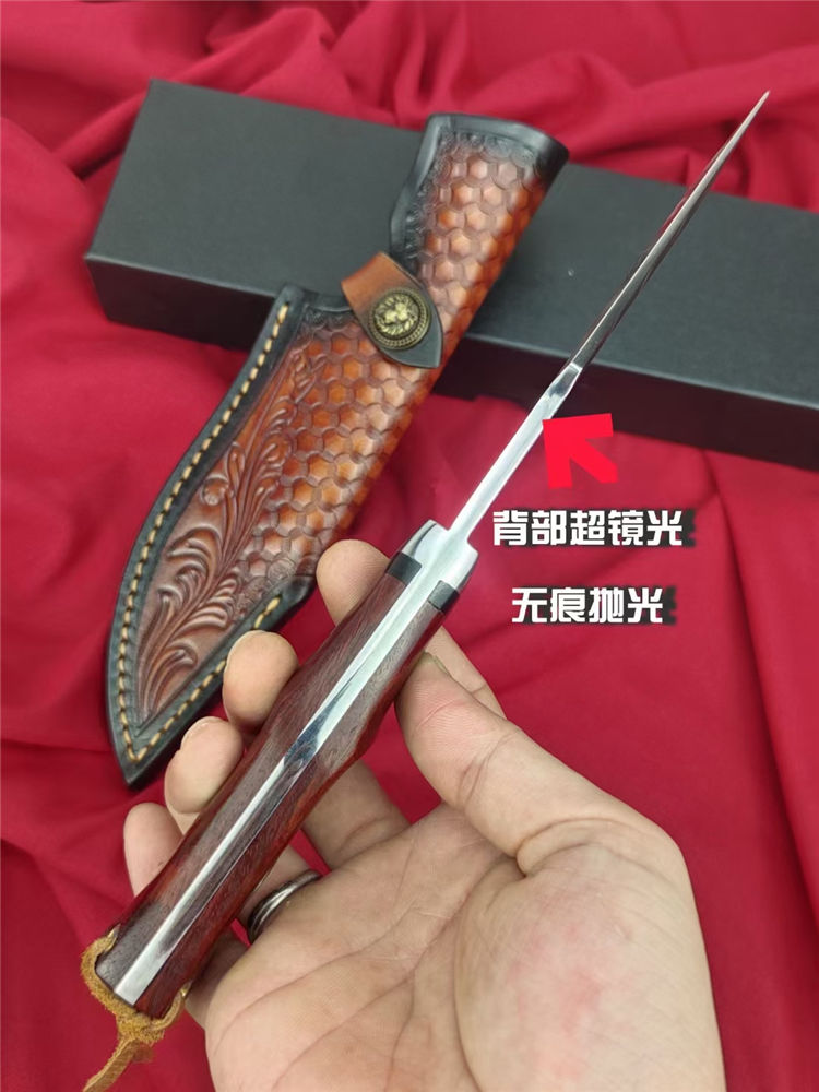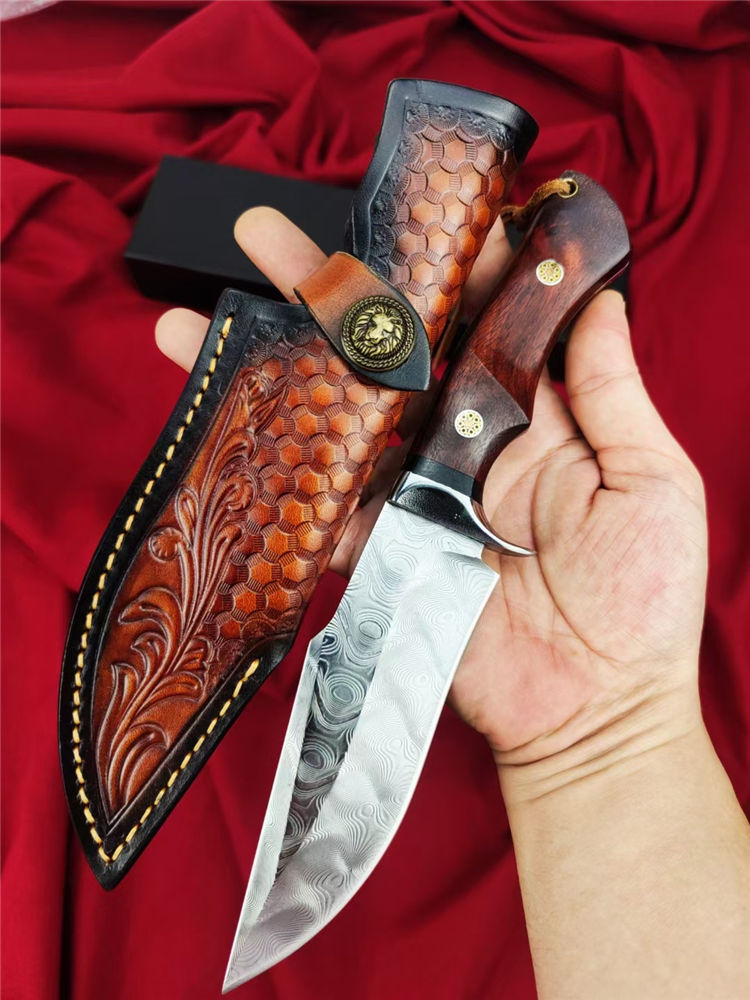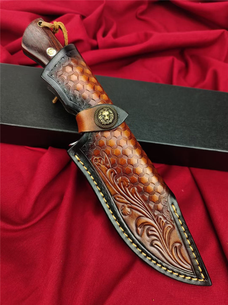 大马士革赤兔直刀 全长:255mm 刃长:133mm 柄长:115m 刃宽:42mm最宽处 刃厚:4.7mm 刃材:进口无心大马士革 刀重:280g/358g 含皮套 毛重:475g(含包装盒) 硬度:59-60HRC 表面:大马士革花纹镜光 柄材:越南血檀木-红檀 配套:手工植鞣压花进口牛皮套 包装:黑礼盒