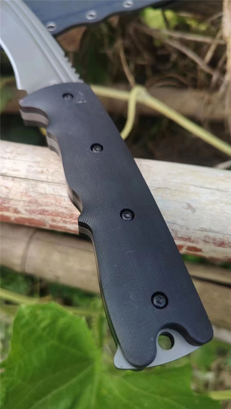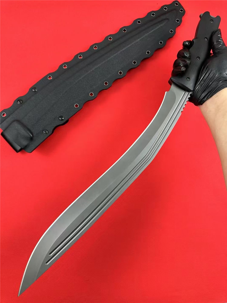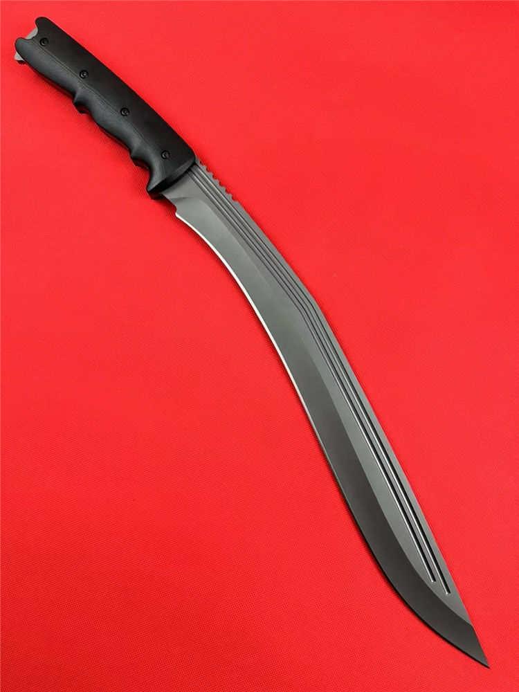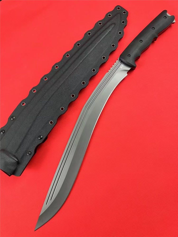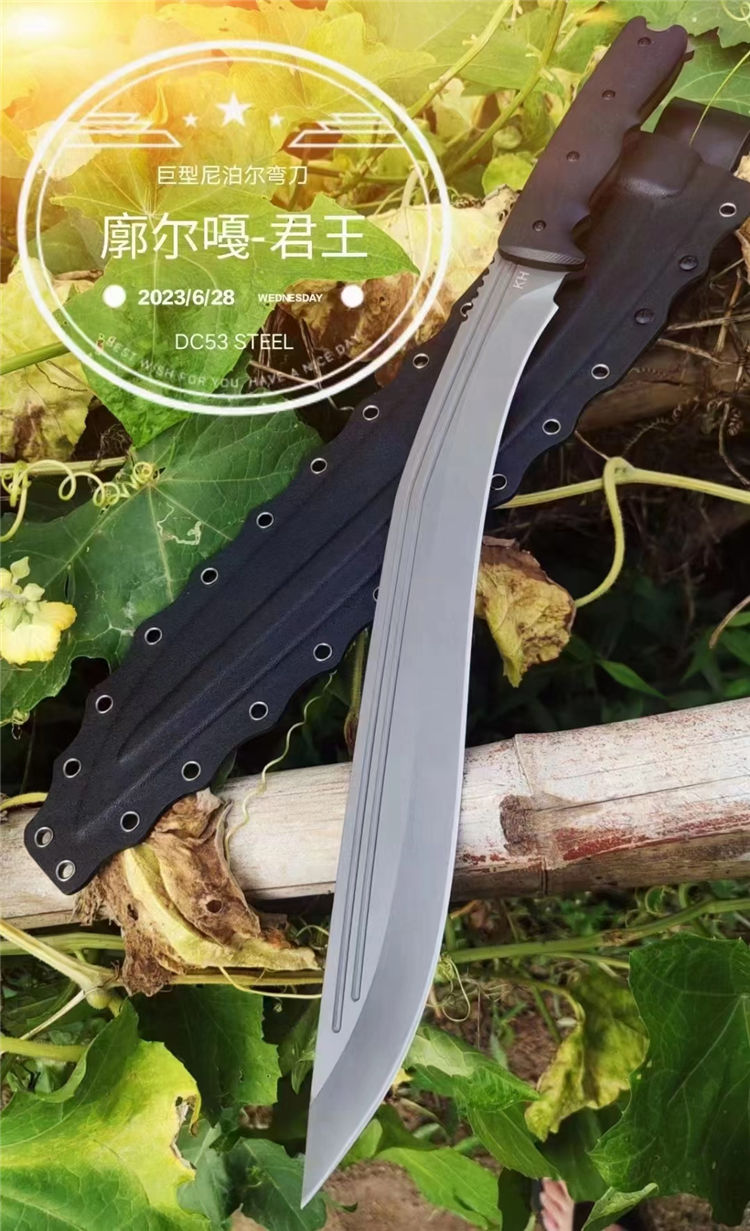 尼泊尔廓尔嘠君王狗腿弯刀 全长:575mm 刃长:400mm开刃部分 柄长:160m 刃宽:45mm最宽处 刃厚:5.5mm 刃材:DC53钢深冷处理 刀重:915g/1025g含鞘 毛重:1332g (含鞘含包装) 硬度:60+HRC 表面:纳米灰钛涂层+CNC电脑锣 柄材:进口G10高密度碾压材料 结构:一体龙骨成型 配套:尼龙玻纤战术K鞘 包装:纸箱盒