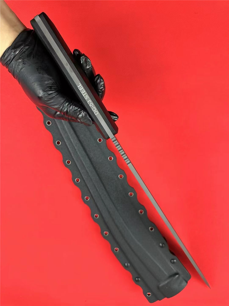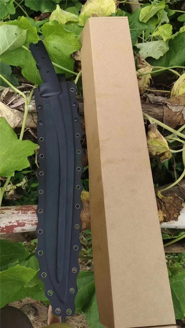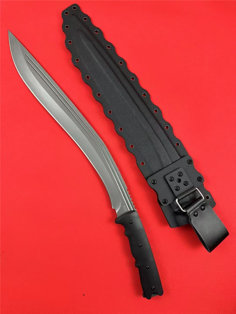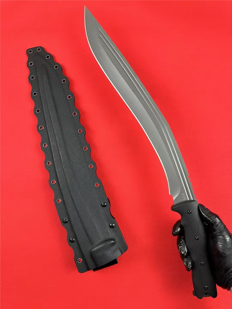 尼泊尔廓尔嘠君王狗腿弯刀 全长:575mm 刃长:400mm开刃部分 柄长:160m 刃宽:45mm最宽处 刃厚:5.5mm 刃材:DC53钢深冷处理 刀重:915g/1025g含鞘 毛重:1332g (含鞘含包装) 硬度:60+HRC 表面:纳米灰钛涂层+CNC电脑锣 柄材:进口G10高密度碾压材料 结构:一体龙骨成型 配套:尼龙玻纤战术K鞘 包装:纸箱盒