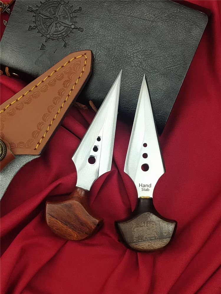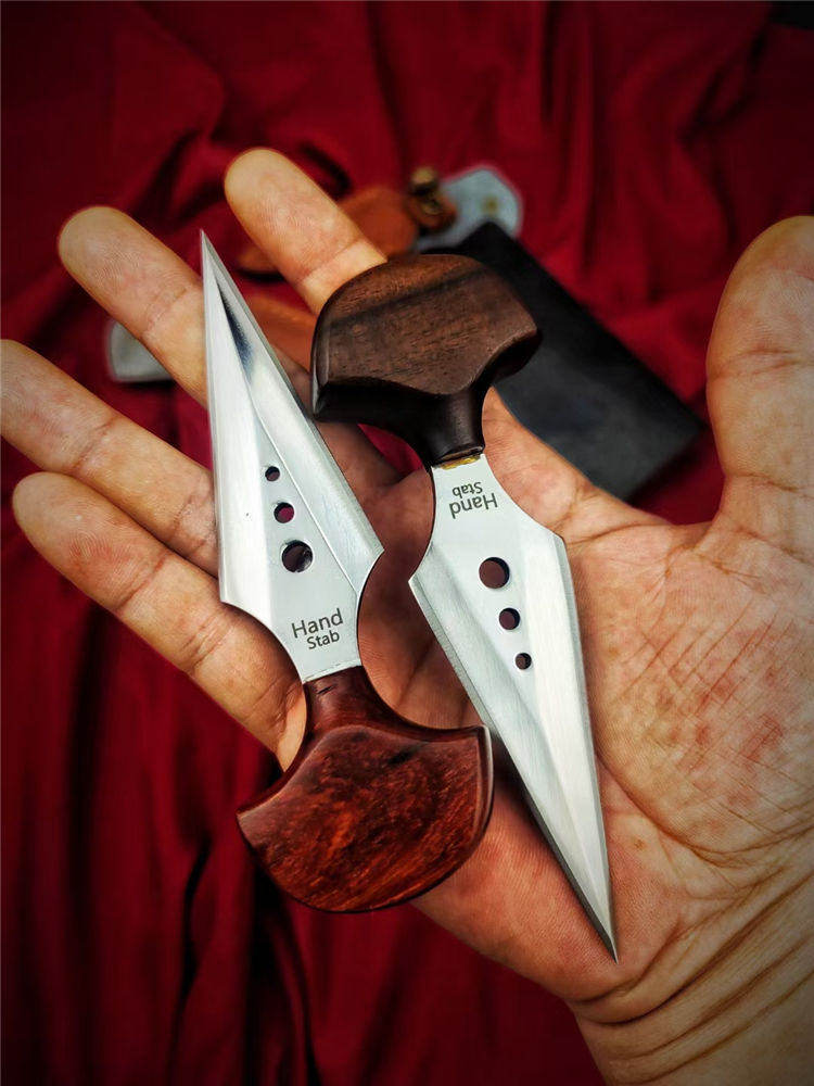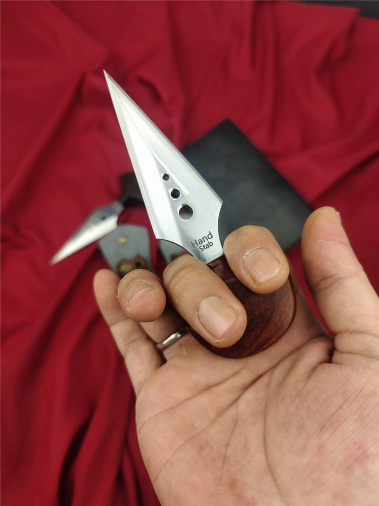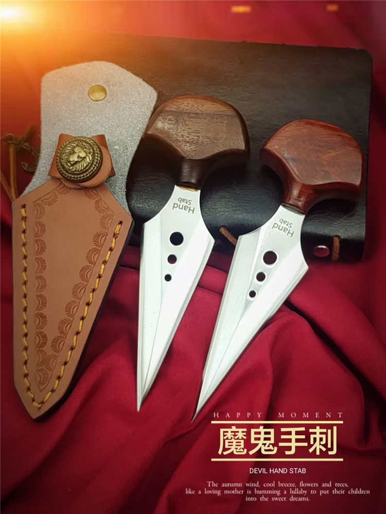 魔鬼手刺 全长:138mm 刃长:80mm 柄长:38mm 柄厚:18mm 刃宽:32mm 刃厚:3.8mm 刃材:D2高速钢 净量:59g/85含套 硬度:58HRC 表面:超镜光抛光 柄材:红檀木 结构:一体龙骨成型 其他:配手工压花皮套