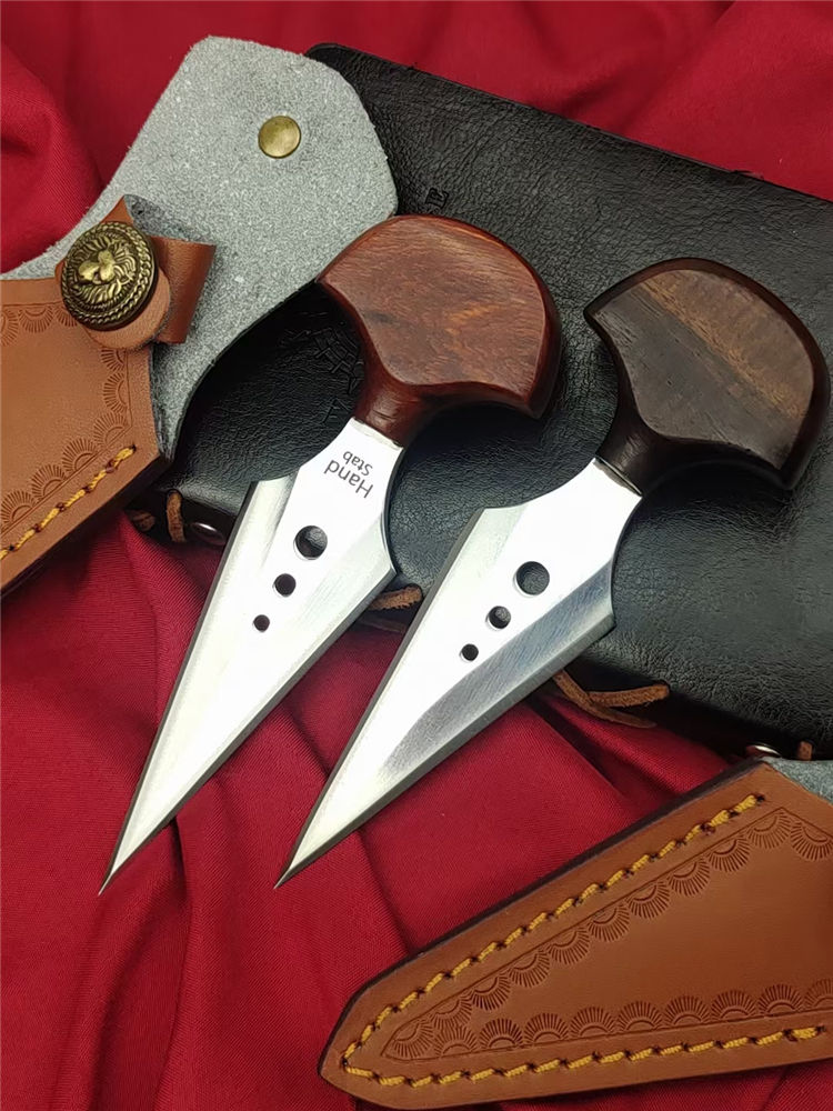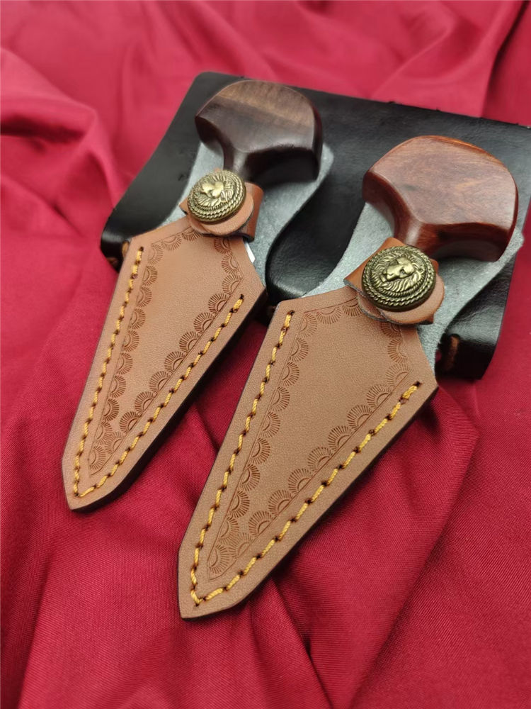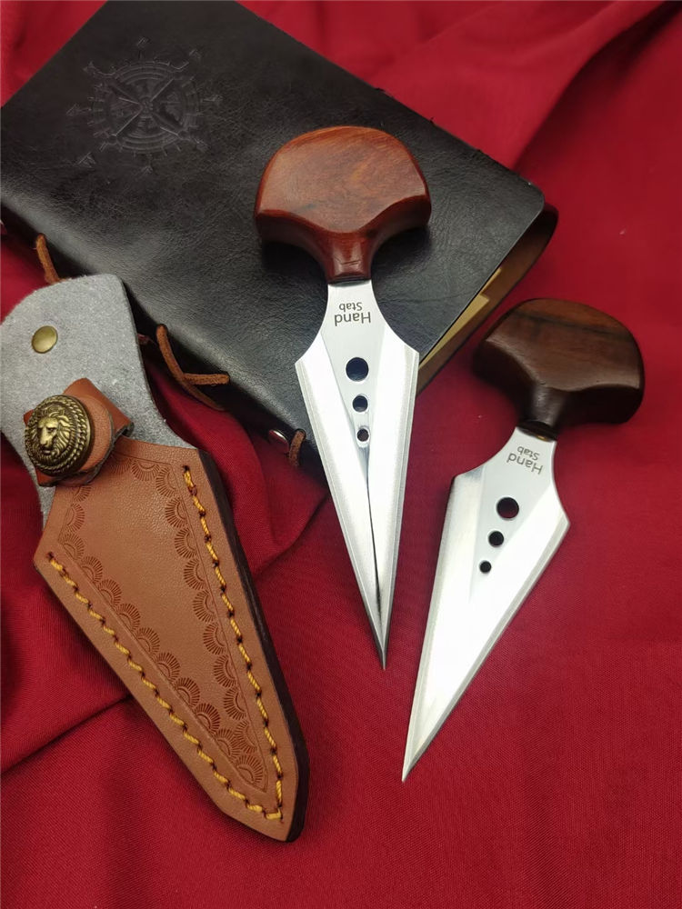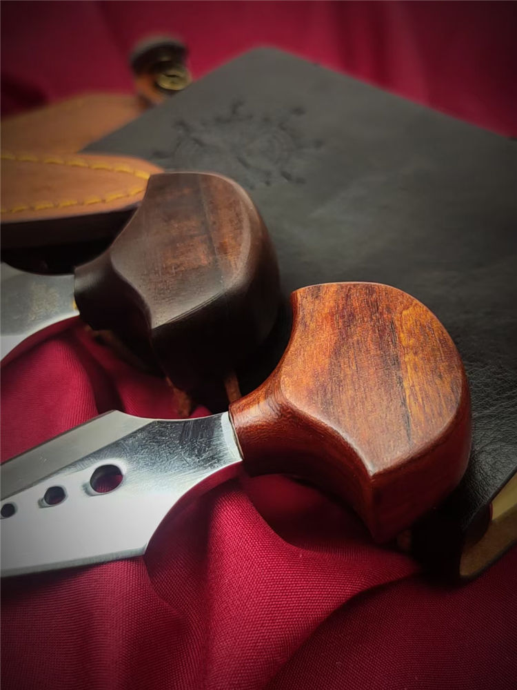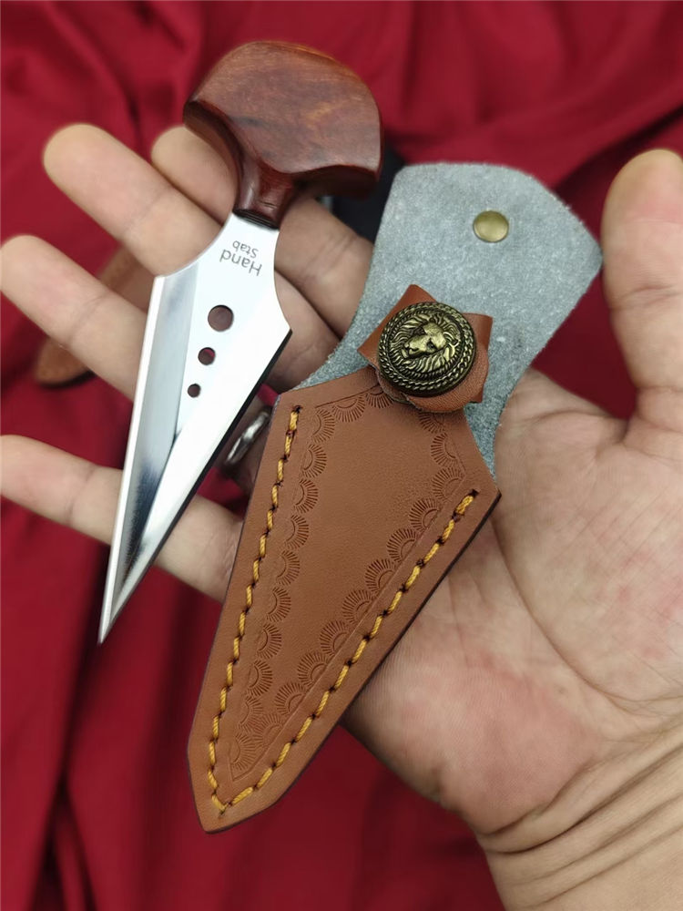 魔鬼手刺 全长:138mm 刃长:80mm 柄长:38mm 柄厚:18mm 刃宽:32mm 刃厚:3.8mm 刃材:D2高速钢 净量:59g/85含套 硬度:58HRC 表面:超镜光抛光 柄材:红檀木 结构:一体龙骨成型 其他:配手工压花皮套