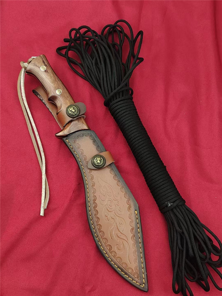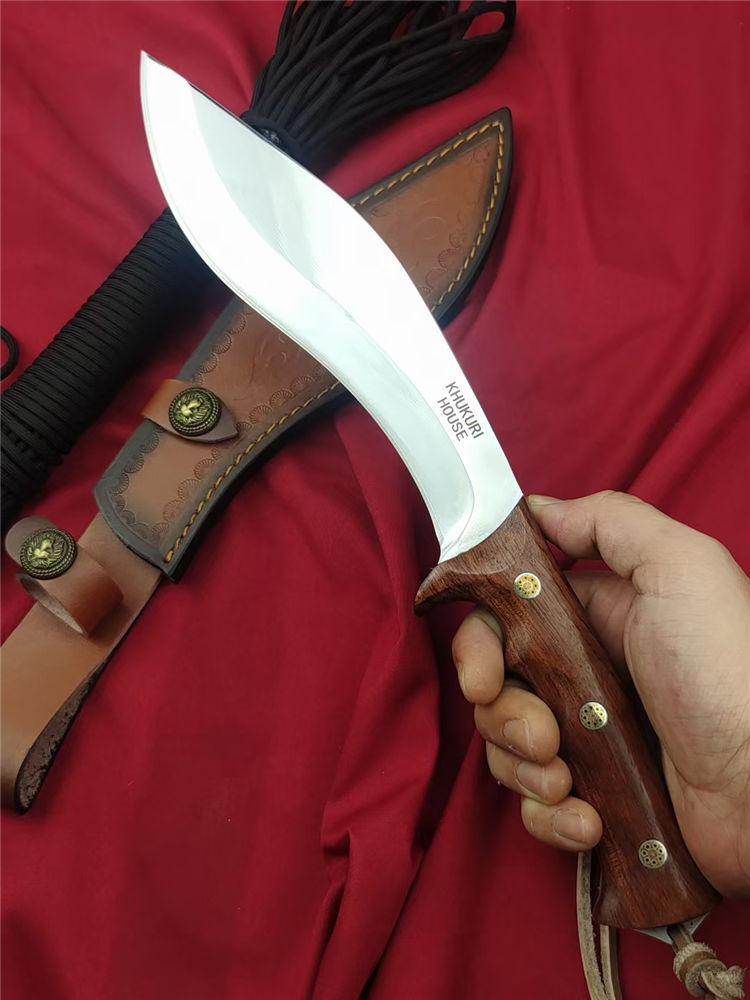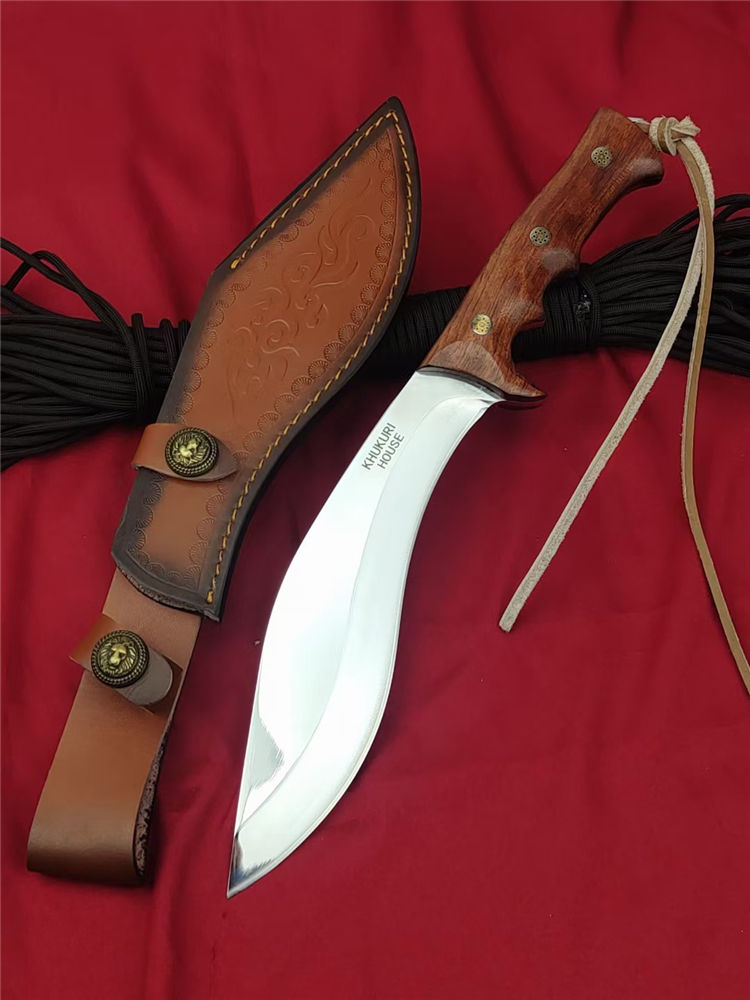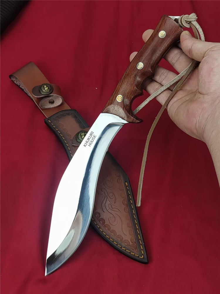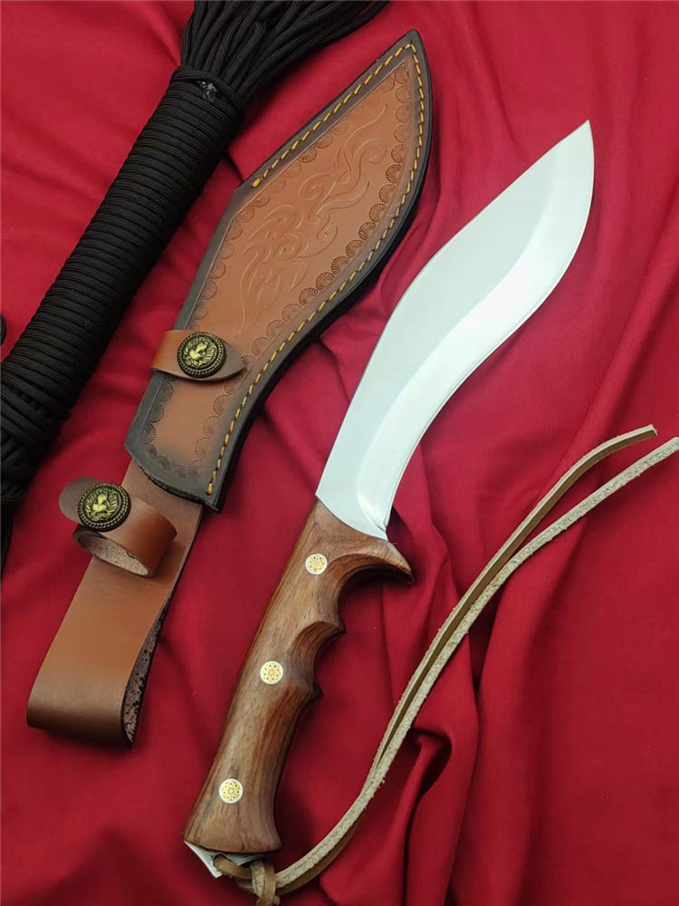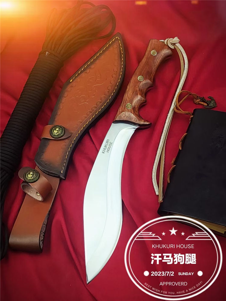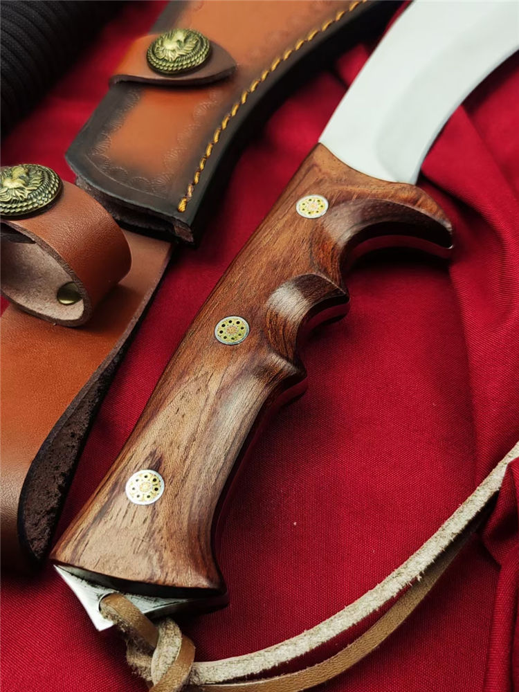 KH-汗马狗腿弯刀 全长:345mm 刃长:210mm开刃部分 柄长:140m 刃宽:46mm最宽处 刃厚:5.0mm 刃材:D2高速钢高温热处理 刀重:420g/513含鞘 硬度:59-60HRC 表面:超镜光抛光 柄材:进口非洲红檀木实木 结构:一体龙骨成型 配套:进口手工压花牛皮套 包装:盒子
