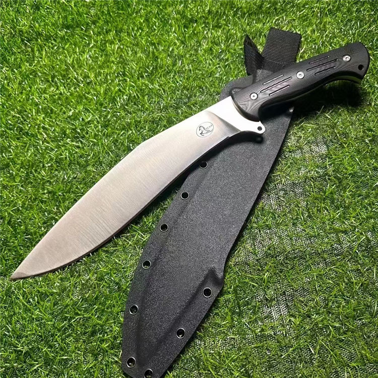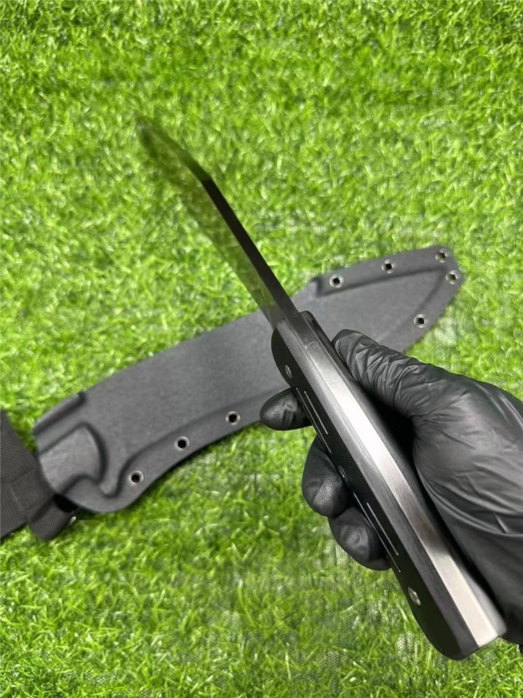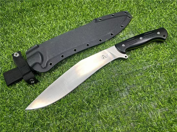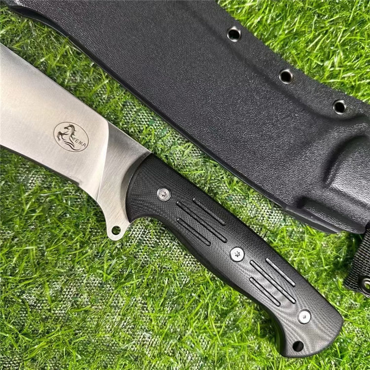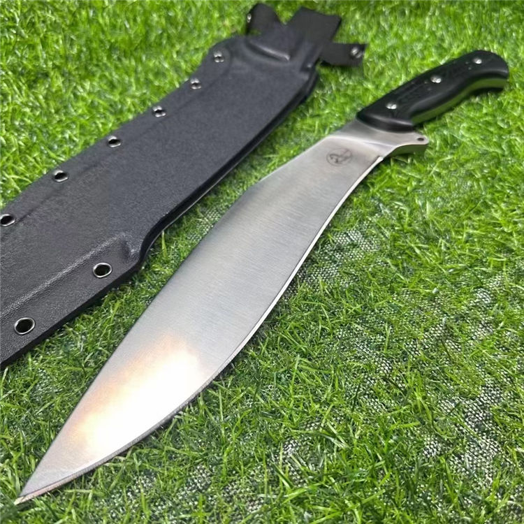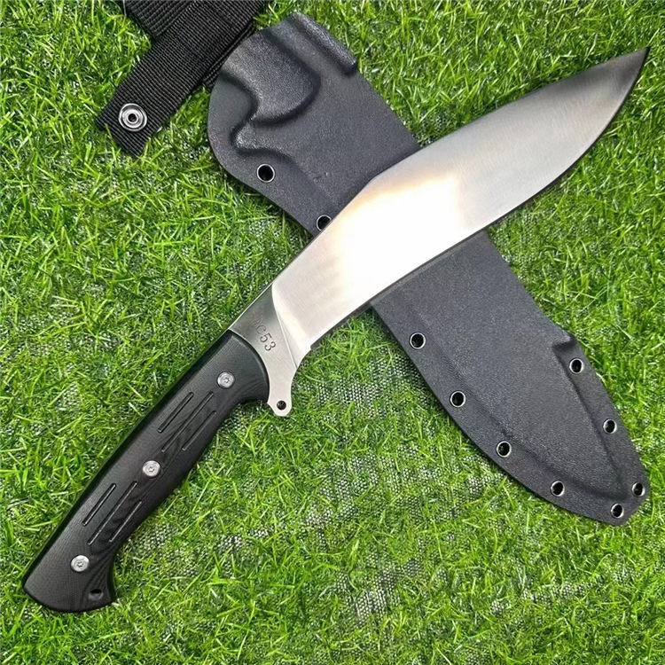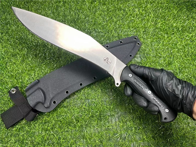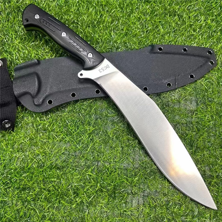 野马DC53钢狗腿弯刀 全长:420mm 刃长:270mm 刃宽:53mm 柄长:140mm 材料:DC53磨具钢(真材实料) 硬度:60HRC 厚度:6.5mm 表面:钢本砂光 手柄:黑色G10 柄体:cnc精细加工+数控v磨