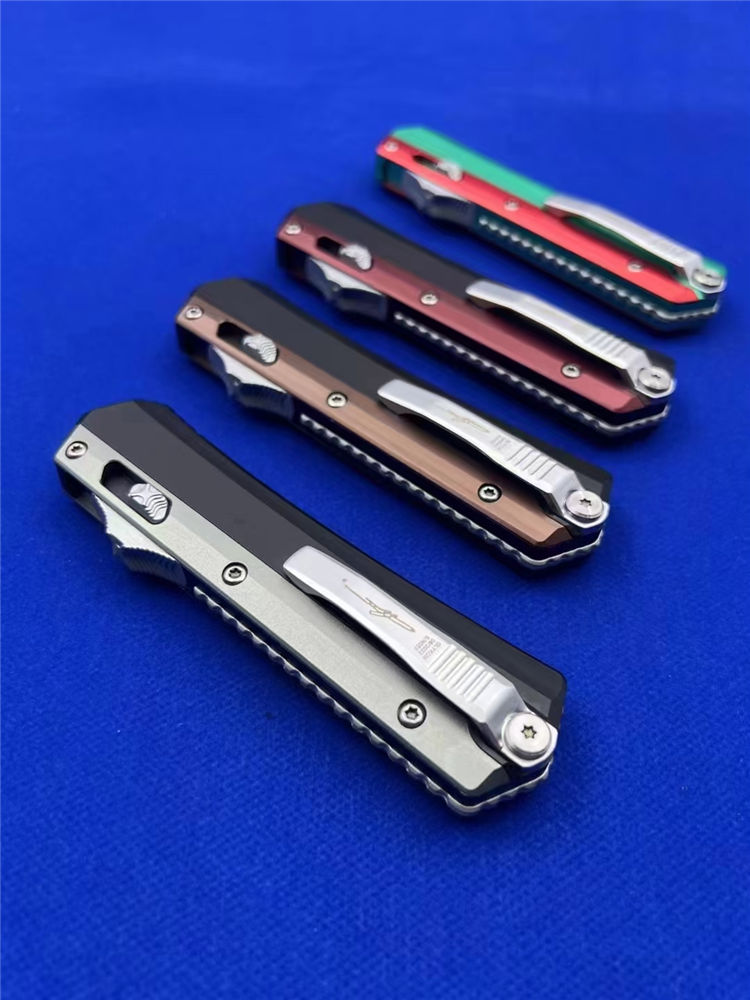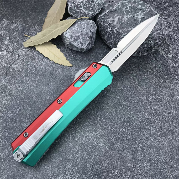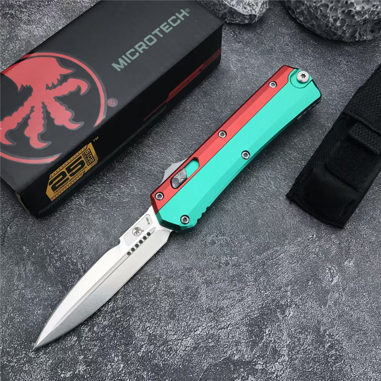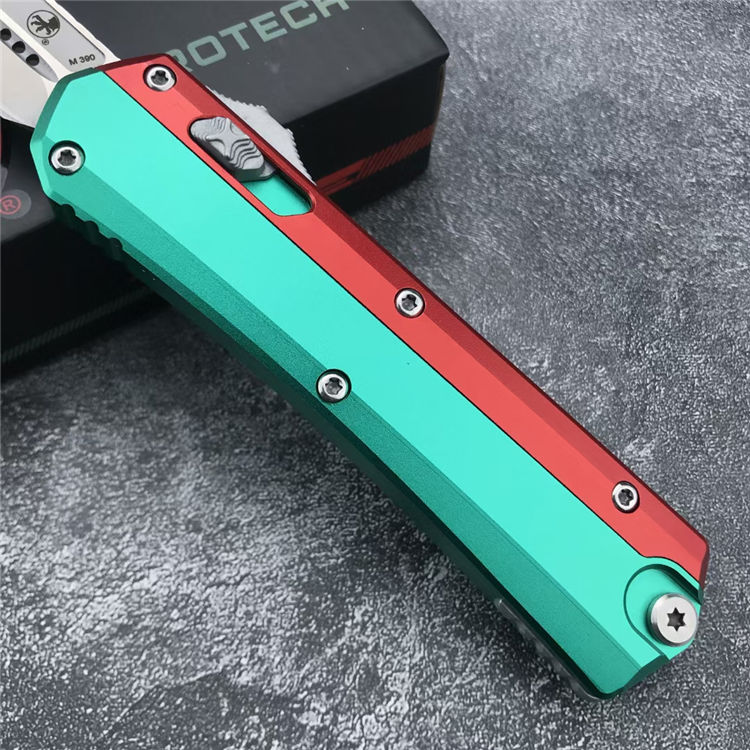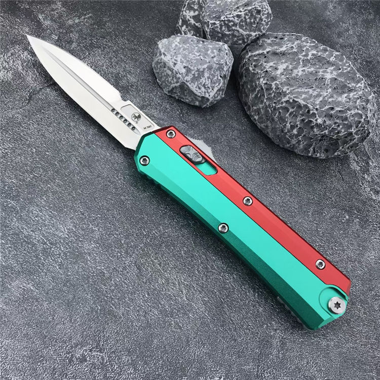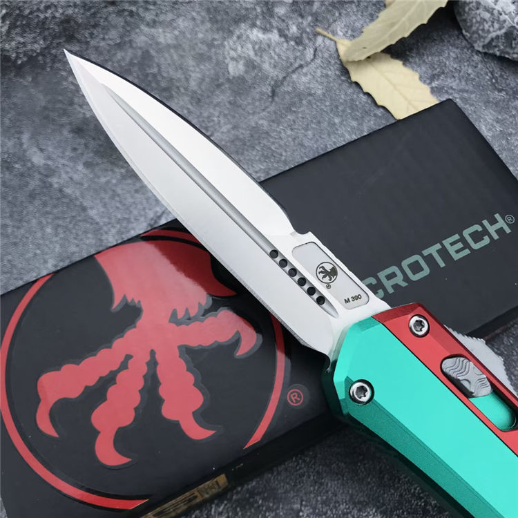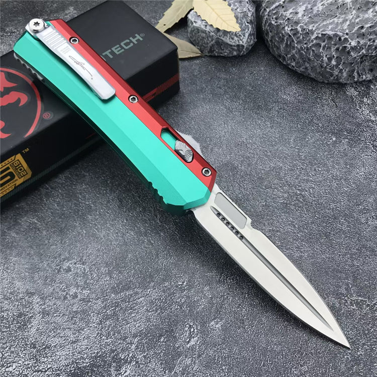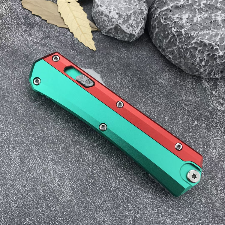 微技术绿红蛇王直出跳刀 总长:22.2CM 刃长:9.1 CM 刃宽:2 CM 刃厚:2.7MM 柄材:铝合金 刃材:D2 柄长:13.1CM 柄宽:30MM 柄厚:14.4MM 重量:155G