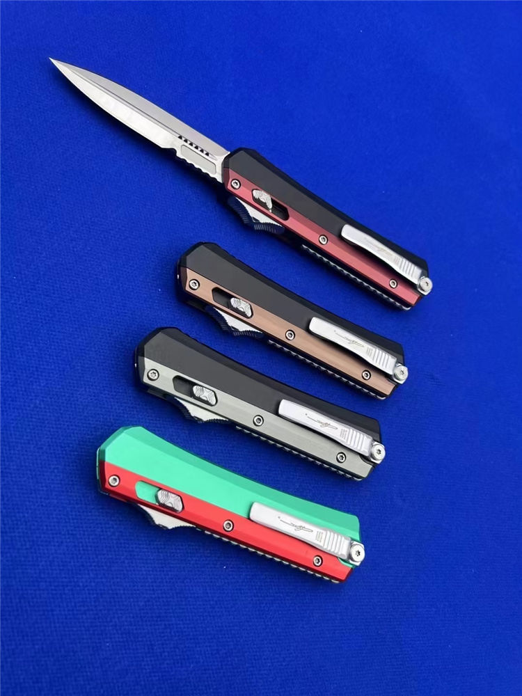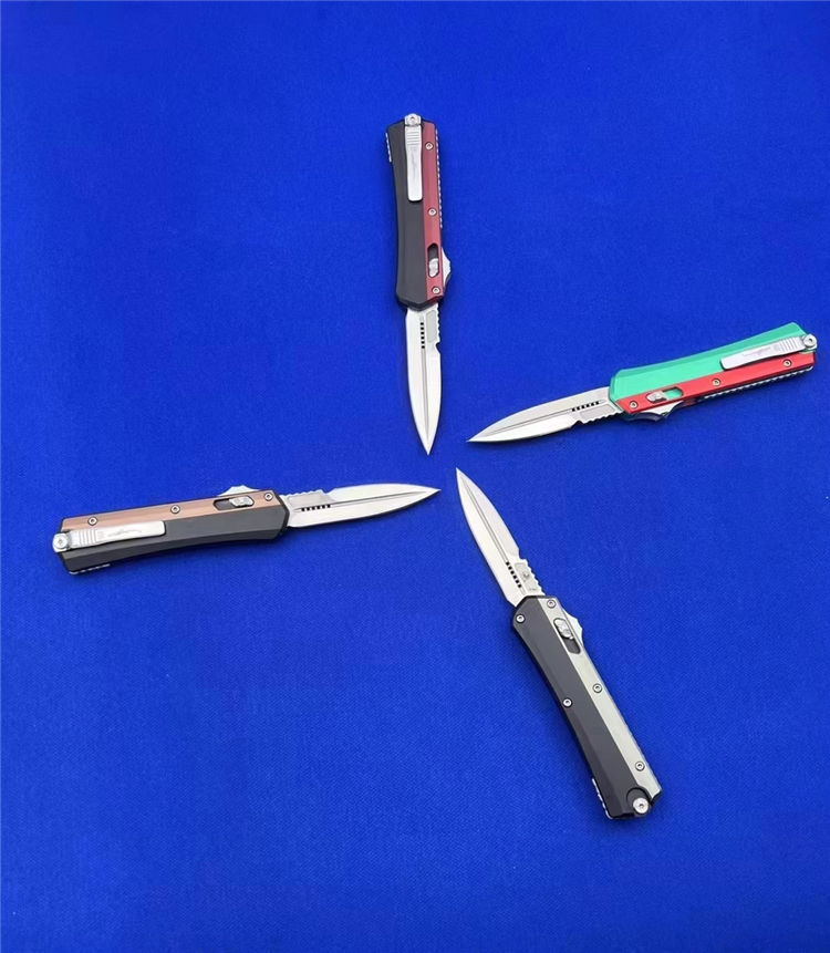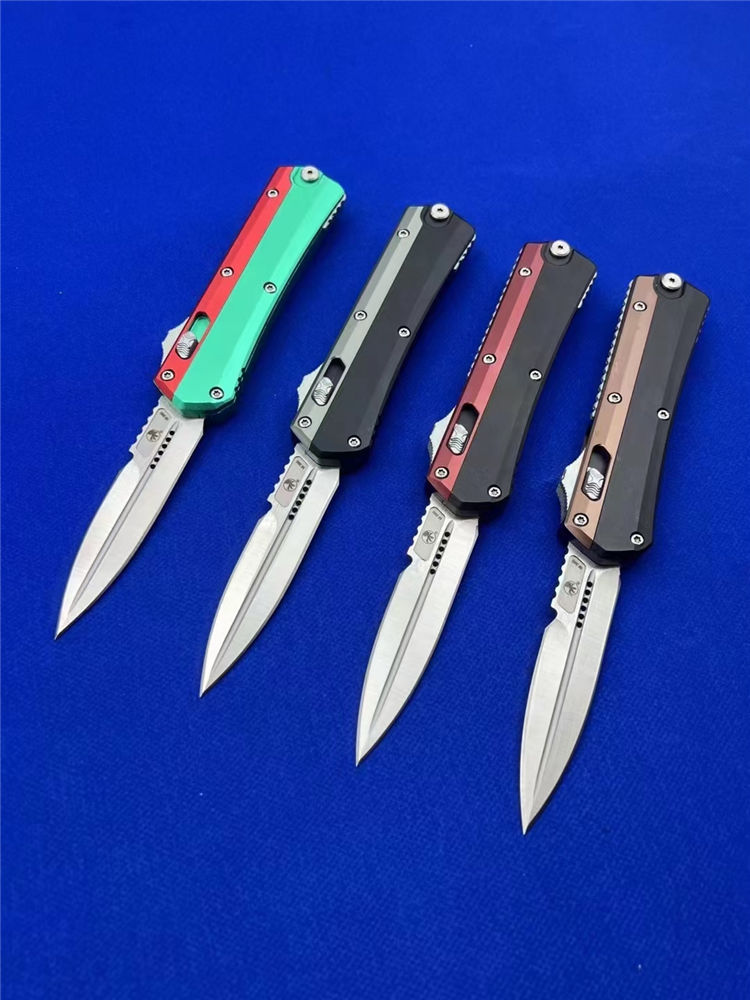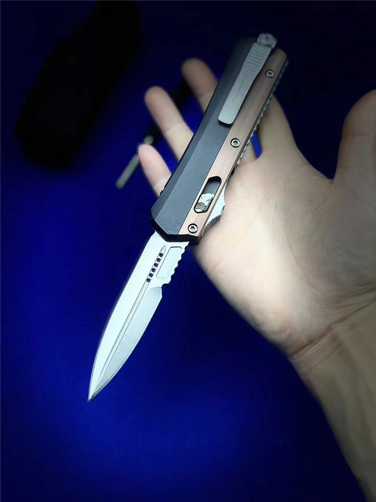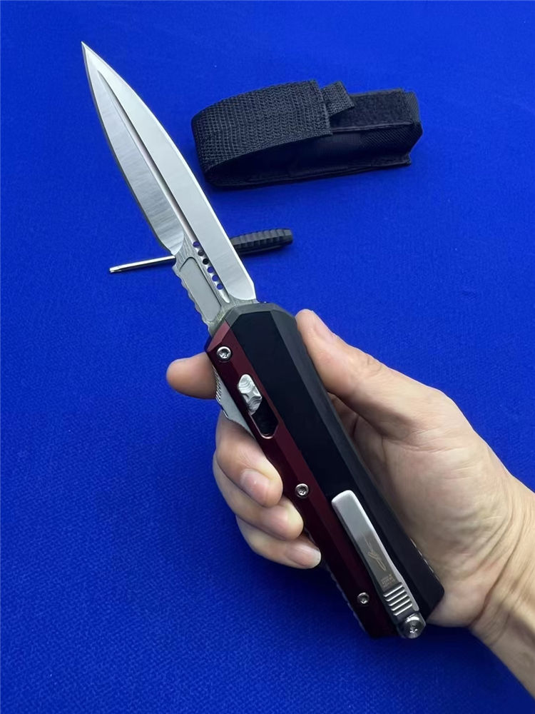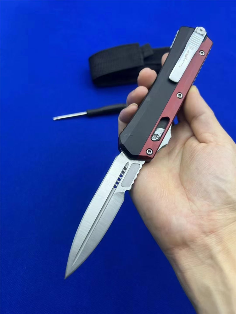 微技术绿红蛇王直出跳刀 总长:22.2CM 刃长:9.1 CM 刃宽:2 CM 刃厚:2.7MM 柄材:铝合金 刃材:D2 柄长:13.1CM 柄宽:30MM 柄厚:14.4MM 重量:155G