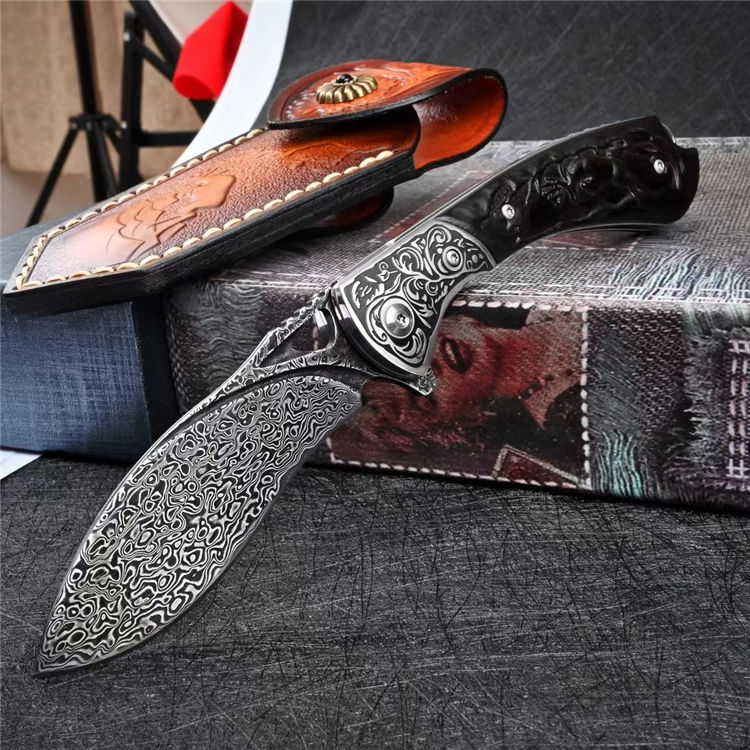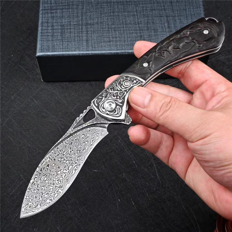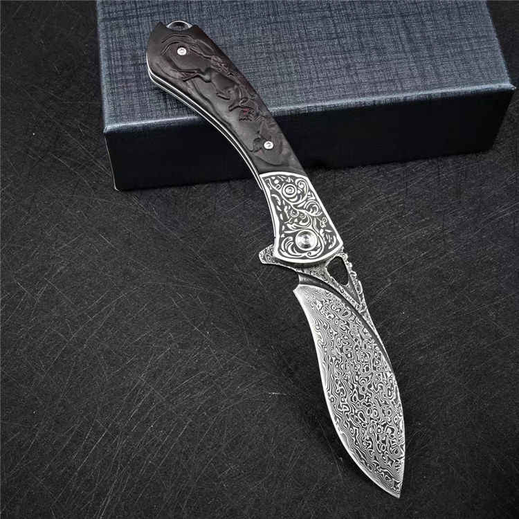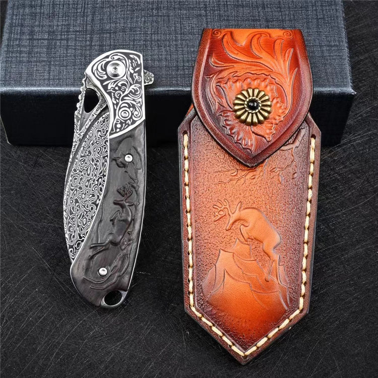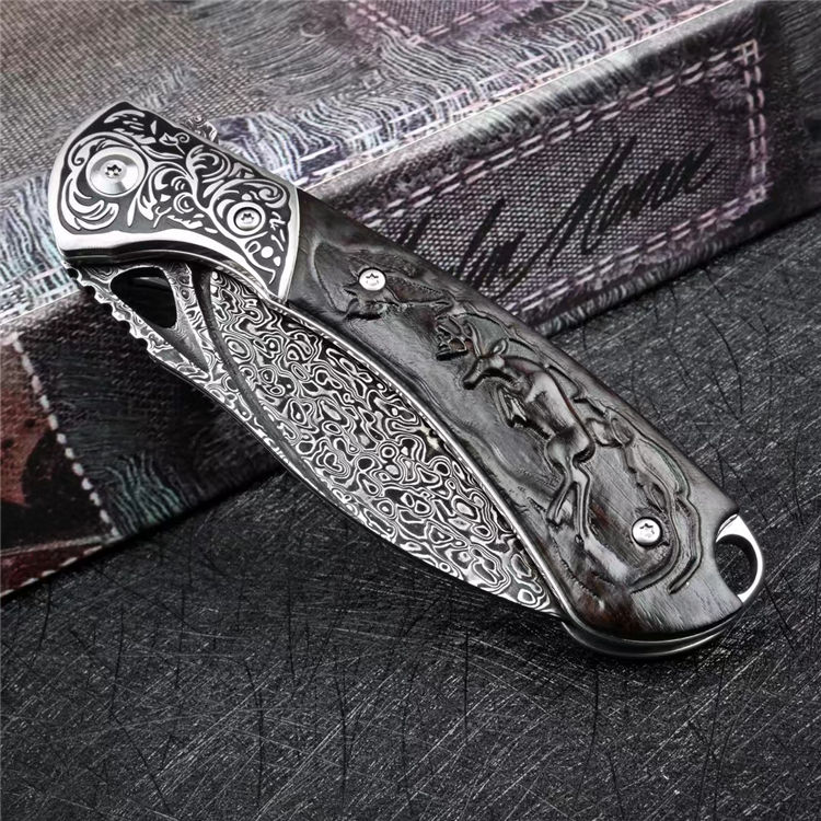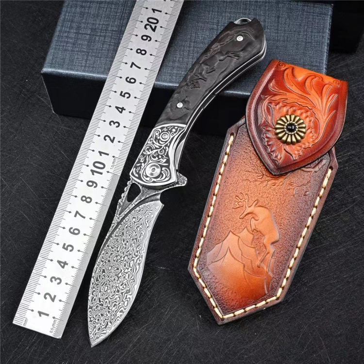 大马士革梅花鹿折刀 全长:21.4cm 刃长:8.7cm 柄长:12.1cm 刃厚:0.28cm 刃宽:2.8cm 刀重:180g 毛重:337g 钢材:VG10大马士革 柄材:不锈钢雕花+黑檀雕刻 硬度:60-61HRC 表面:大马士革纹 包装:高端礼品盒