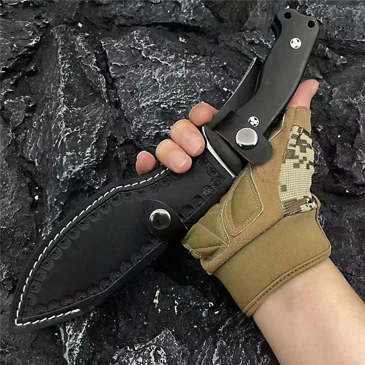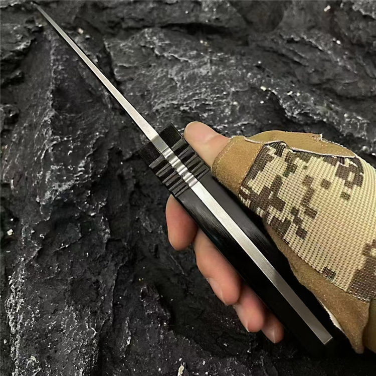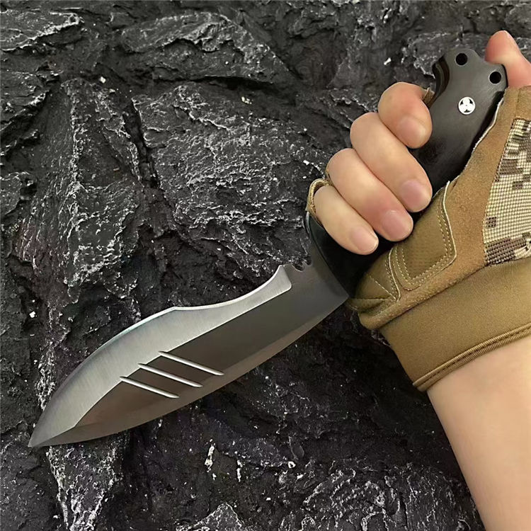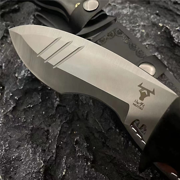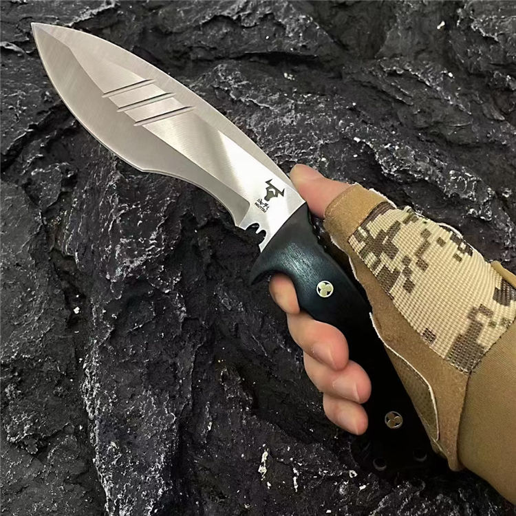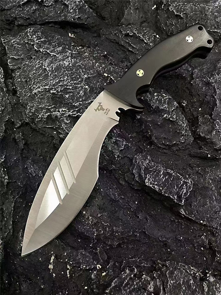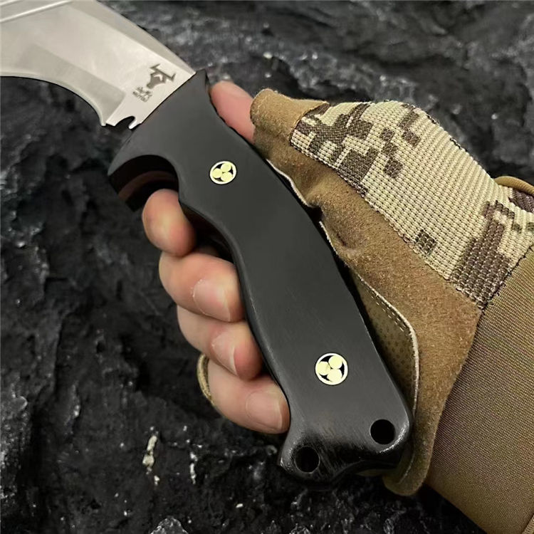 蛮牛狗腿弯刀 全长:285mm 刃长:170mm 刃宽:47mm最宽处 刃厚:5mm 刀重:342.5g(带套396g) 硬度:60+HRC 表面:刃口拉丝+CNC电脑锣 柄材:黑檀木+三花铜铆钉加固 结构:一体龙骨成型 配套:皮套+礼盒