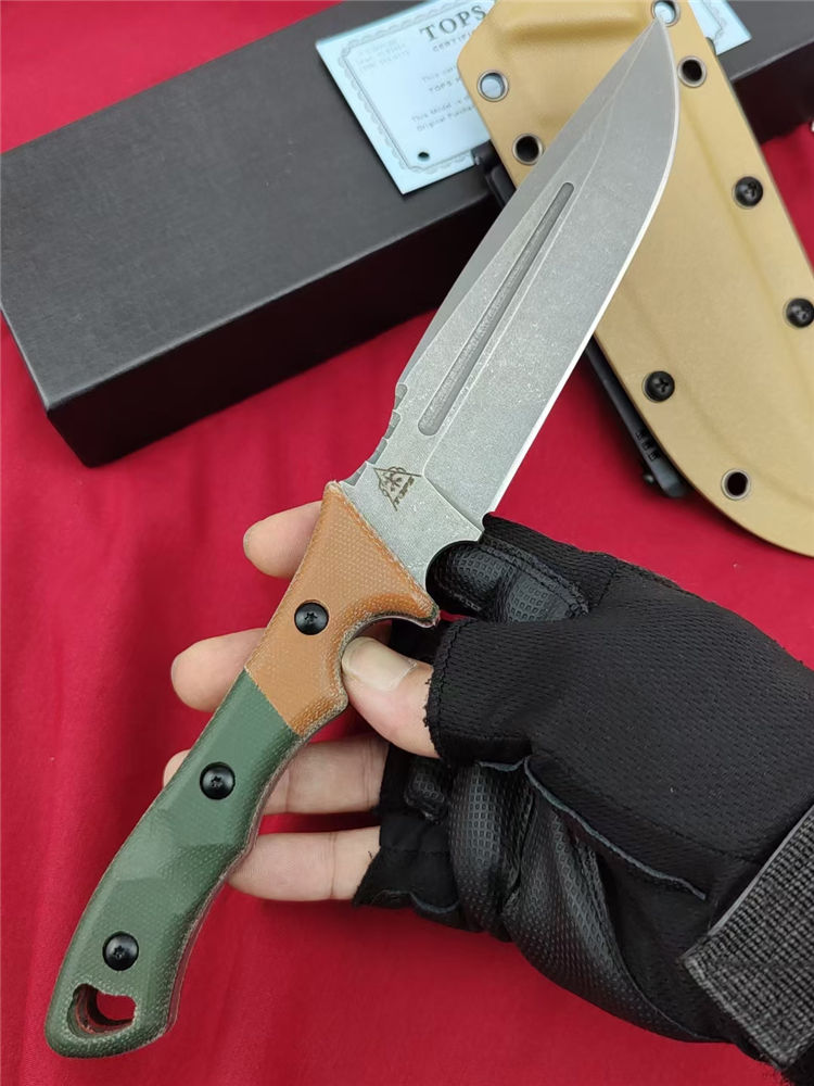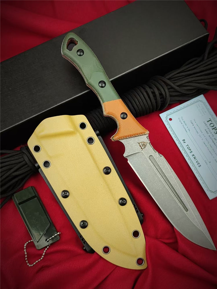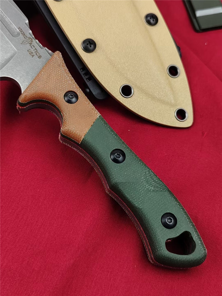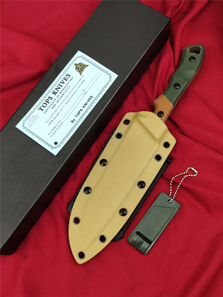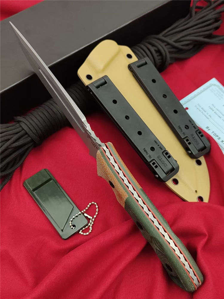 美国TOPS维京海盗直刀 全长:29.5cm 刃长:15.2cm 柄长:14cm 钢材:1095HCA高碳钢 硬度:58-59HRC 表面:酸洗处理 手柄:双色帆布米卡塔 刃厚:0.48 cm 重量:290克 护套夹:Molle-Lok 多动能腰挂 设计师:凯尔兰普(Kyle Lamb)1095高碳钢,战术K鞘