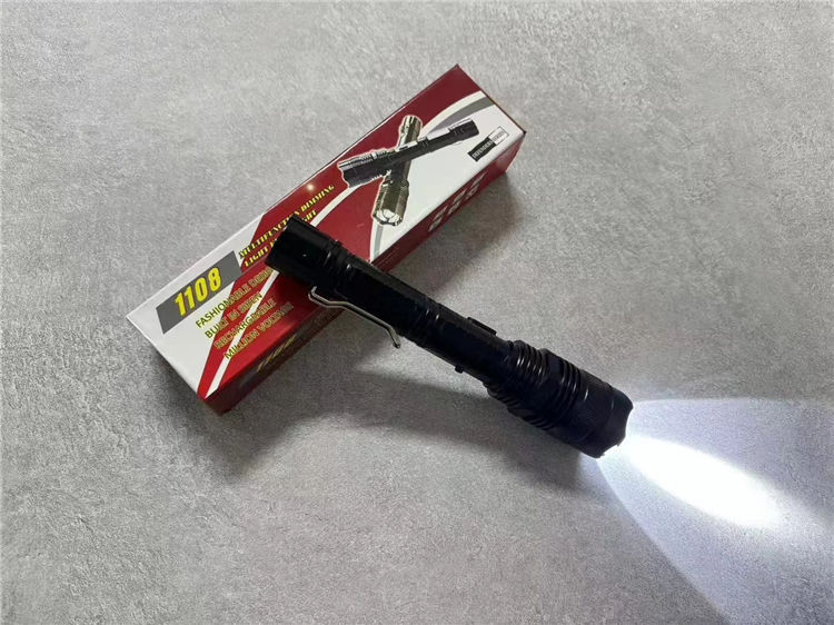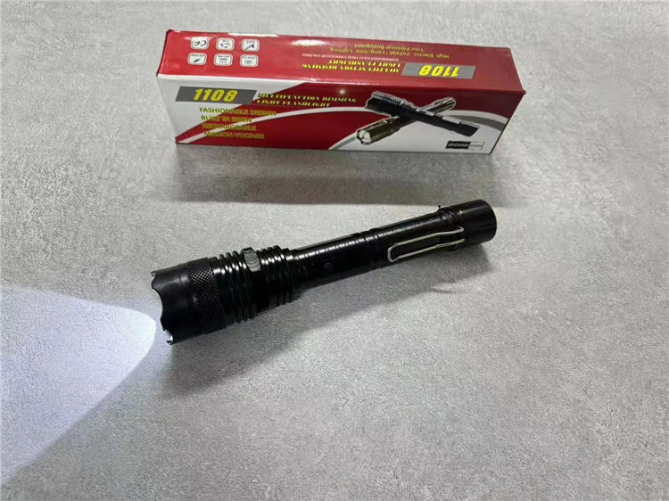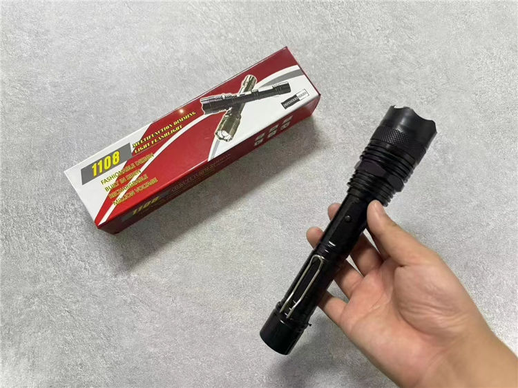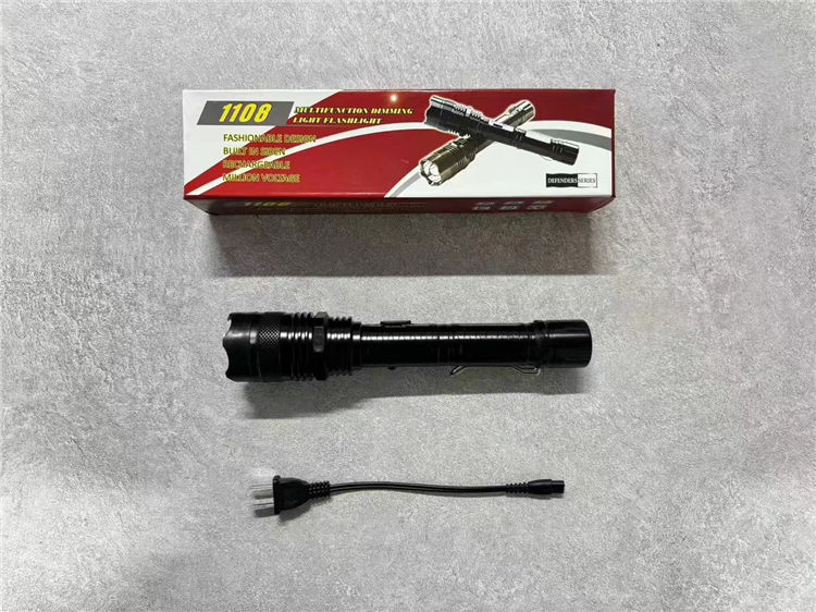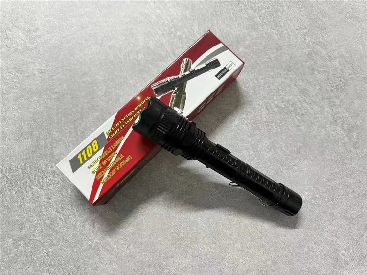 1108手电电棍 特点: 1、采用航空钛合金外壳,高频振荡电流,高强度输出电流,大容量直流放电,输出能力巨大; 2、采用现役强光照明灯,强光爆闪,三档照明,强光、弱光、闪光,超亮、省电、节能、环保,既亮且照明时间长 3、采用内置式充电器,外观小巧,携带方便; 4、该产品外形独特,设计精美,是居家外出、防身自卫的理想佳品。 5、峰值电压:3-5万伏 6、尺寸:长243mm×头部直径45mm×筒身直径33mm 7、重量:335克