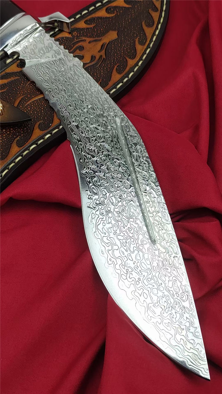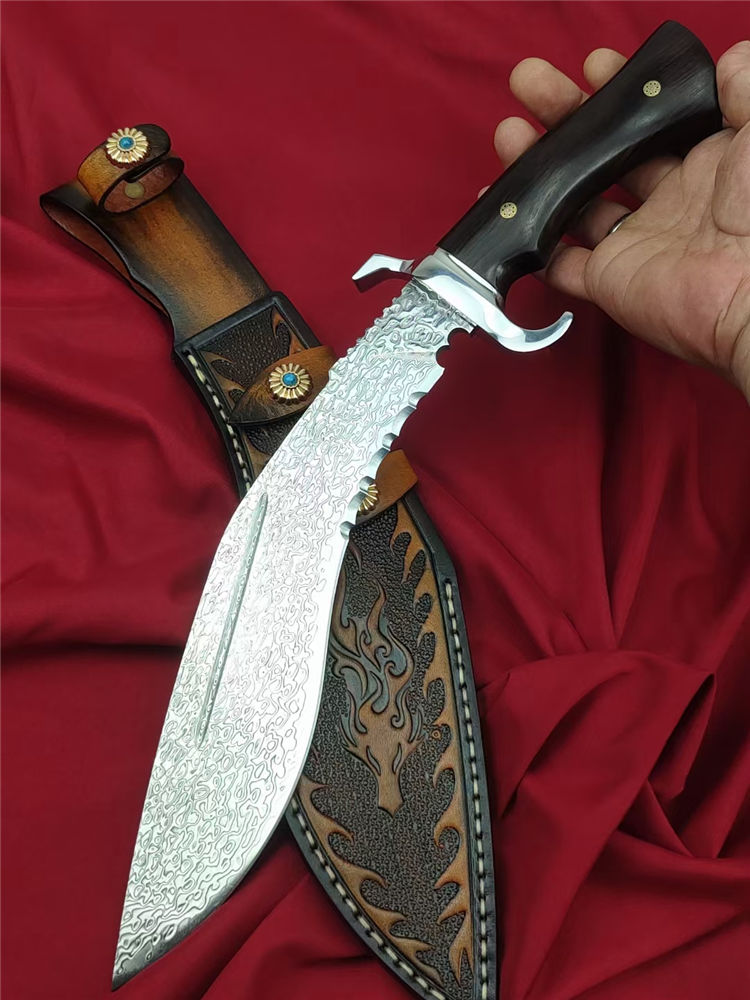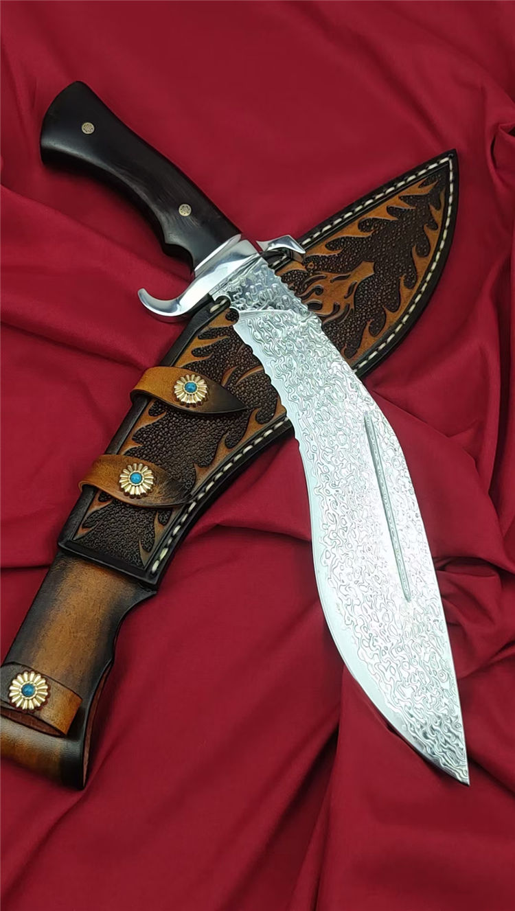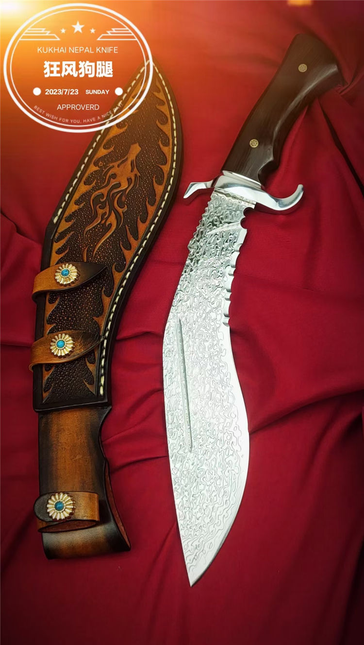 大马士革狂风狗腿弯刀 全长:395mm 刃长:245m开刃部分 柄长:135mm 刃宽:52mm最宽处 刃厚:4.8mm 刃材:107层进口VG10大马士革 刀重:448g/561含鞘 毛重:803g 硬度:60+HRC 表面:超镜光大马士革祥云原纹 柄材:老树黑檀实木手柄+钢护手 结构:一体龙骨成型 配套:进口压花手工精美牛皮套