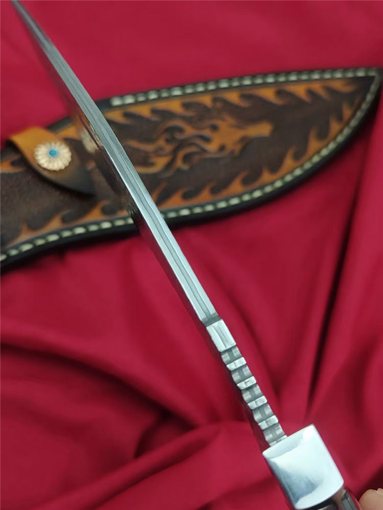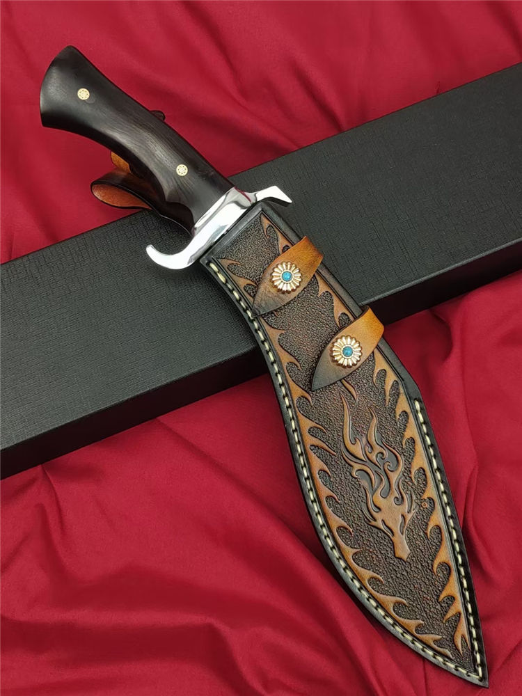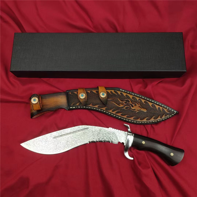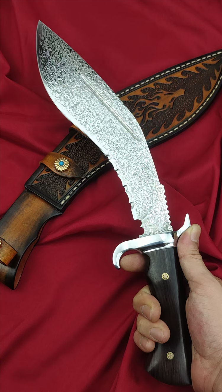 大马士革狂风狗腿弯刀 全长:395mm 刃长:245m开刃部分 柄长:135mm 刃宽:52mm最宽处 刃厚:4.8mm 刃材:107层进口VG10大马士革 刀重:448g/561含鞘 毛重:803g 硬度:60+HRC 表面:超镜光大马士革祥云原纹 柄材:老树黑檀实木手柄+钢护手 结构:一体龙骨成型 配套:进口压花手工精美牛皮套