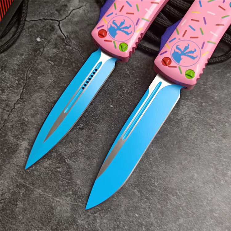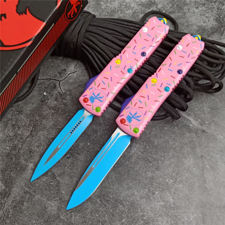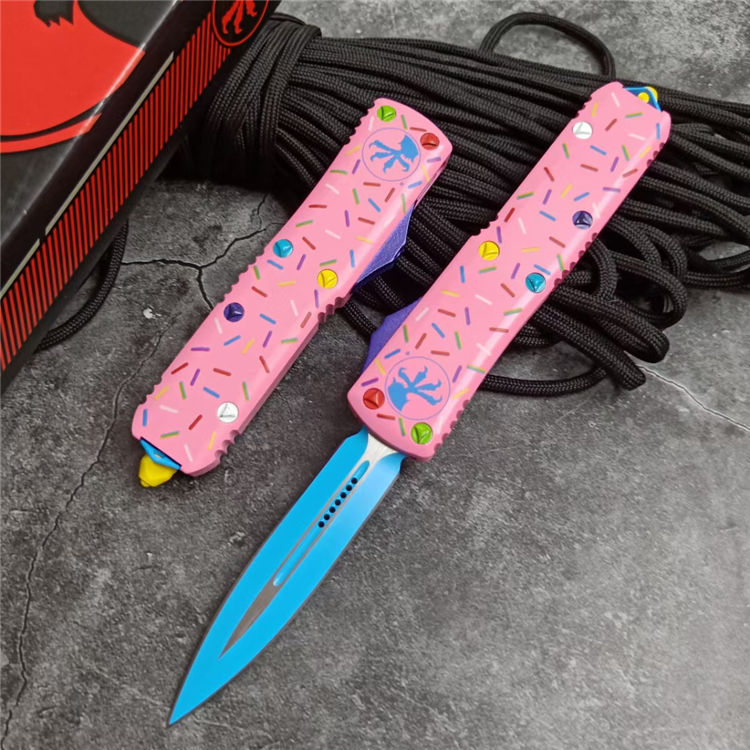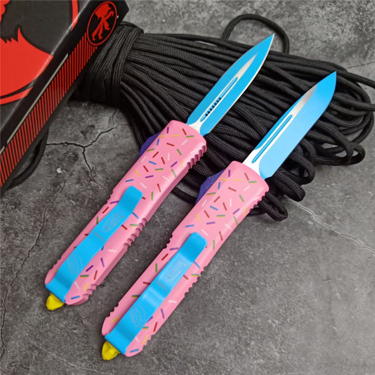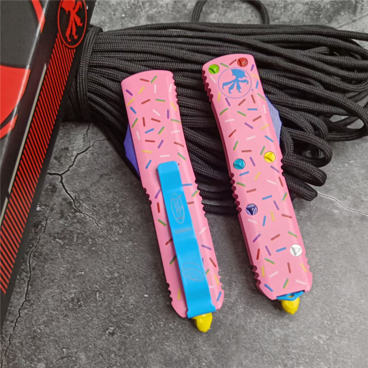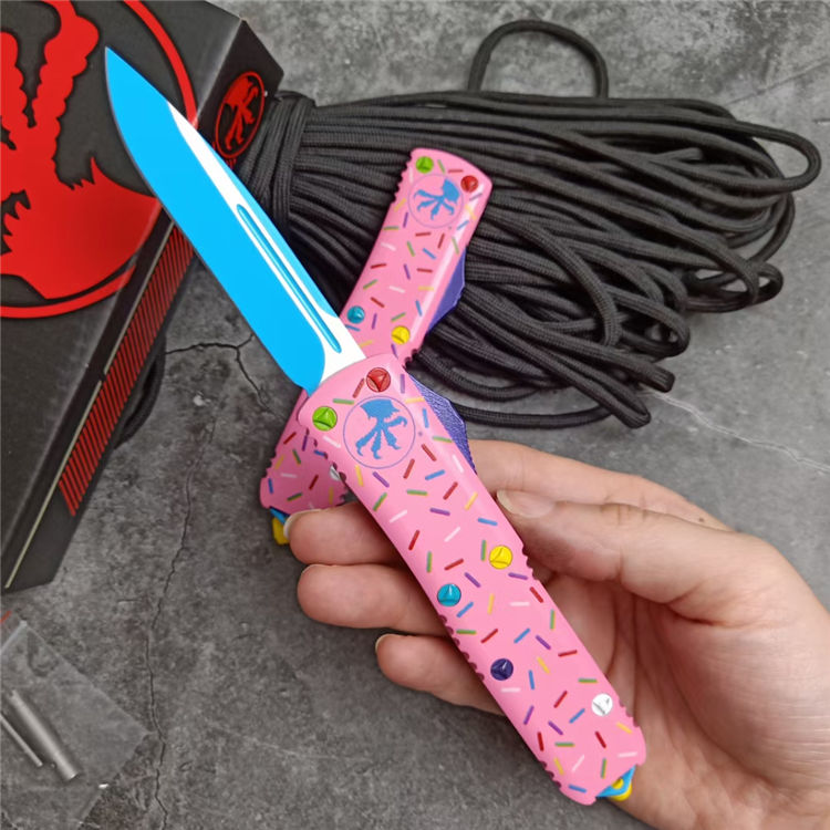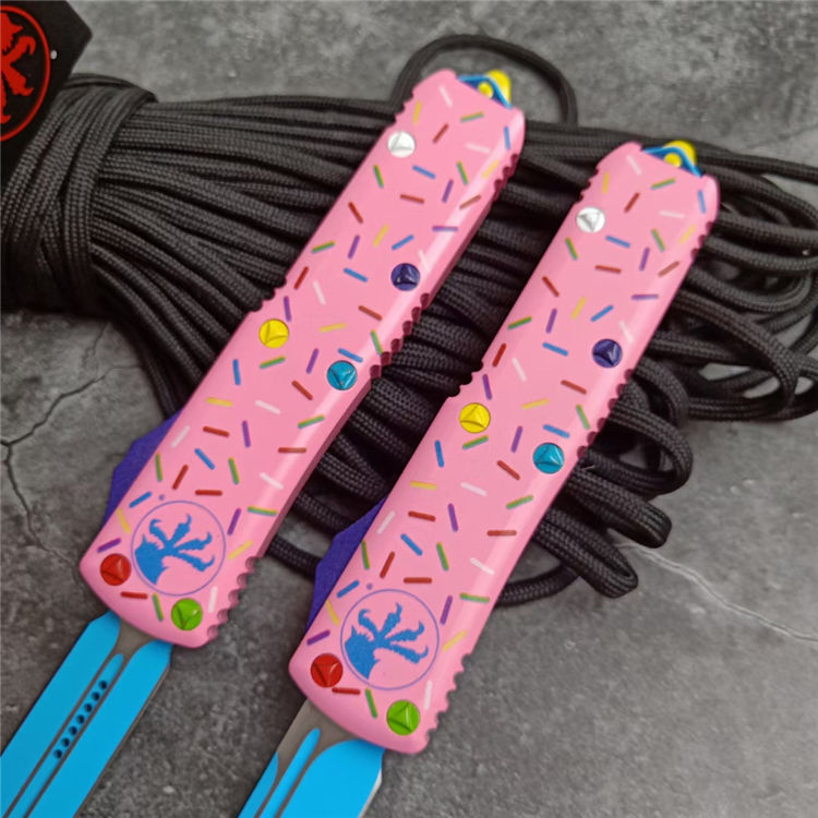 复刻版微技术TU85甜甜圈中号直出跳刀 全长:20CM 刃长:8CM 柄长:12CM 刃宽:1.6CM 刃厚:0.32CM 刃材:5CR13 柄材:铝合金三D打印图案 刀型:直跳 锁定:按钮锁 刀重:95克 重量:163克(含包装) 附件:尼龙套,彩盒,送拆刀工具 整刀用CNC,电脑锣,线切割制作而成,手工,精密度非常高,很值得收藏的一把刀,数量有限