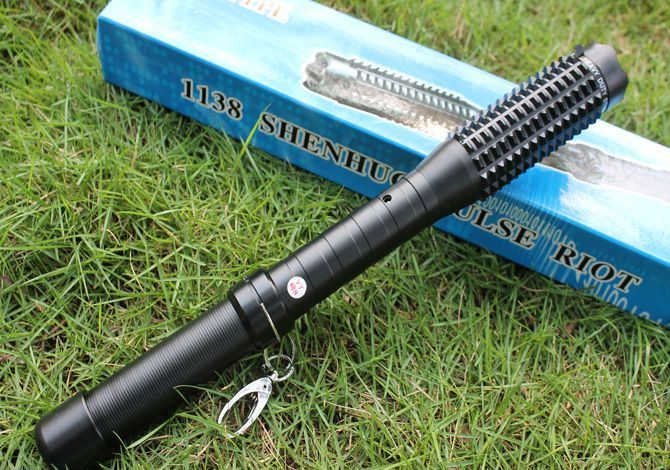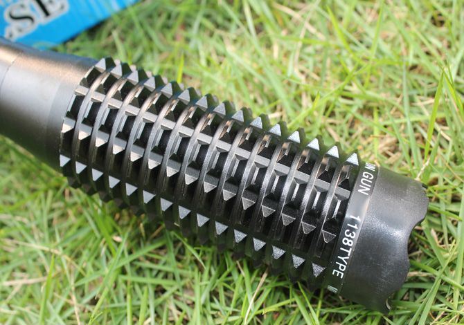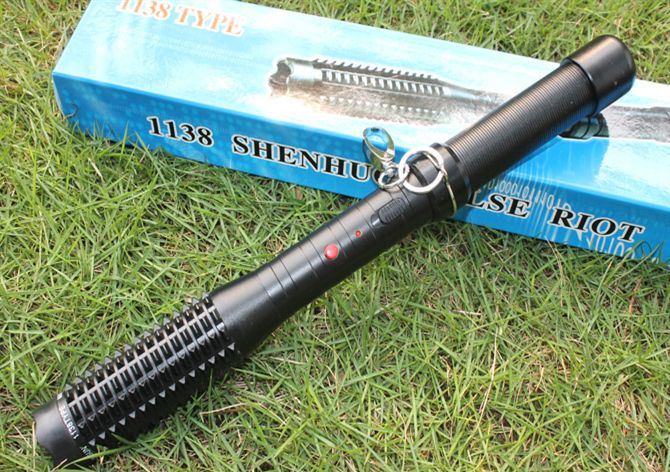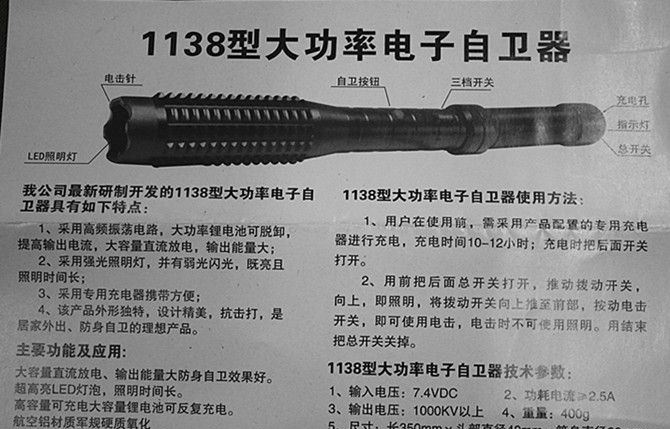 1138合金型狼牙棒电棍 1、采用高硬度轻质版航空铝合金外壳设计 2、进口3W强光灯,照明亮度超过300流明,远射距离250米 3、采用进口18650电池,电池仓脱卸设计,电池可以取出充电,电池使用时间待机1个月 4、采用高压模块可瞬间 电压280万伏 5、国家安保部门定制,安全尺寸全长:32厘米,净重;400克,配有金属钥匙扣,袖带方便,是巡逻执勤必配物品 6、棍身头部狼牙部分为橡胶物,重击对人体无重大伤害,手柄握把采用橡胶物防滑设计,是理想的防身武器