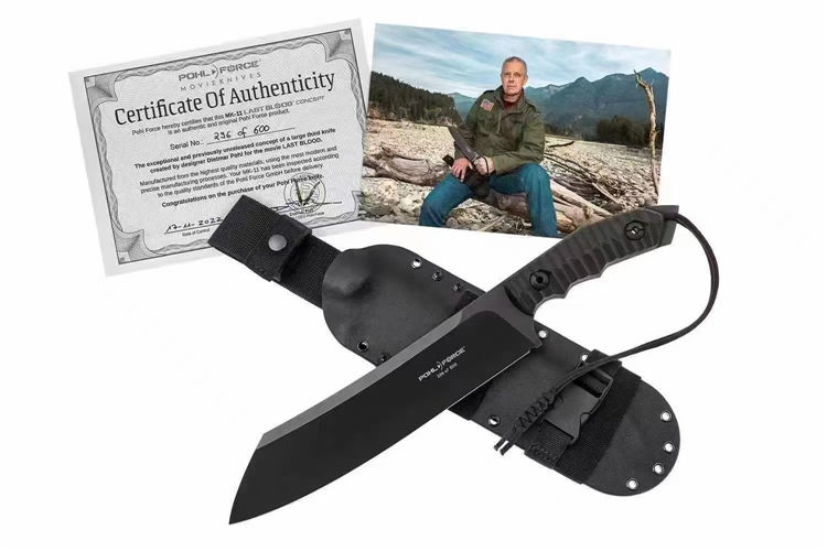 波尔武力MK11直刀 总长:37cm 刃长:26cm 厚度:6毫米 重量:600克 材质:德国CPM-D2 刃面:PVD涂层 硬度:62HRC 柄材:G-10数控大V磨 附件:收纳刀包+产品证书+产品手册+黑色礼盒 护套:Kydex护套,K鞘内置牛绒静音保护刀刃涂层,带腰带适配器和两条腿带