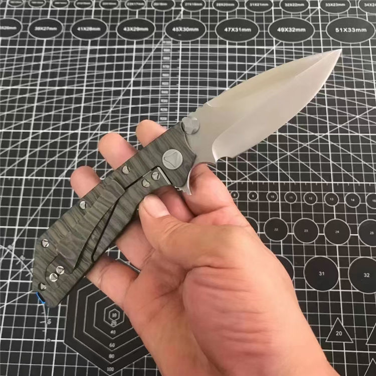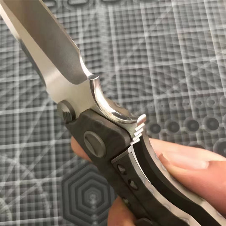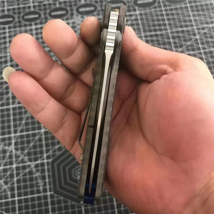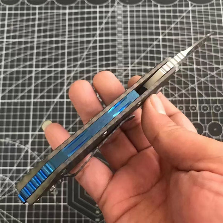 微技术死亡接触钛柄折刀 全长:228mm 刃长:96mm 柄长:130mm 刃宽:36mm 刃厚:5.0mm 刃材:D2(深冷处理) 重量:260g 硬度:59-60HRC 表面:拉丝 柄材:手柄全TC4钛合金+火烧纹、底骨TC4钛合金蓝色阳极电镀处理 刀夹:TC4钛合金 螺丝:所有螺丝420不锈钢、硬度HRC45、全CNC精雕加工 结构:陶瓷定位珠、内置平面滚针轴承垫片 其他:配彩盒包装