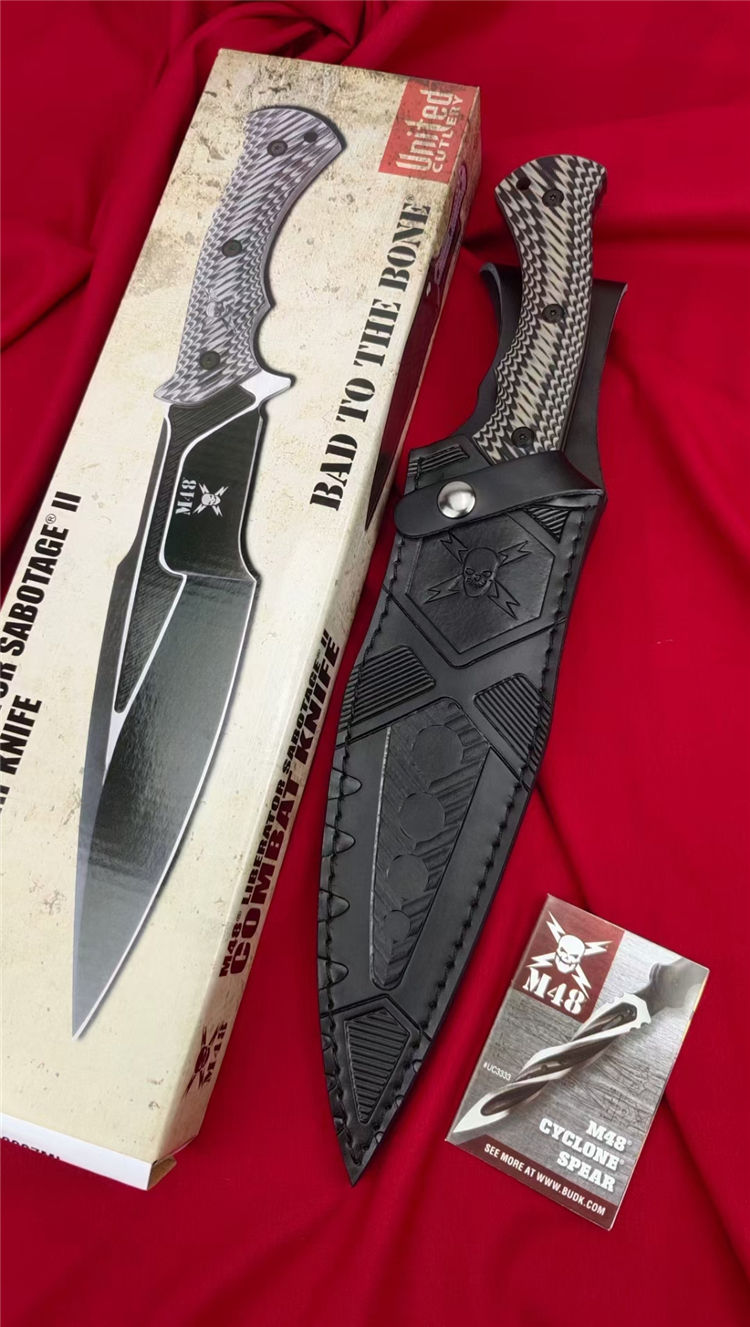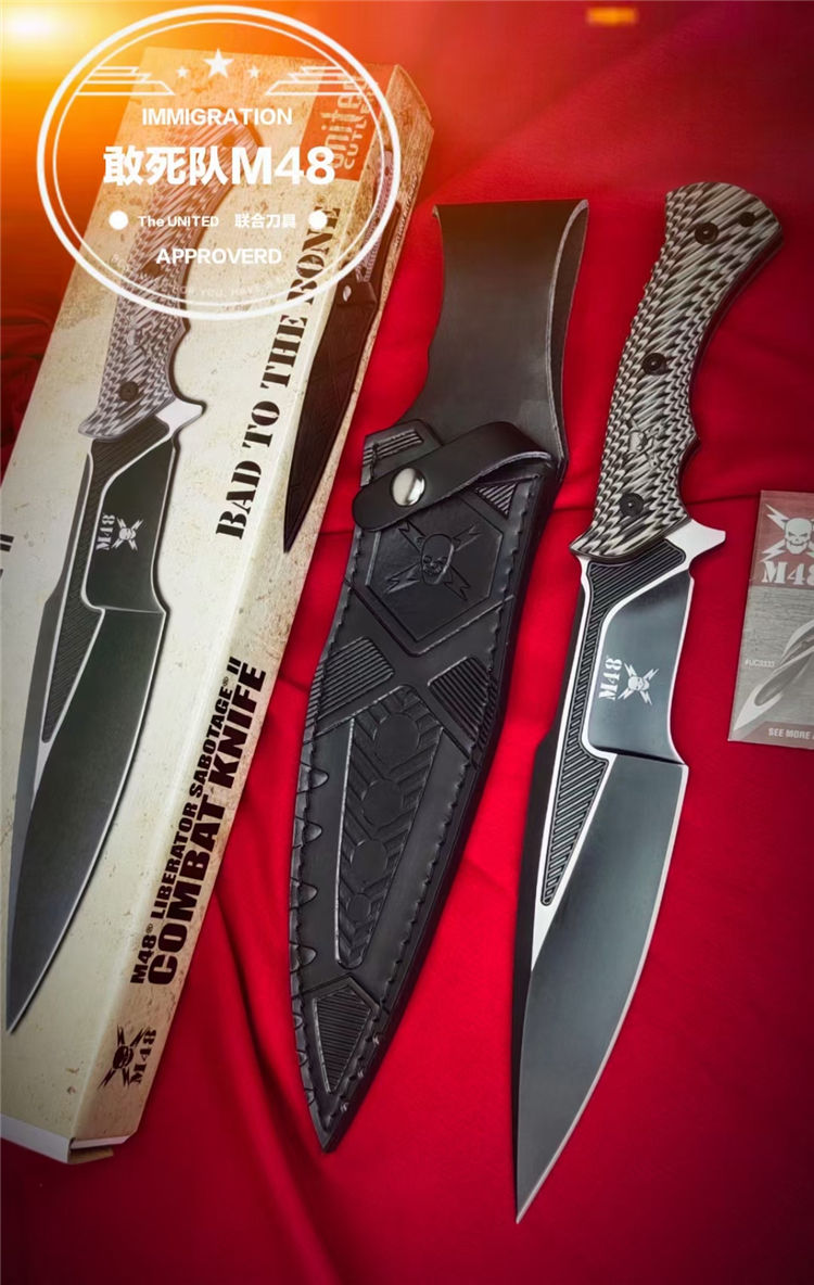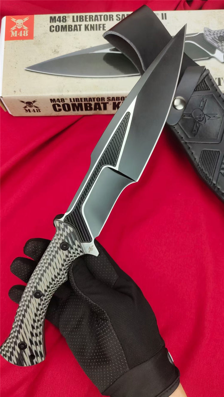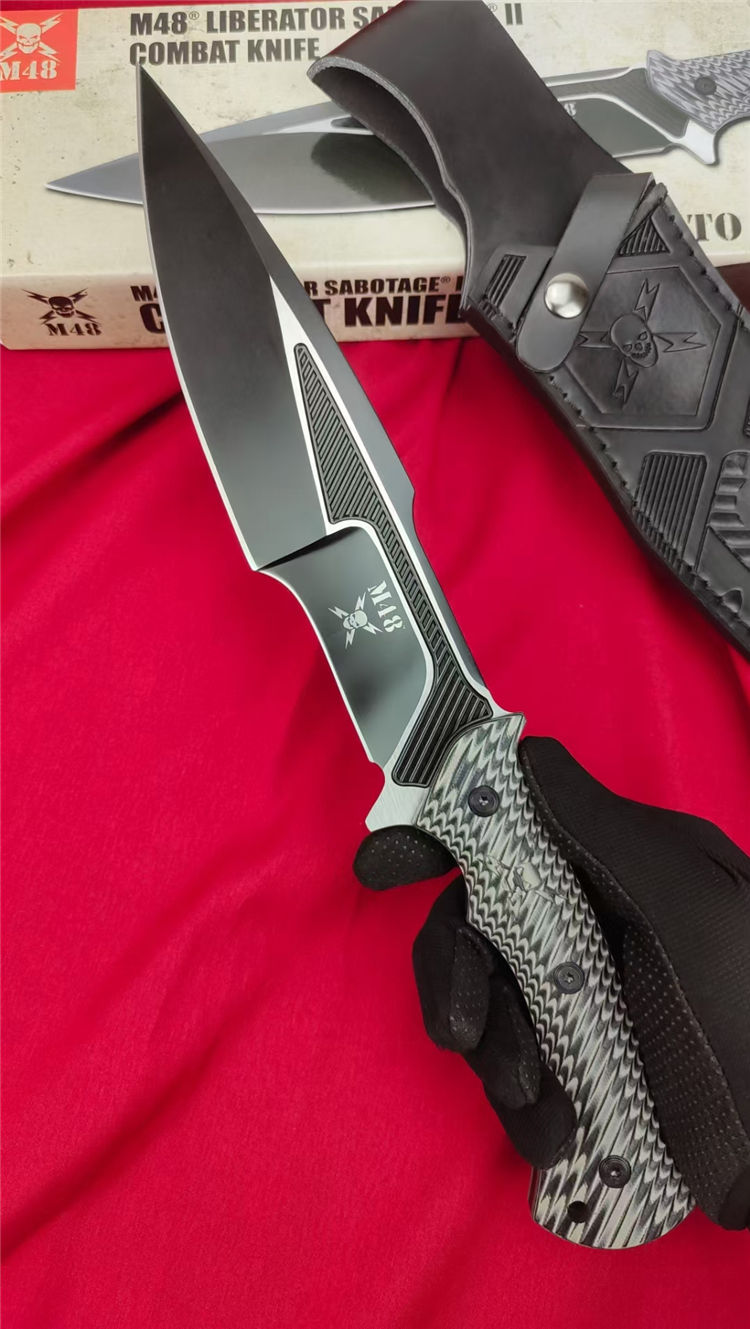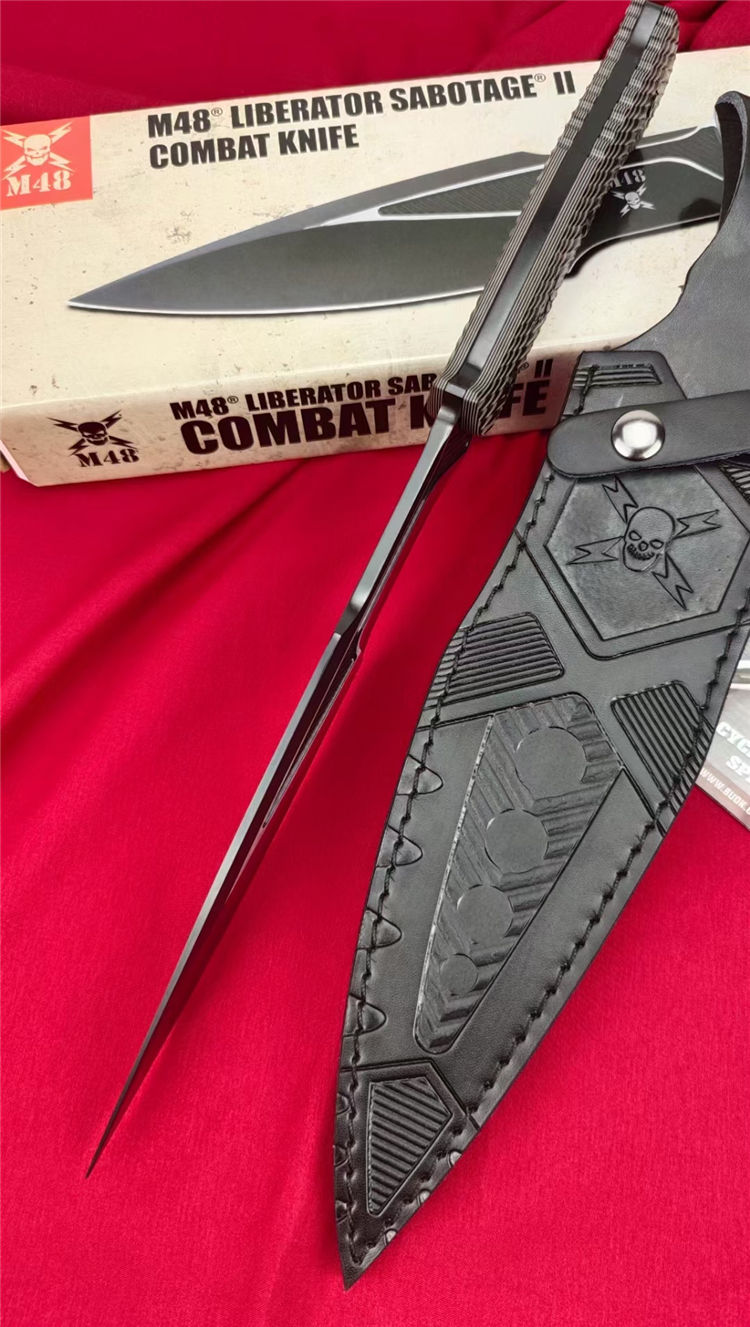 敢死队M48直刀 全长:375mm 刃长:230mm 柄长:145m 刃宽:55mm最宽处 刃厚:5.6mm 刃材:7Cr13 刀重:489g/600g含K鞘 毛重:771g(含包装盒) 硬度:56-58HRC 表面:纳米氧化黑钛+CNC精密加工 柄材:进口增强双色尼龙玻纤 配套:压花手工加厚皮套 包装:原装联合正品出口彩盒