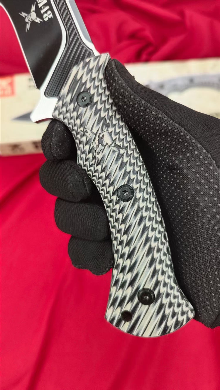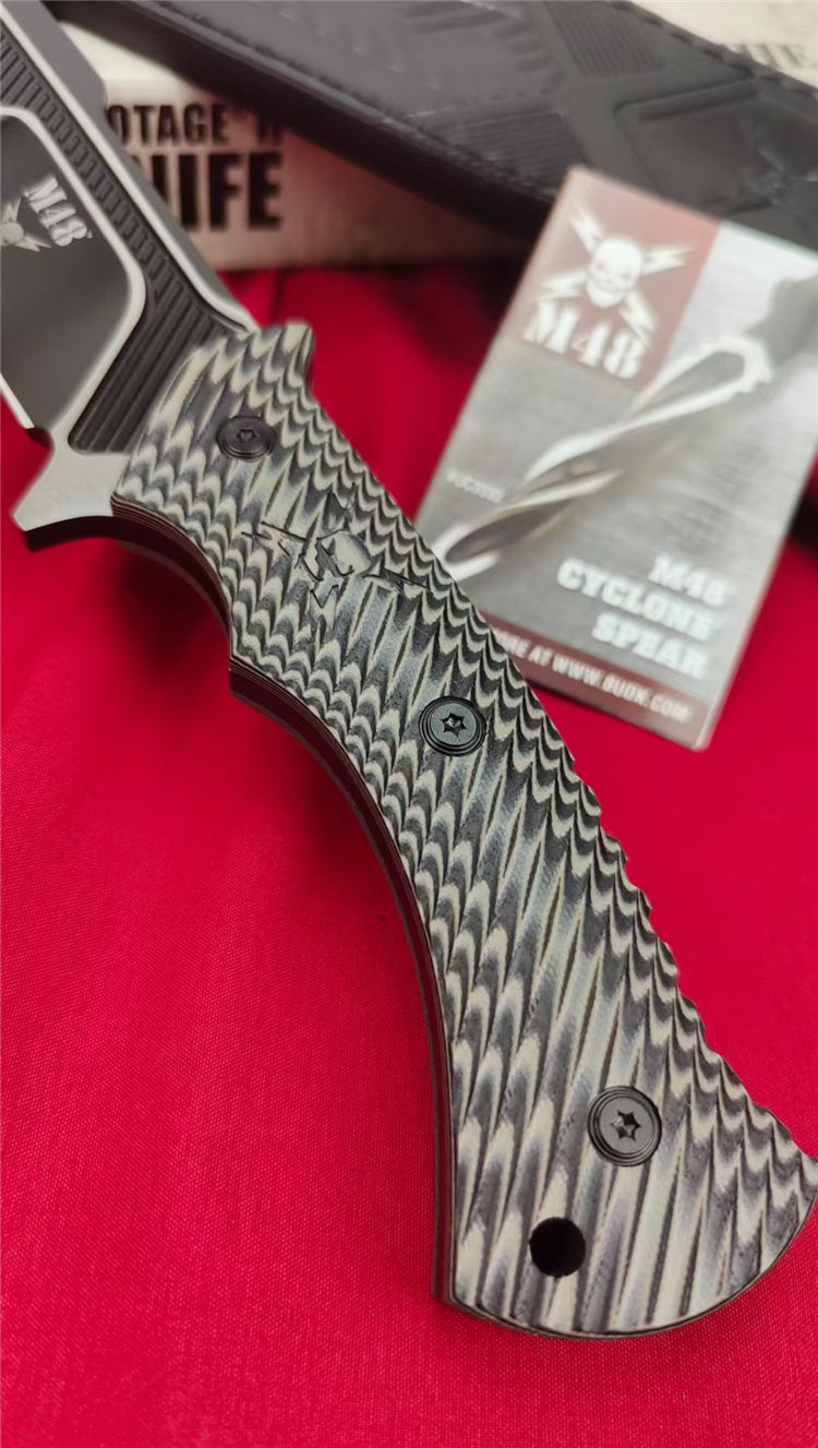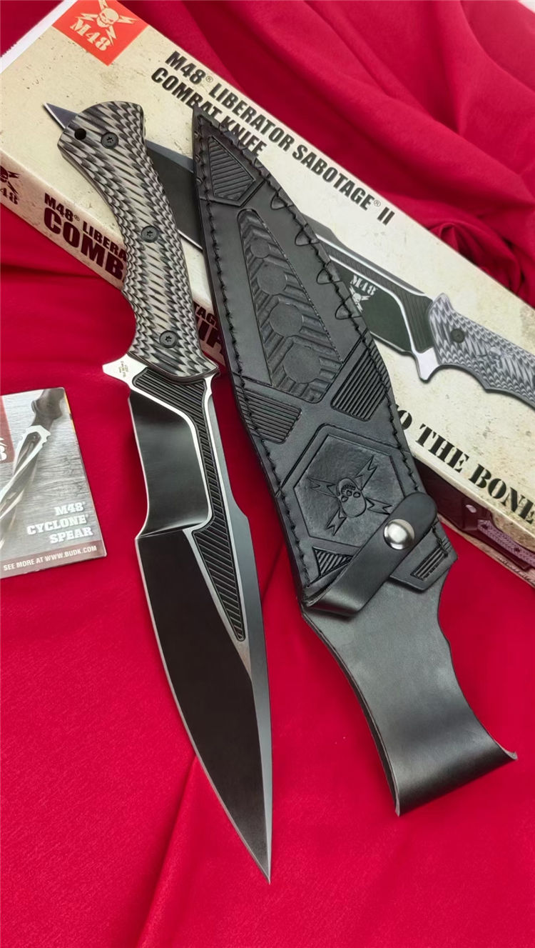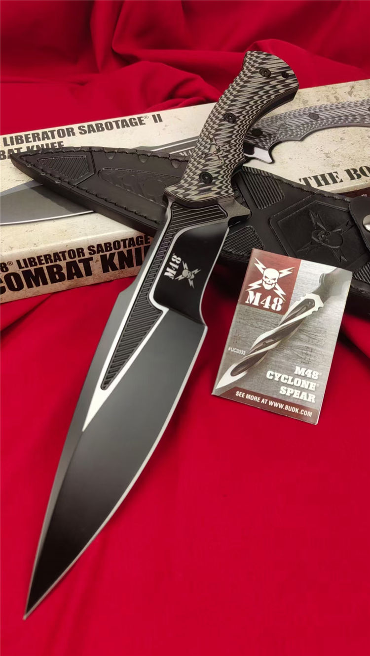 敢死队M48直刀 全长:375mm 刃长:230mm 柄长:145m 刃宽:55mm最宽处 刃厚:5.6mm 刃材:7Cr13 刀重:489g/600g含K鞘 毛重:771g(含包装盒) 硬度:56-58HRC 表面:纳米氧化黑钛+CNC精密加工 柄材:进口增强双色尼龙玻纤 配套:压花手工加厚皮套 包装:原装联合正品出口彩盒