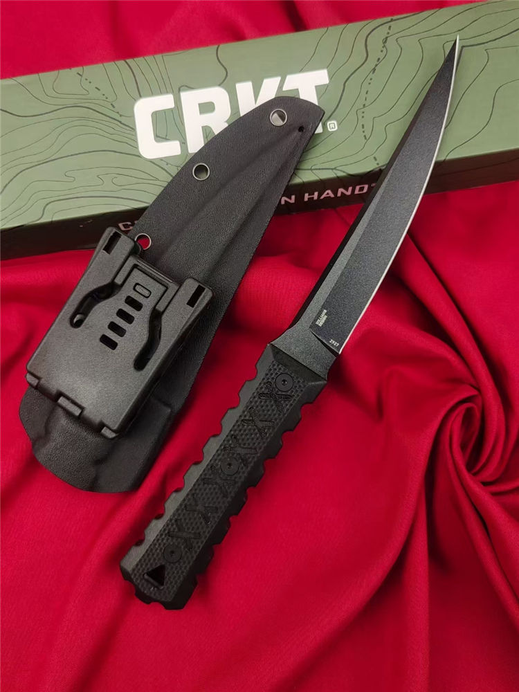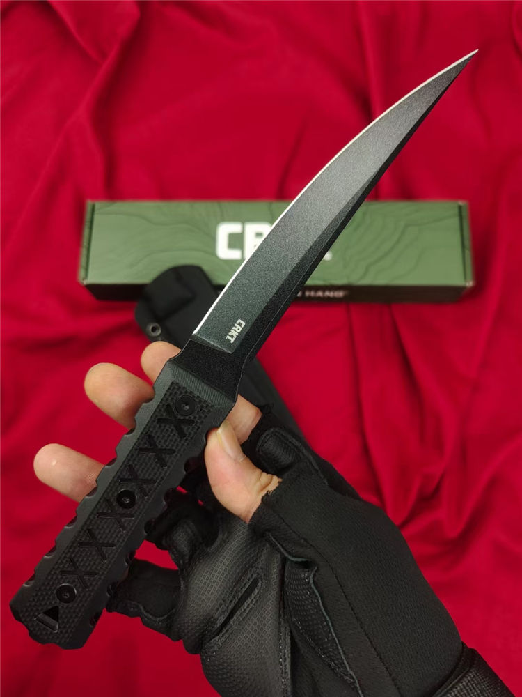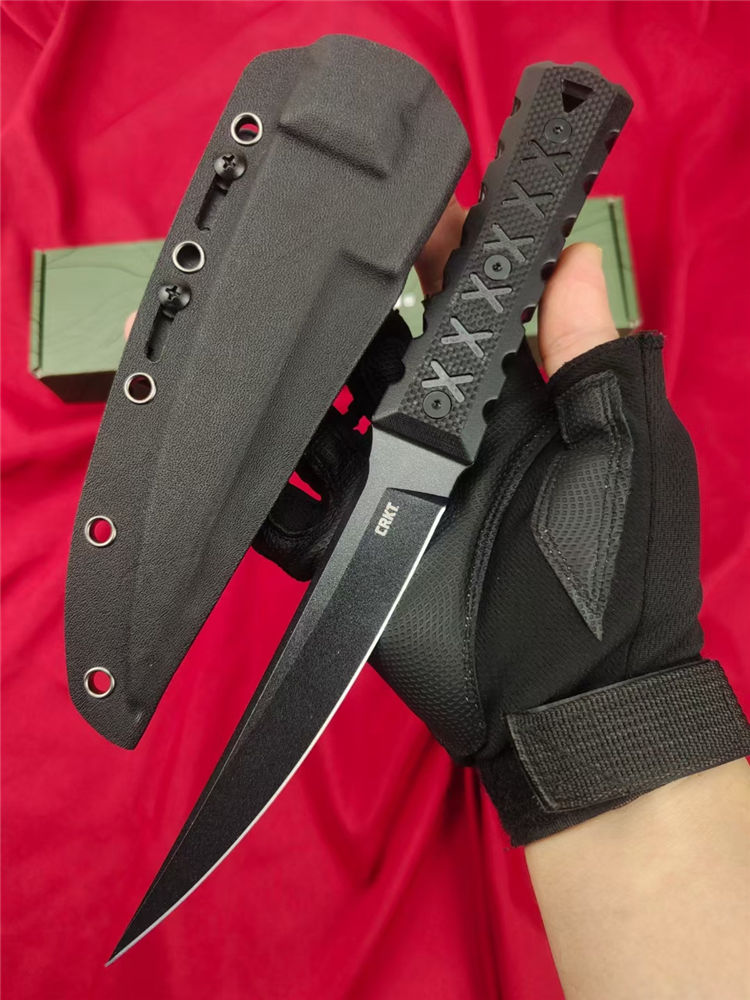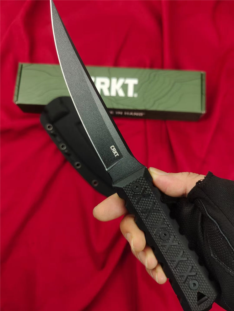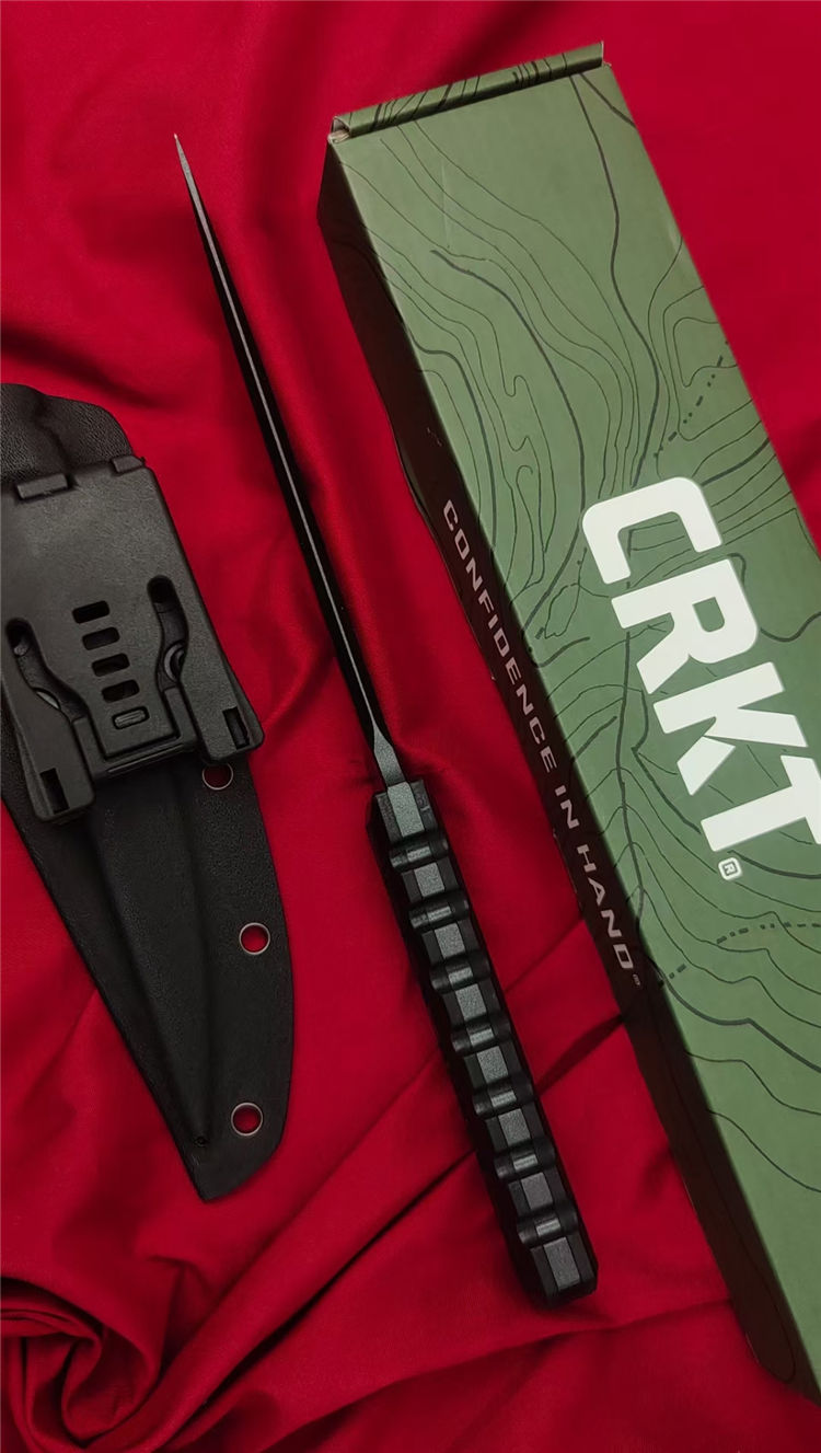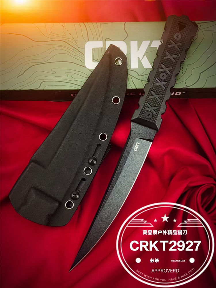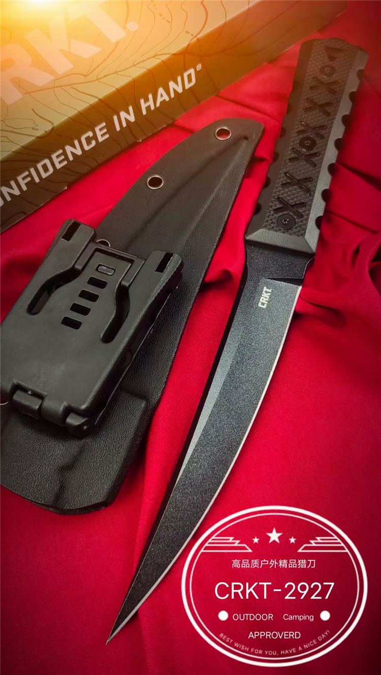 复刻版哥伦比亚2927必杀直刀 全长:285mm 刃长:150mm 柄长:120m 刃宽:25mm最宽处 刃厚:5.8mm 刃材:CPM-D2钢 刀重:285g/373g含K鞘 毛重:430g(含包装盒) 硬度:59-60HRC 表面:纳米陶瓷氧化钛喷砂发黑 柄材:进口黑色G10+CNC雕刻 配套:进口尼龙玻纤战术K鞘 包装:CRKT原装盒