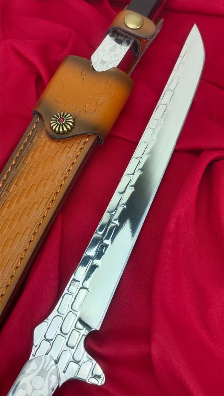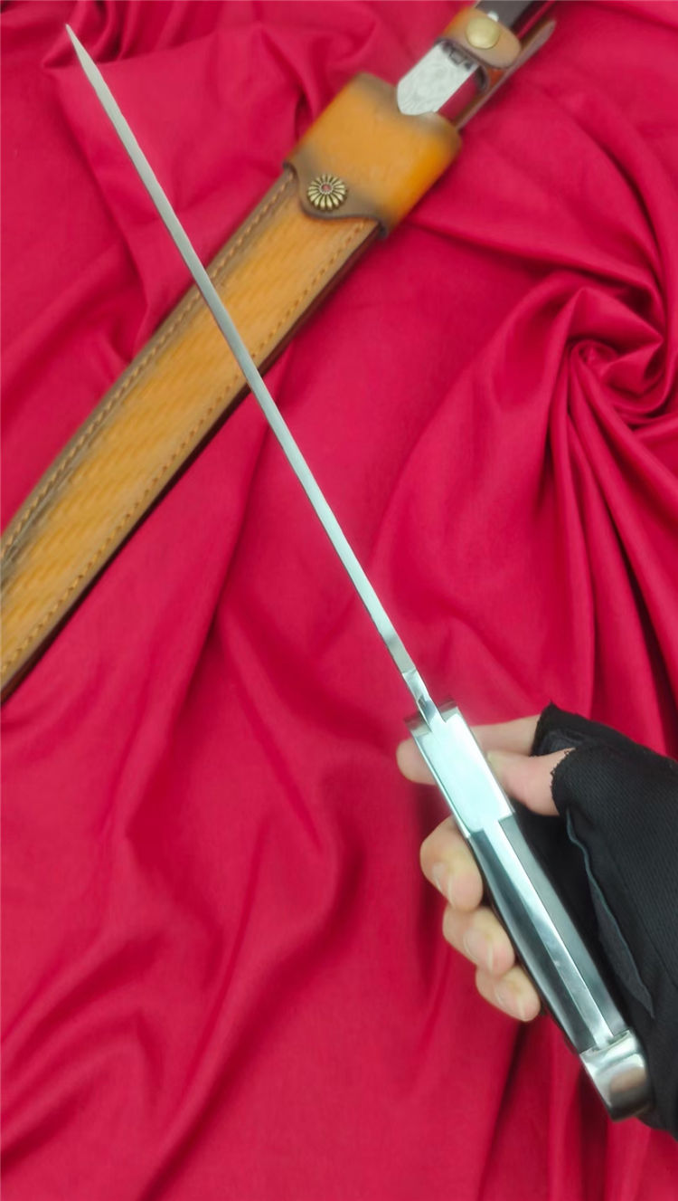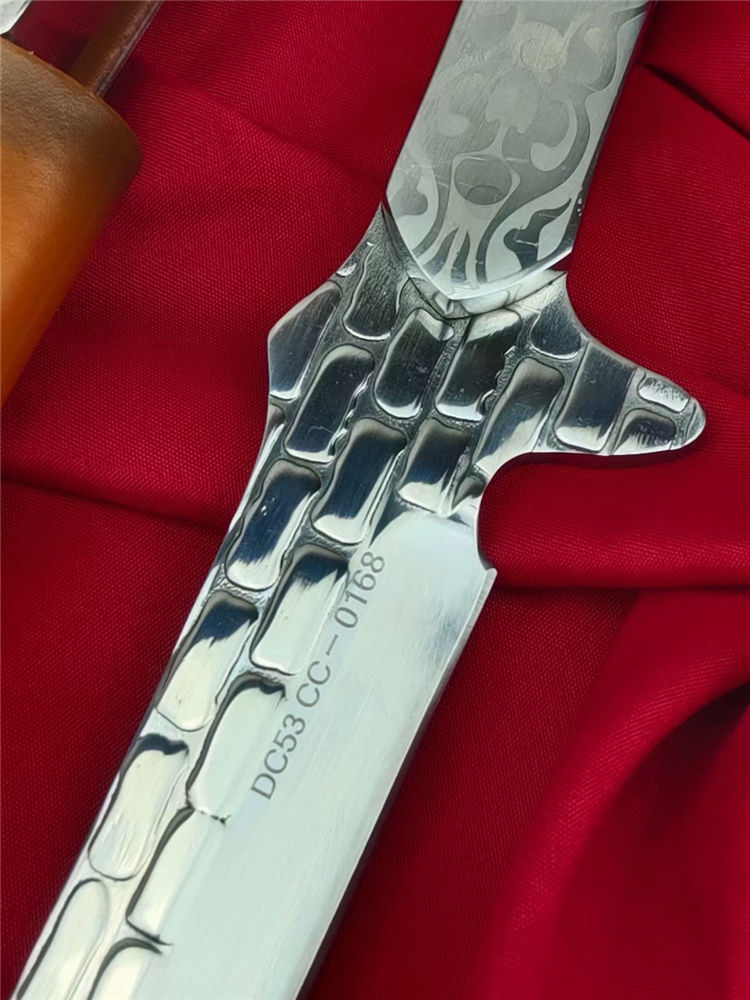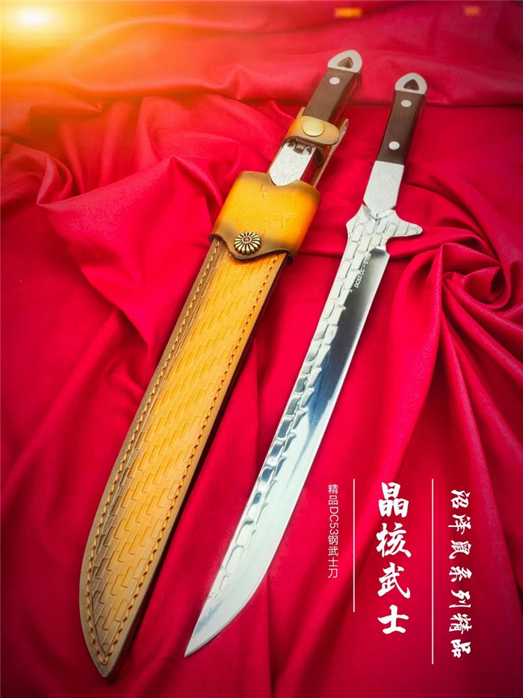 沼泽鼠晶核武士刀 全长:445mm 刃长:280mm 柄长:140m 刃宽:29mm最宽处 刃厚:5.5mm 刃材:进口DC53钢 刀重:500g/630g含皮套 硬度:59-60HRC 表面:镜光+热扎工艺 柄材:黑檀木+花纹钢头 结构:一体龙骨贯穿 配套:手工植鞣压花进口牛皮套