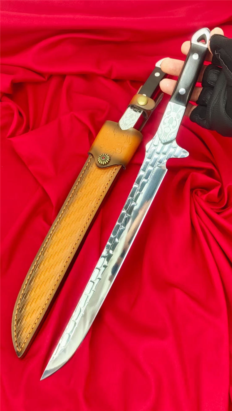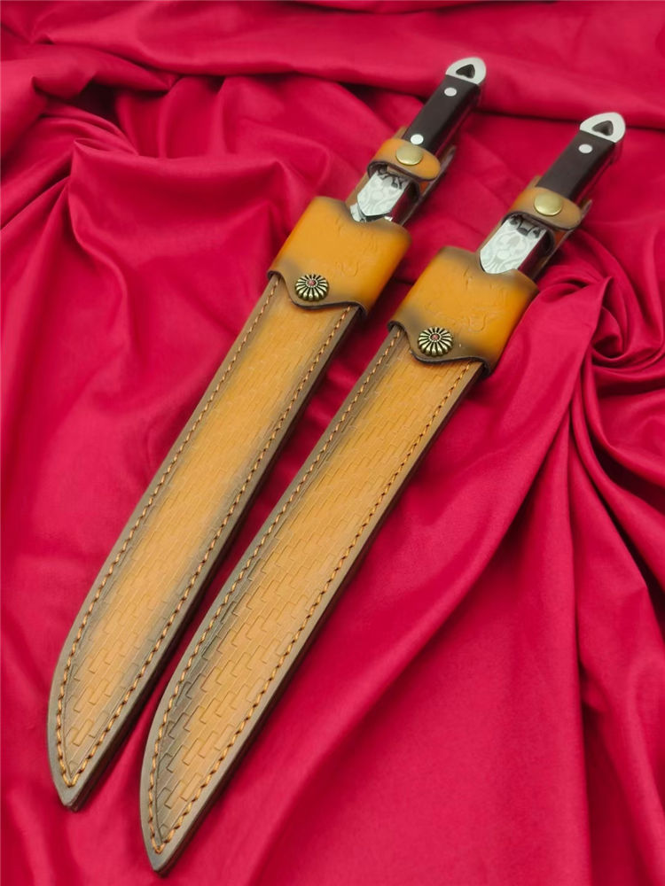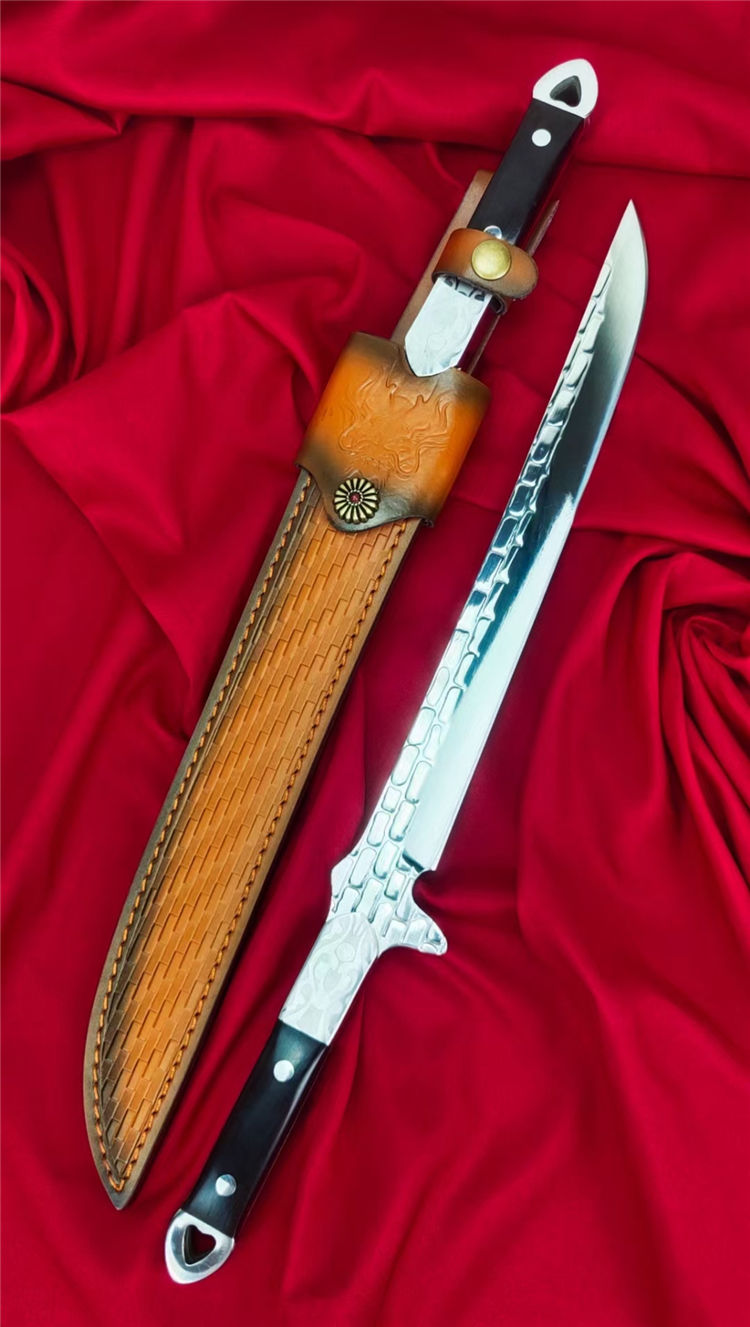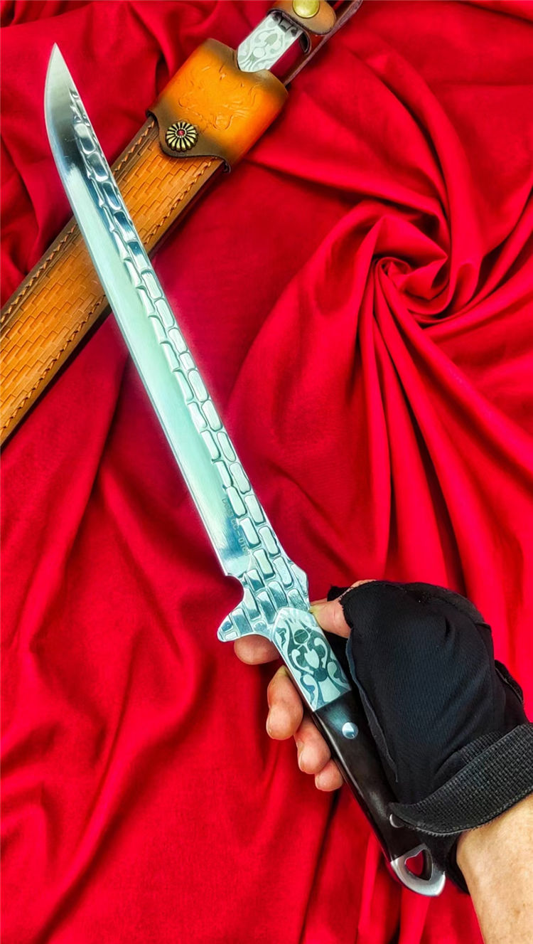 沼泽鼠晶核武士刀 全长:445mm 刃长:280mm 柄长:140m 刃宽:29mm最宽处 刃厚:5.5mm 刃材:进口DC53钢 刀重:500g/630g含皮套 硬度:59-60HRC 表面:镜光+热扎工艺 柄材:黑檀木+花纹钢头 结构:一体龙骨贯穿 配套:手工植鞣压花进口牛皮套