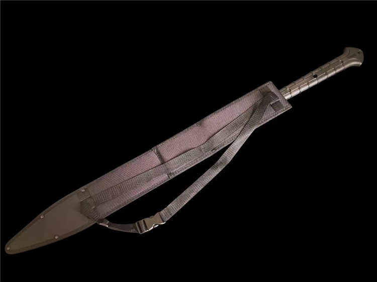 大气磅礴,这款剑似乎可以赋予你力量,带你感受不一样的世界。50厘米长的锋利刀身由1065碳钢制成,表面为黑色硬质涂层。手柄由尼龙纤维制成,非常坚固,尼龙护套和肩带可以轻松携带