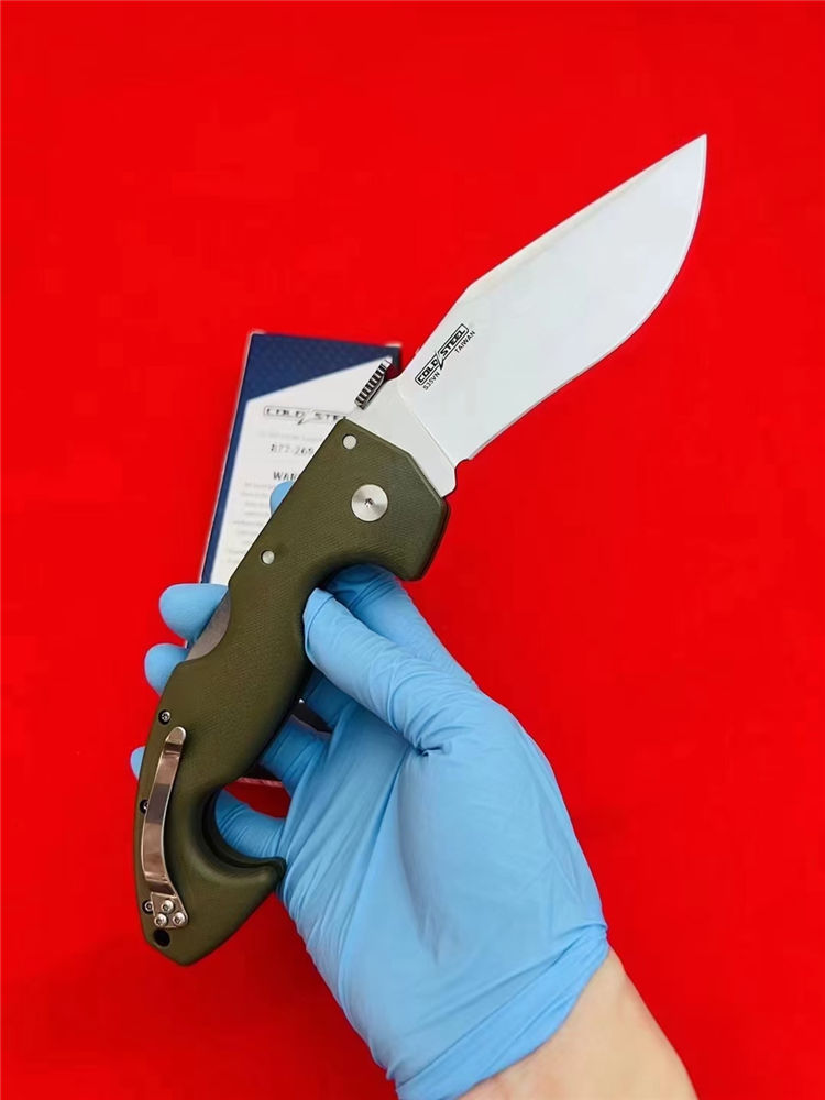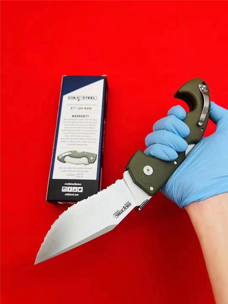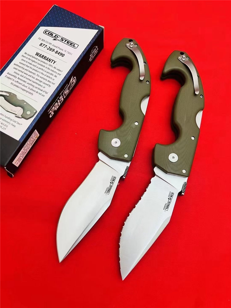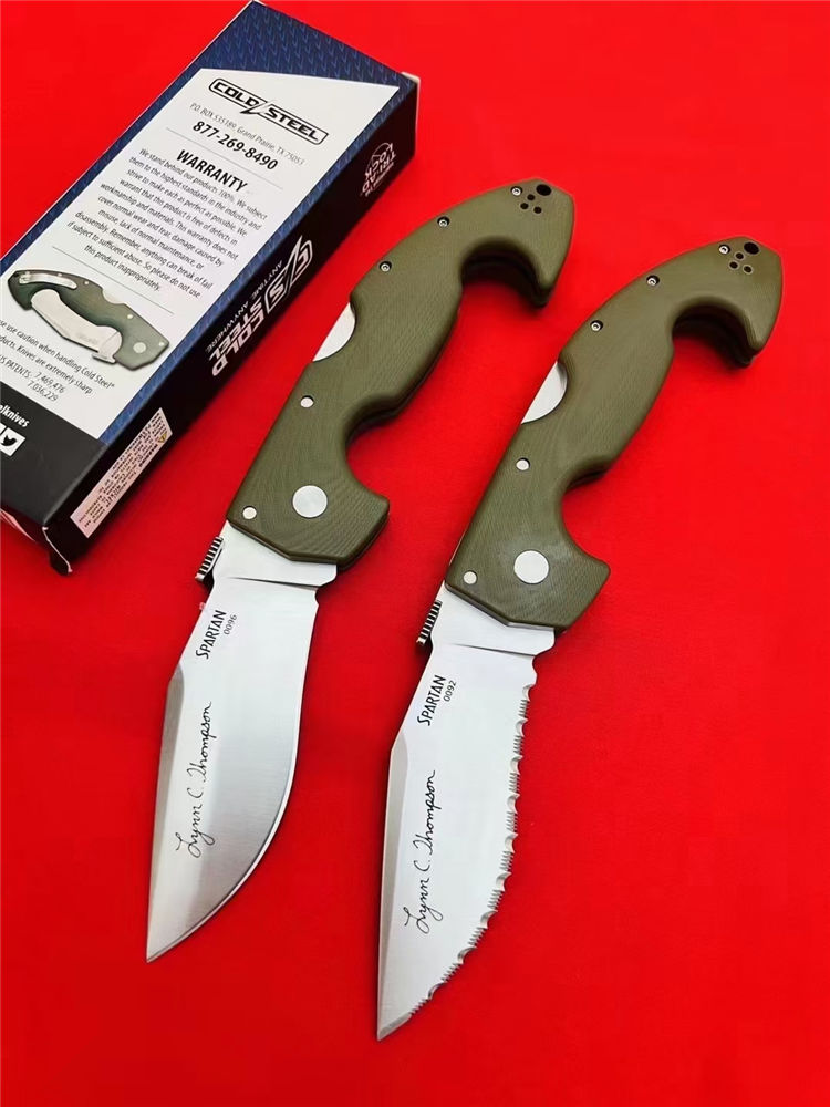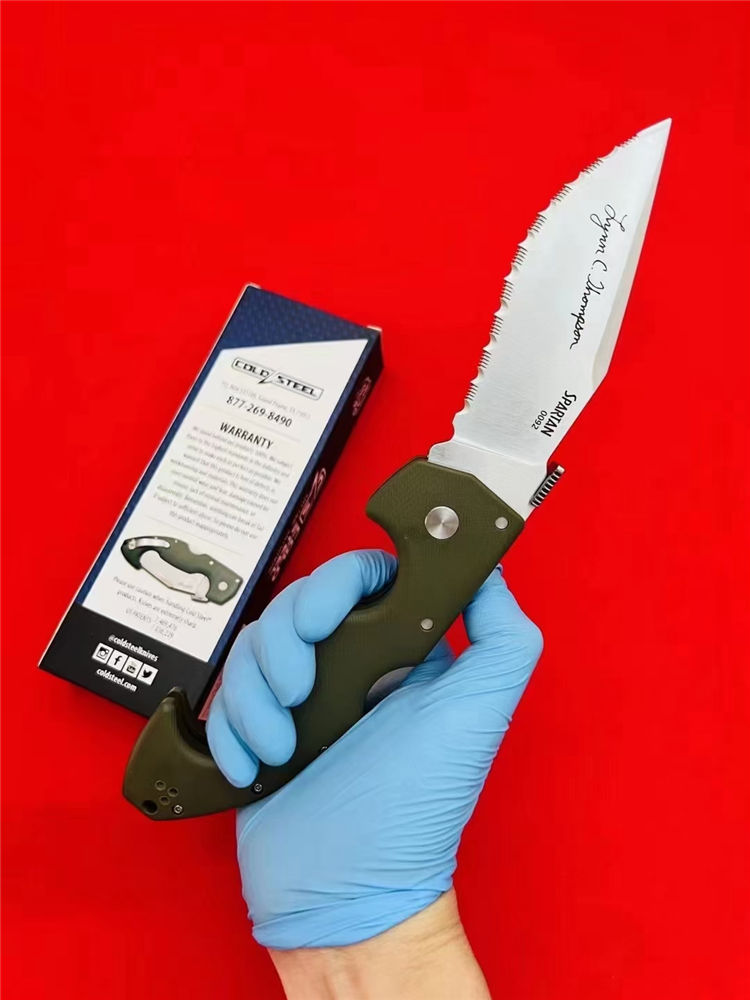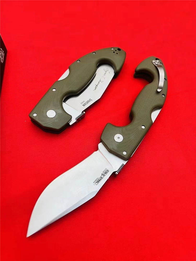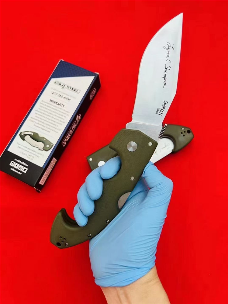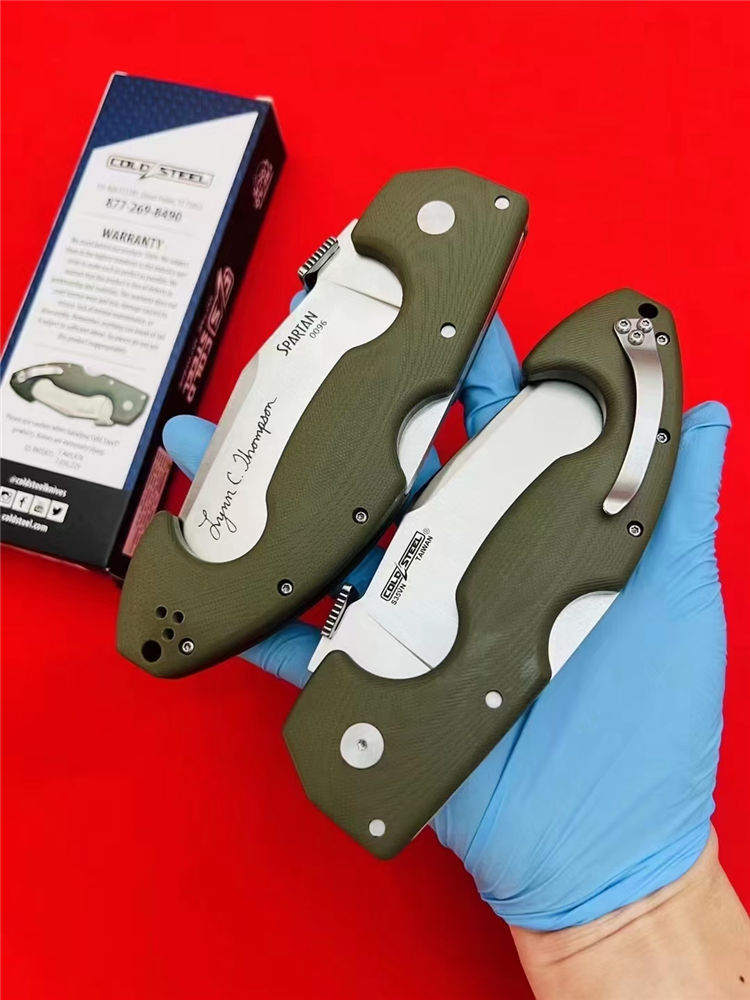 冷钢斯巴达手签版折刀 全长:25.7cm 刃长:11.2cm 柄长:14.5cm 刃材:9cr18mov 柄材:军绿色G10 刃厚:3.8mm 重量:253克含包装 包装:彩盒