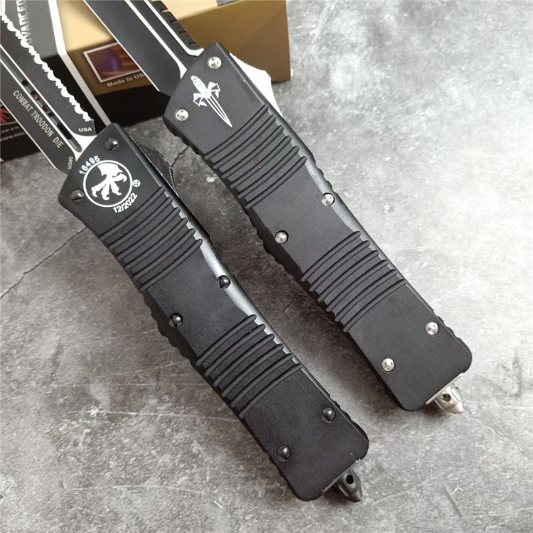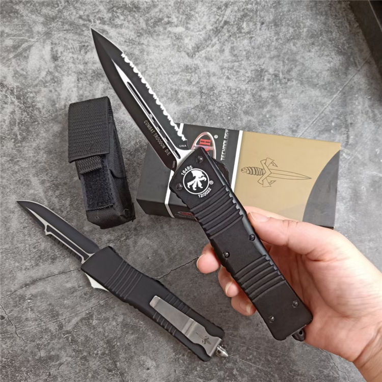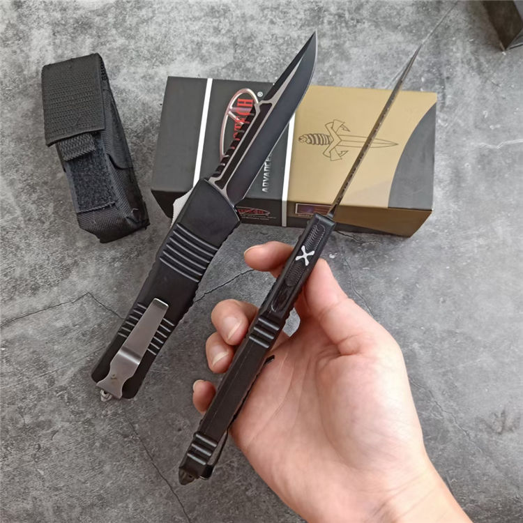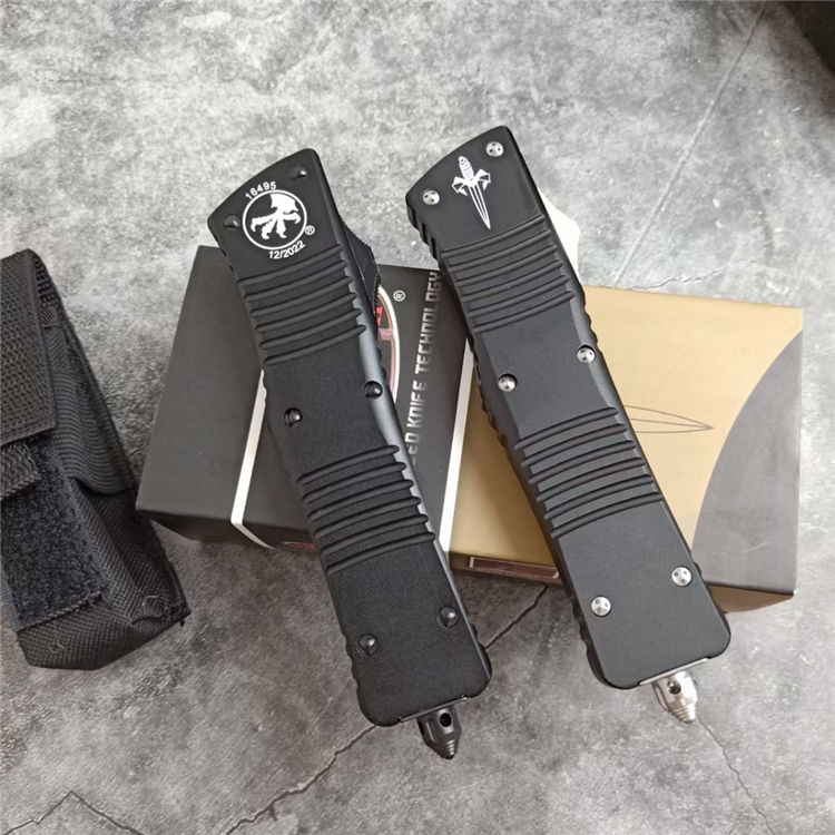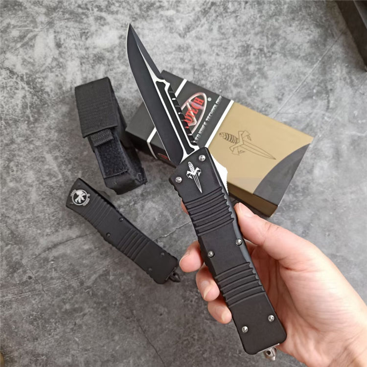 微技术A121拦截者直出跳刀 全长:24CM 刃长:9.6CM 柄长:14.4CM 刃材:D2 硬度:59 表面:镀钛,CNC磨 材料:铝合金 刀鞘:战术尼龙套