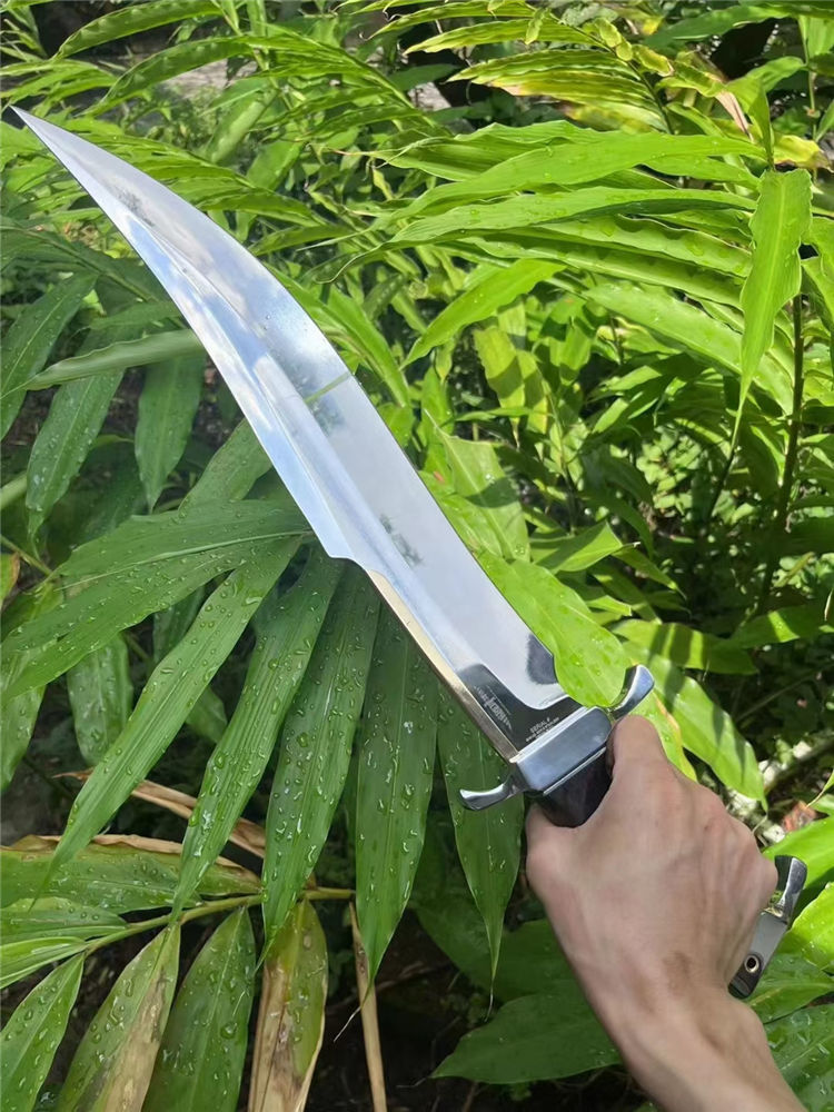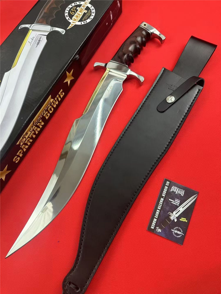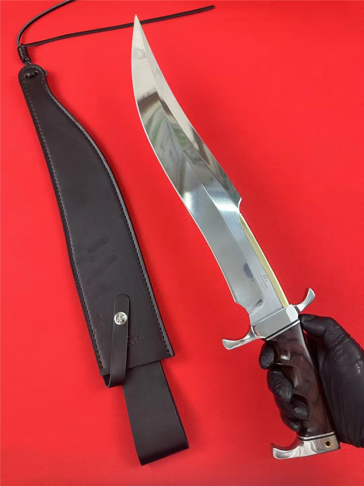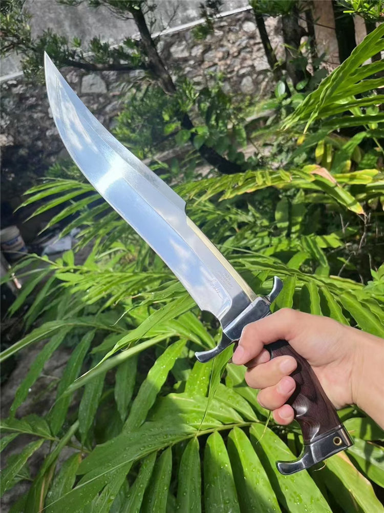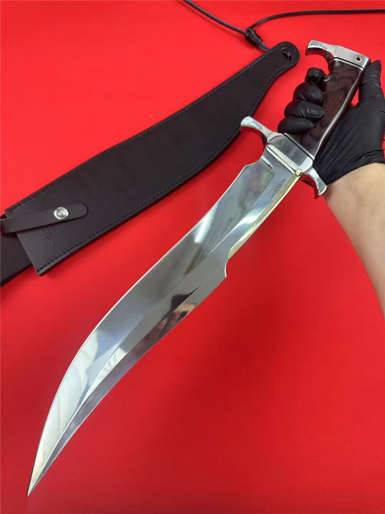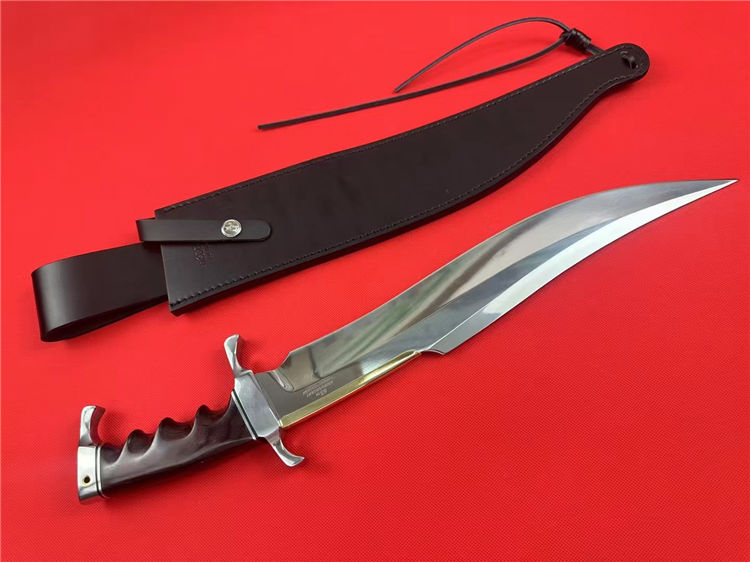 敢死队吉尔大博伊直刀 总长:52CM 刃长:38.5CM 刃宽:5.8CM 刃厚:6MM 柄长:13.5CM 柄宽:25MM 柄厚:14MM 重量:767克 刀鞘:优质牛皮鞘
