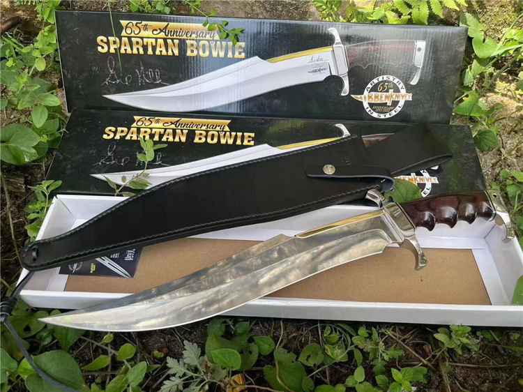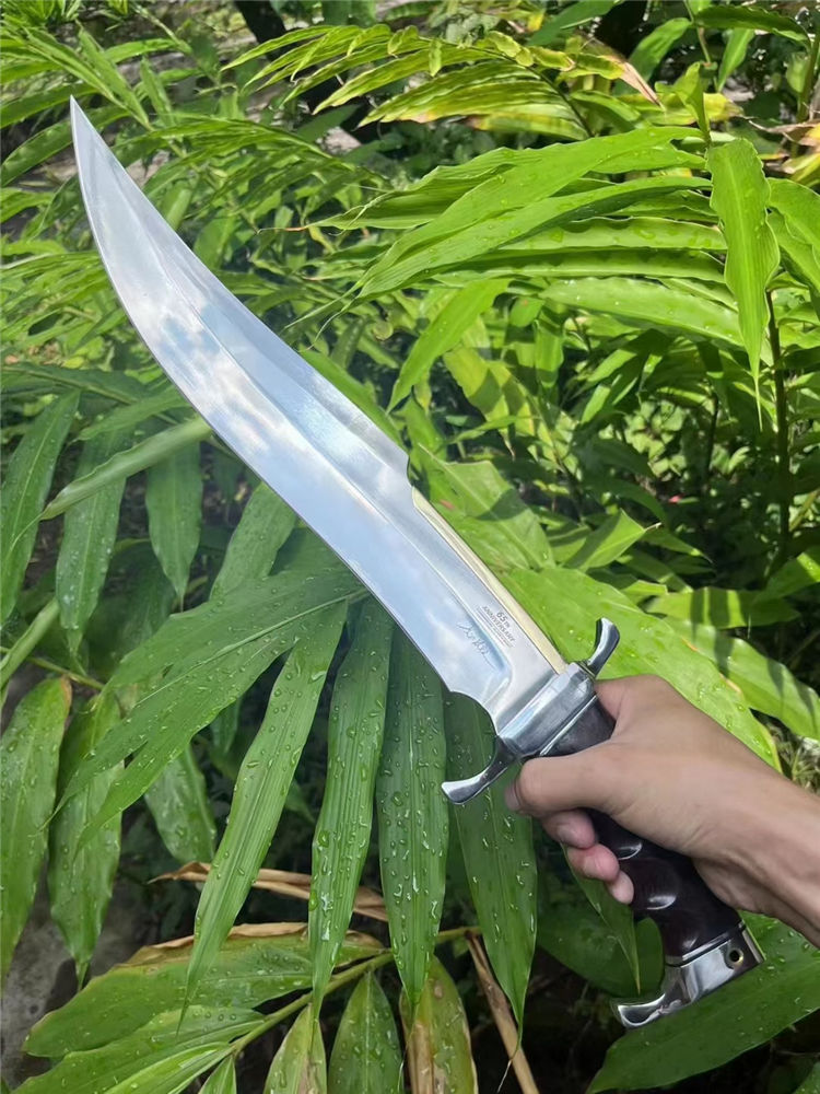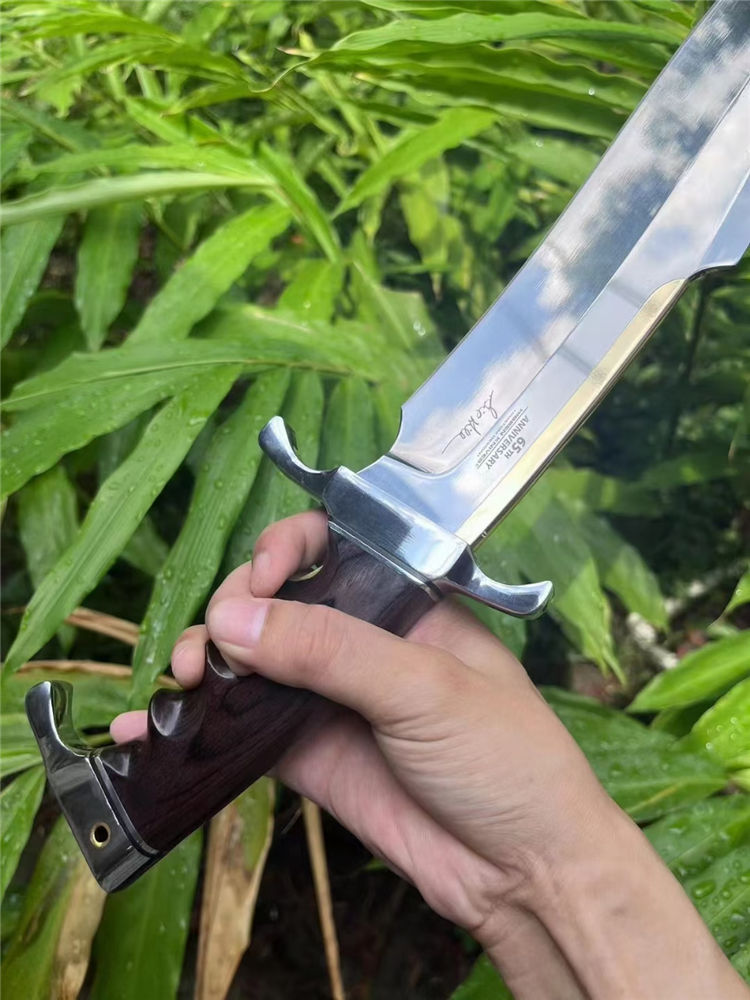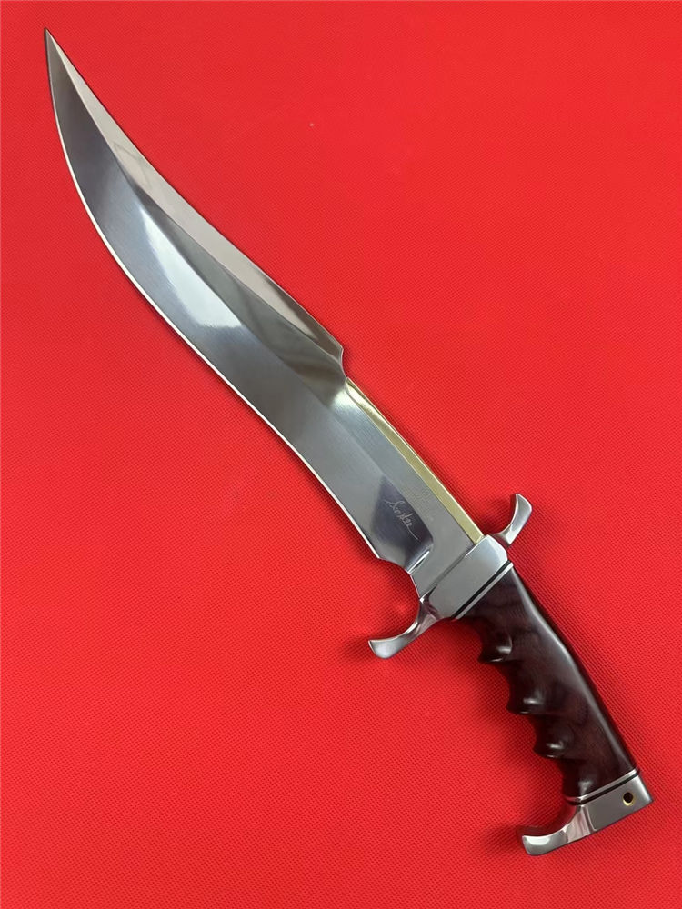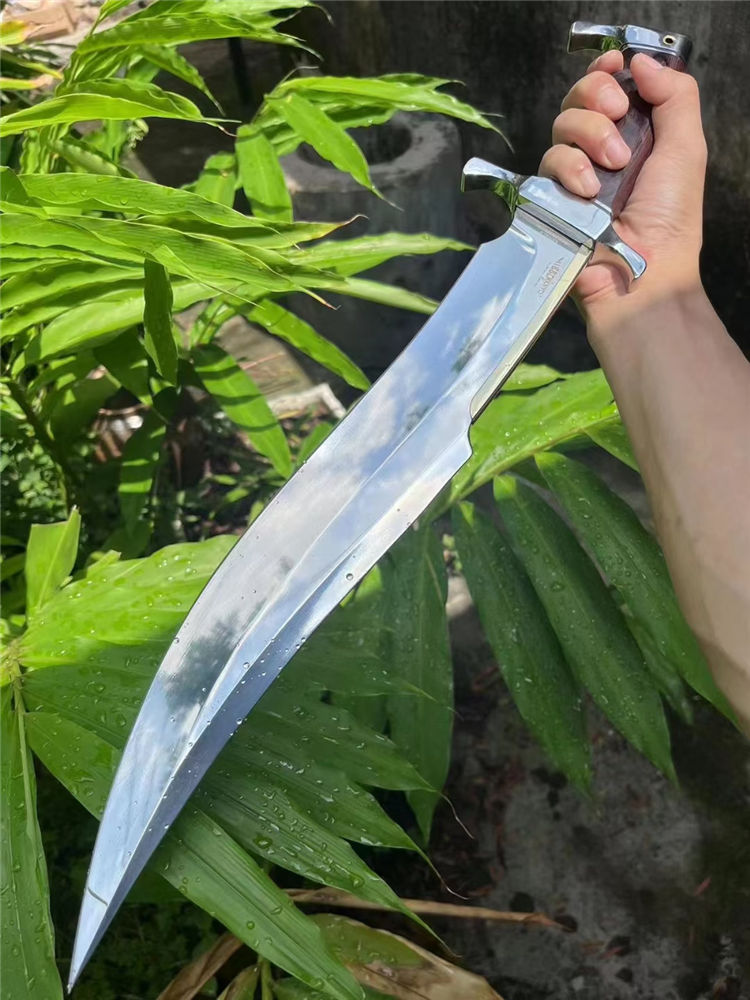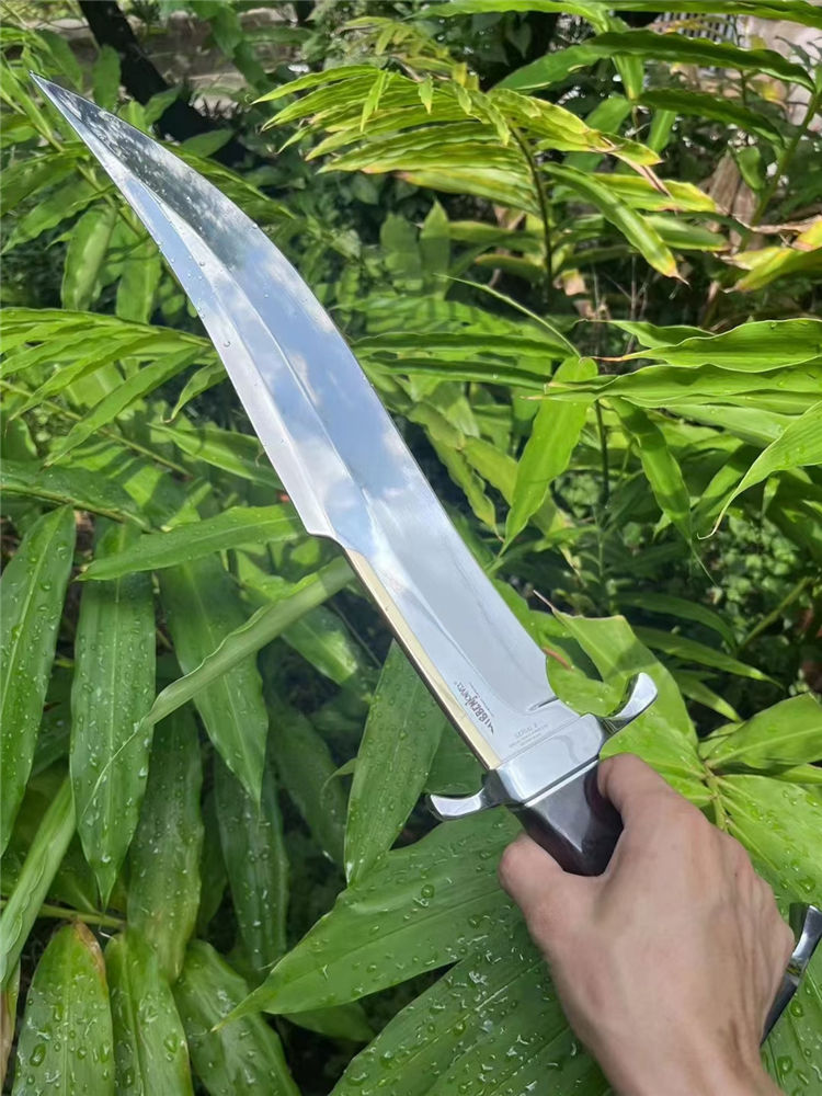 敢死队吉尔大博伊直刀 总长:52CM 刃长:38.5CM 刃宽:5.8CM 刃厚:6MM 柄长:13.5CM 柄宽:25MM 柄厚:14MM 重量:767克 刀鞘:优质牛皮鞘