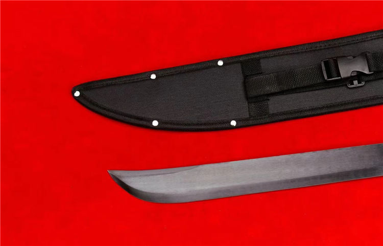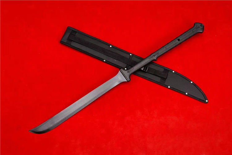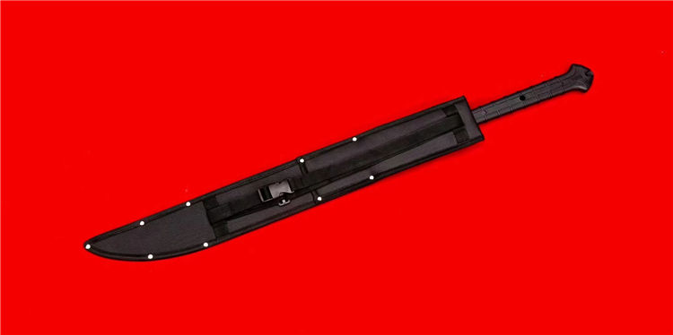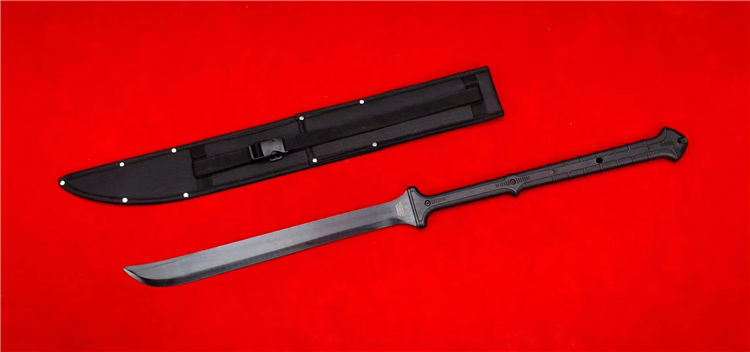 大气磅礴,这款剑似乎可以赋予你力量,带你感受不一样的世界。50厘米长的锋利刀身由1065碳钢制成,表面为黑色硬质涂层。手柄由尼龙纤维制成,非常坚固,尼龙护套和肩带可以轻松携带