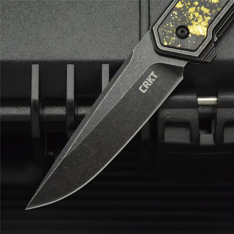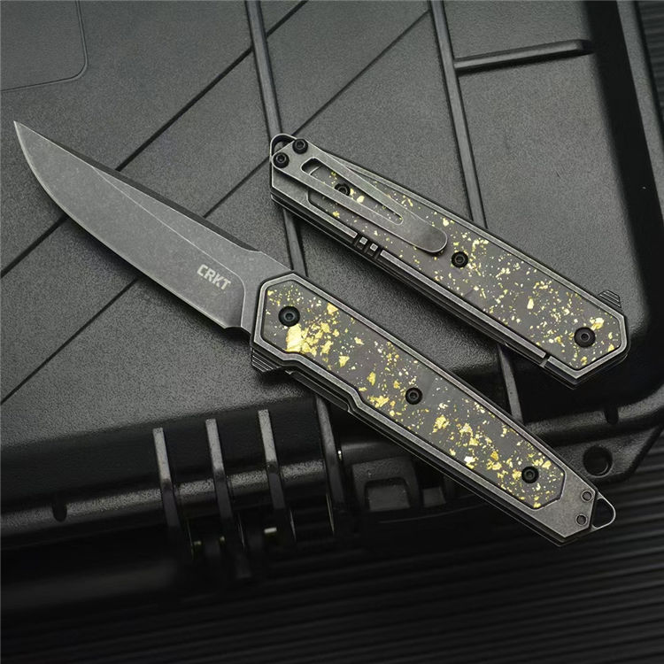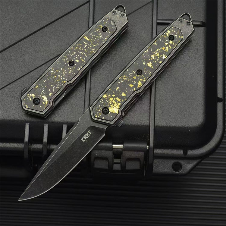 哥伦比亚定制版CRKT7091折刀 总长:17.9CM 刃长:7.4CM 刃宽:2CM 刃厚:2.5MM 刃材:D2 柄材:420钢镶嵌金箔碳纤维贴片 柄长:10.5CM 柄宽:20MM 柄厚:9MM 重量:100G