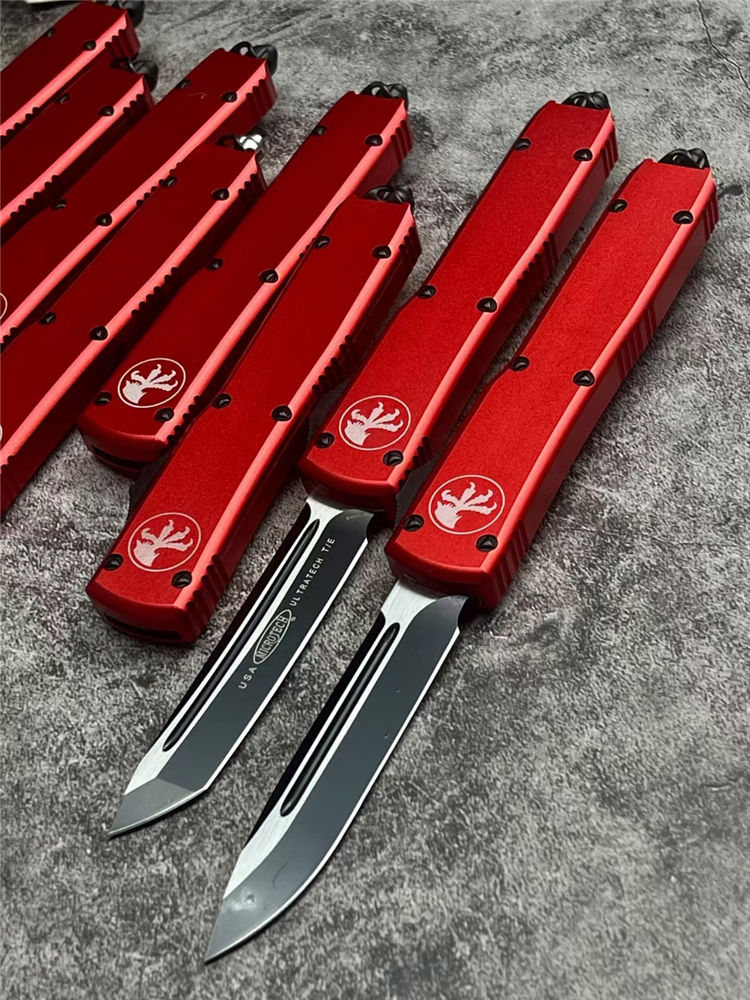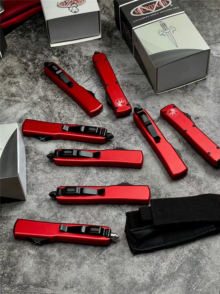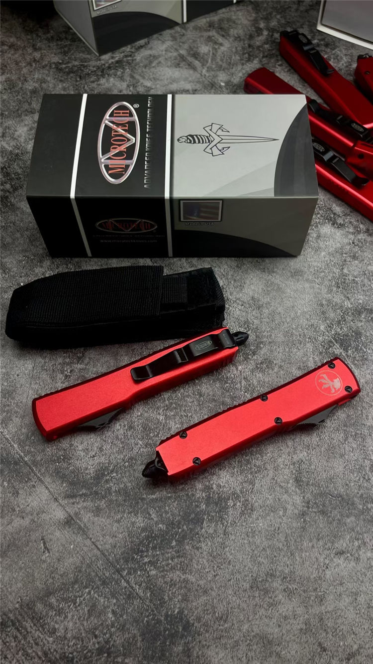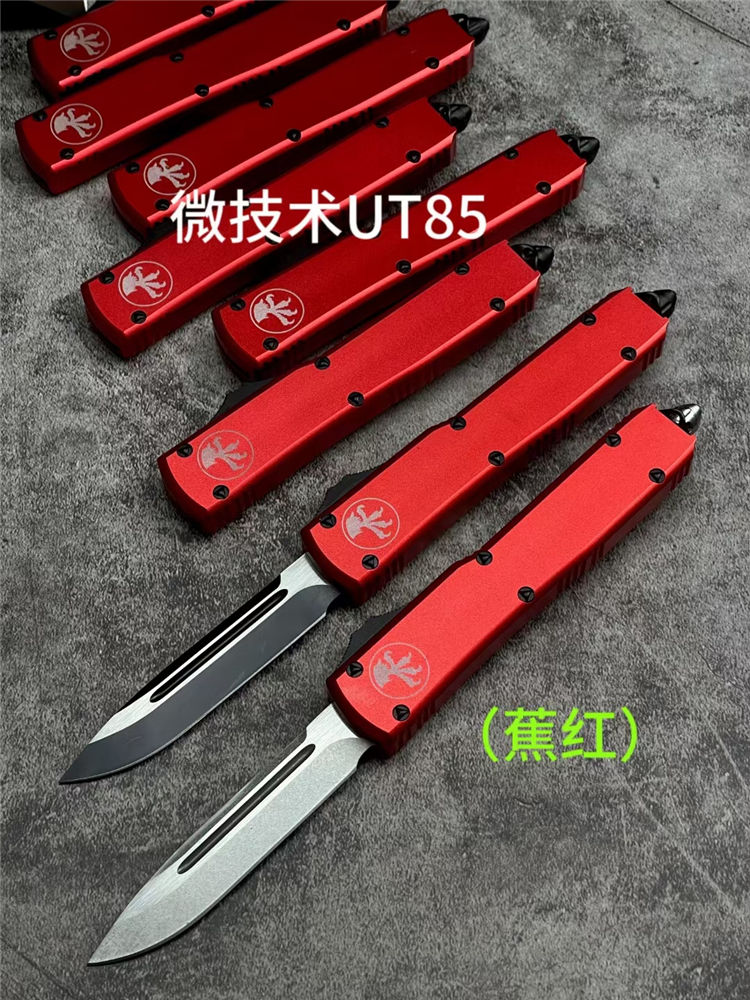 微技术UT85蕉红直出跳刀 总长:22.5CM 刃长:8.5CM 厚度:3MM 刃材:D2钢 硬度:59HRC 锁类:按钮锁 柄材:铝合金 净重:107克 包装:彩盒刀套 附件:尼龙套,彩盒,送拆工刀具