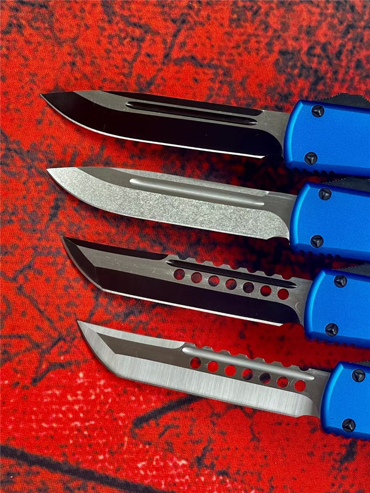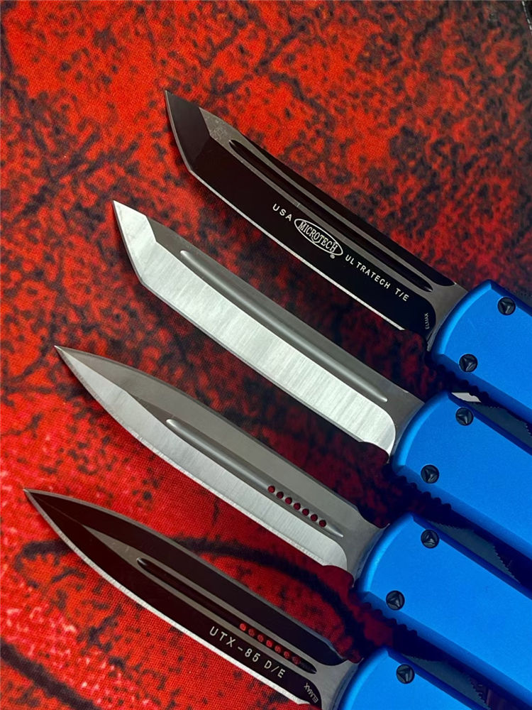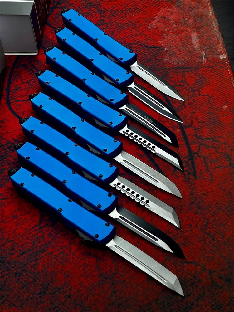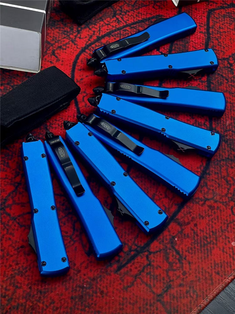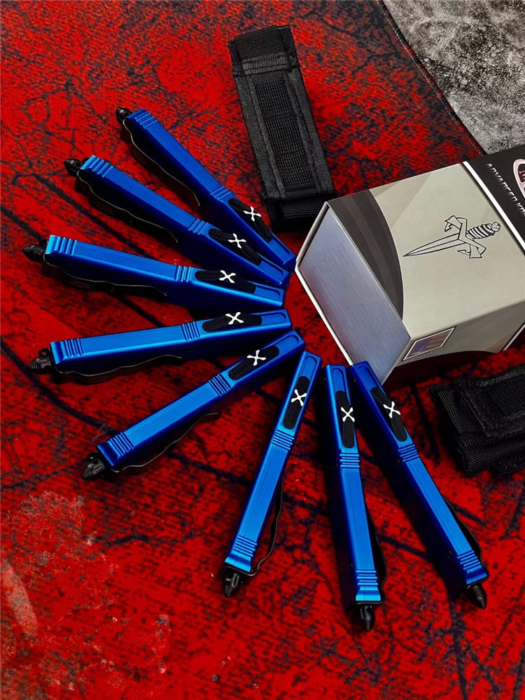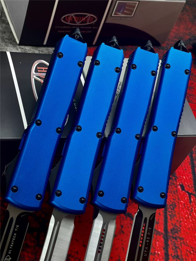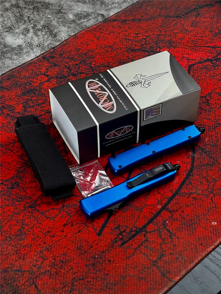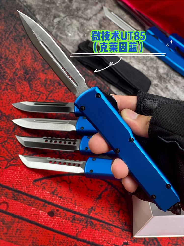 微技术UT85克莱因蓝直出跳刀 总长:22.5CM 刃长:8.5CM 厚度:3MM 刃材:D2钢 硬度:59HRC 锁类:按钮锁 柄材:铝合金 净重:107克 包装:彩盒刀套 附件:尼龙套,彩盒,送拆工刀具