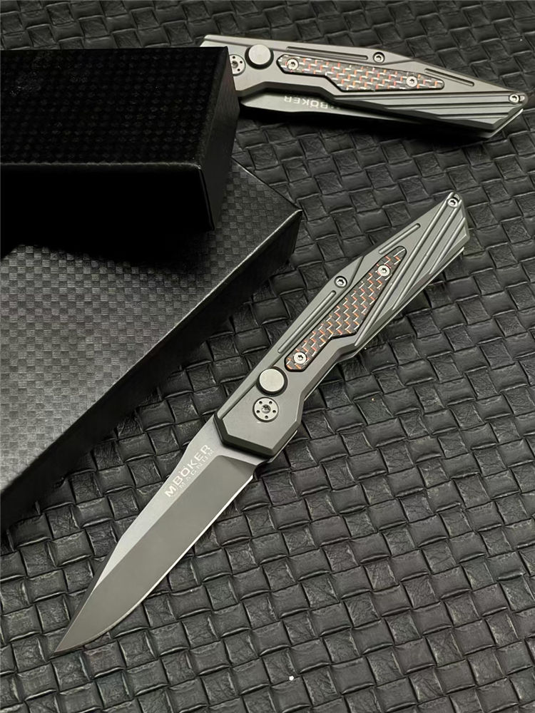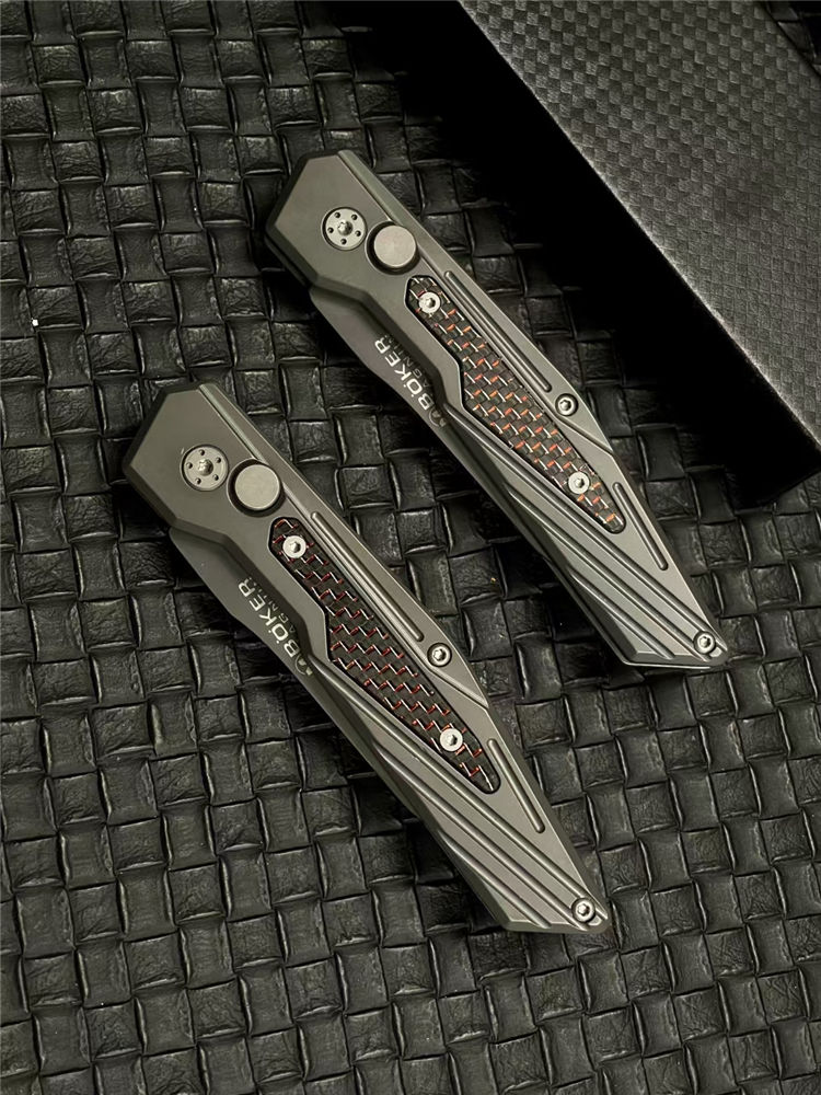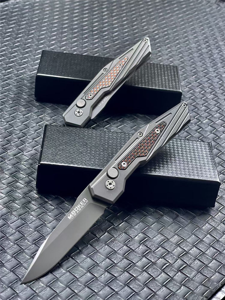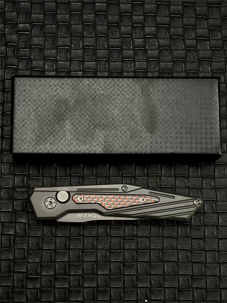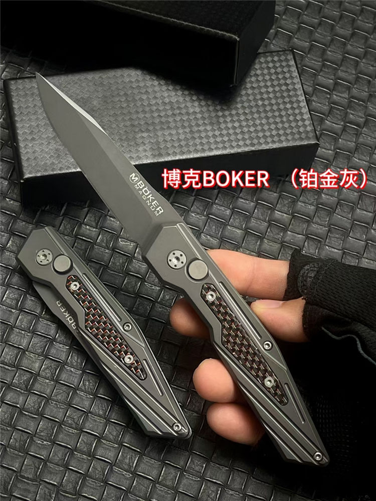 博克碳纤侧开跳刀 全长:19.5cm 刃长:7.8cm 闭合:11.7cm 钢材:D2 硬度:58+HRC 刃厚:3mm 表面:灰钛 柄材:全钢镀钛+灰钛+碳纤 重量:135克 包装:精美礼品盒 开启锁定方式PUSH BUTTON自动按钮侧跳