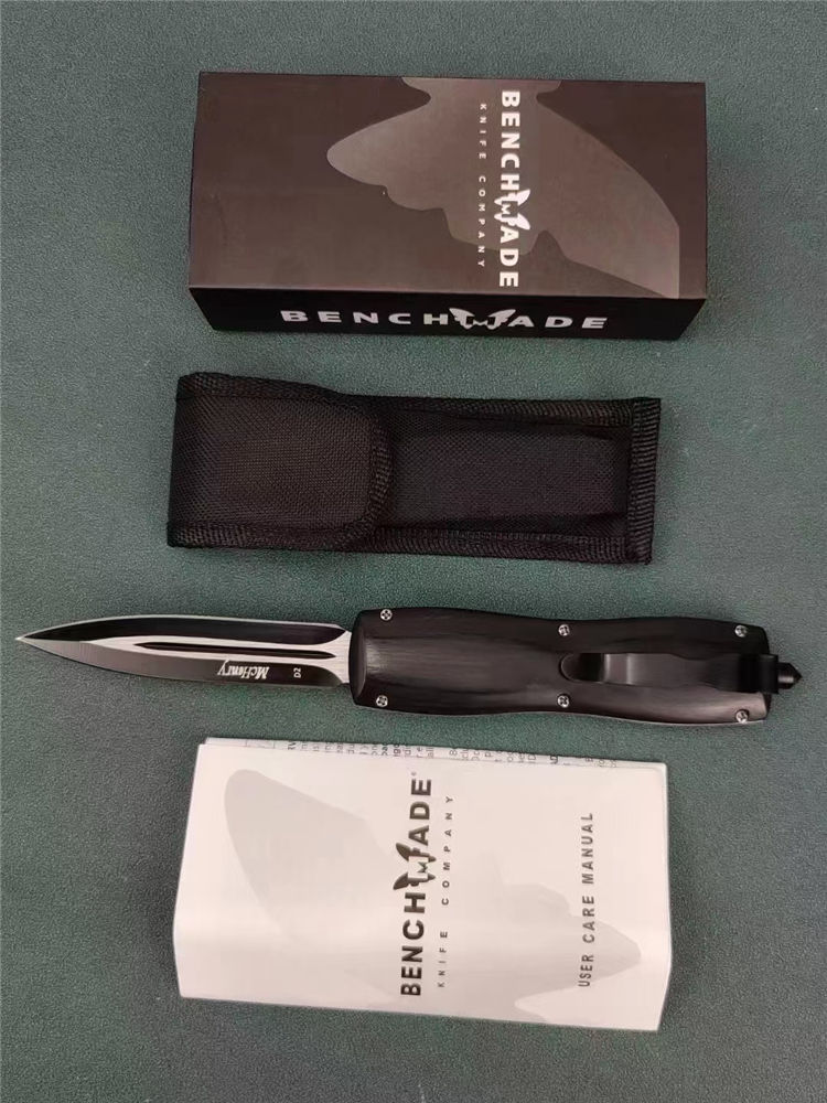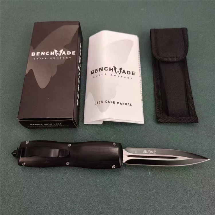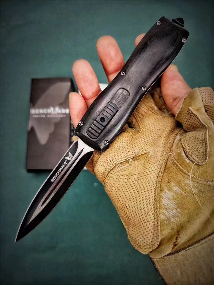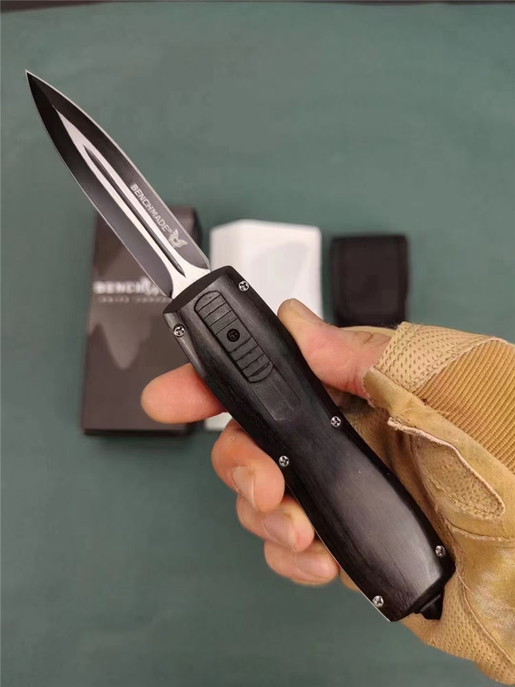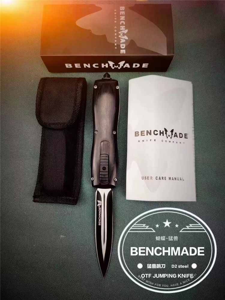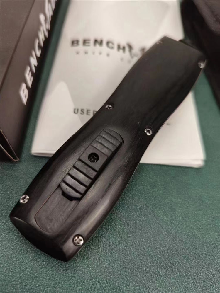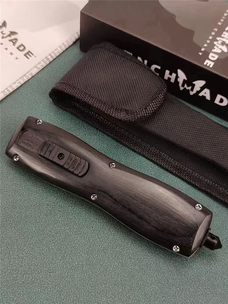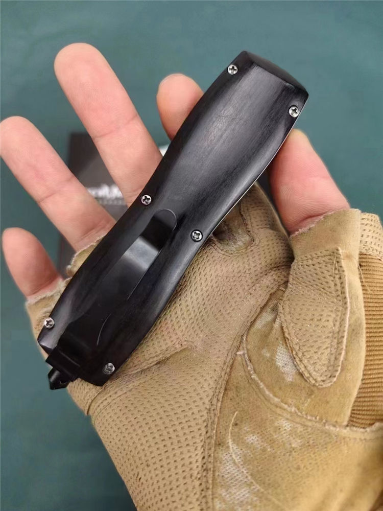 蝴蝶猛兽直出跳刀 全长:23cm 刃长:9.5cm 柄长:13.5cm 刃厚:2.5mm 刃材:D2钢 硬度:59HRC 刀重:186g 毛重:235g 表面:镀黑钛 柄材:锌铝合金+檀木 配鞘:战术尼龙 锁闭:直出弹簧刀 其他:带尾椎/背夹
