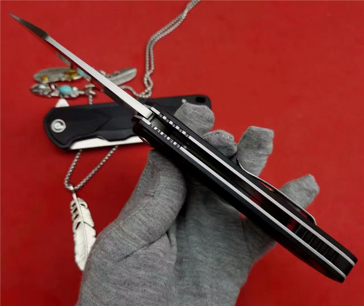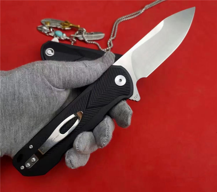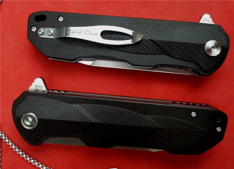 代工727折刀 全长:22.5cm 刃长:9cm(有效刃长) 柄长:12.7cm 刃宽:3.1cm(最宽处) 刃厚:4.2mm 刃材:D2钢(保真钢材) 硬度:61+-1HRC 刀柄:黑色G10 表面:CNC数控研磨(砂光) 开关方式:快开,内置陶瓷轴承 刀重:187g(裸刀)