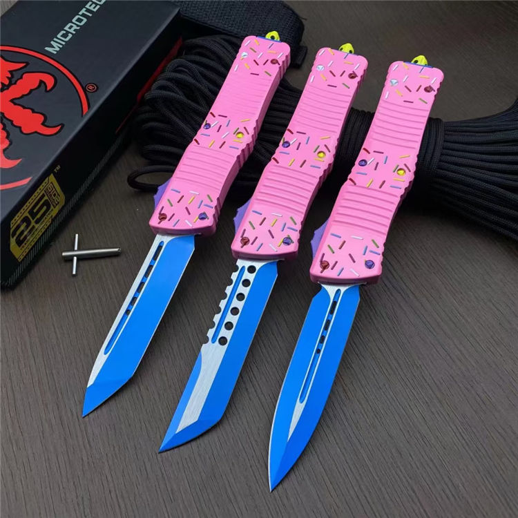 微技术甜甜圈大龙直出跳刀 全长:24cm 刃长:9.5cm 刃厚:3mm 刃宽:2cm 柄长:14.5cm(含尾椎) 刃材:D2 硬度:58-60HRC 总重:(含包装) 裸重:130g 表面:镀钛 柄材:航空铝 包装:彩盒、说明书,尼龙套 备注:带玻璃锥、腰夹