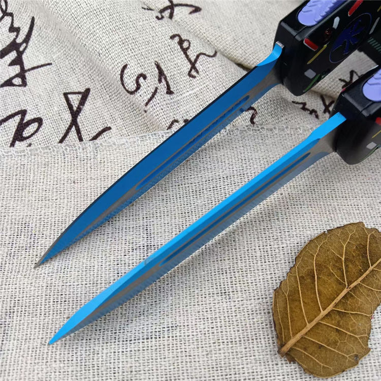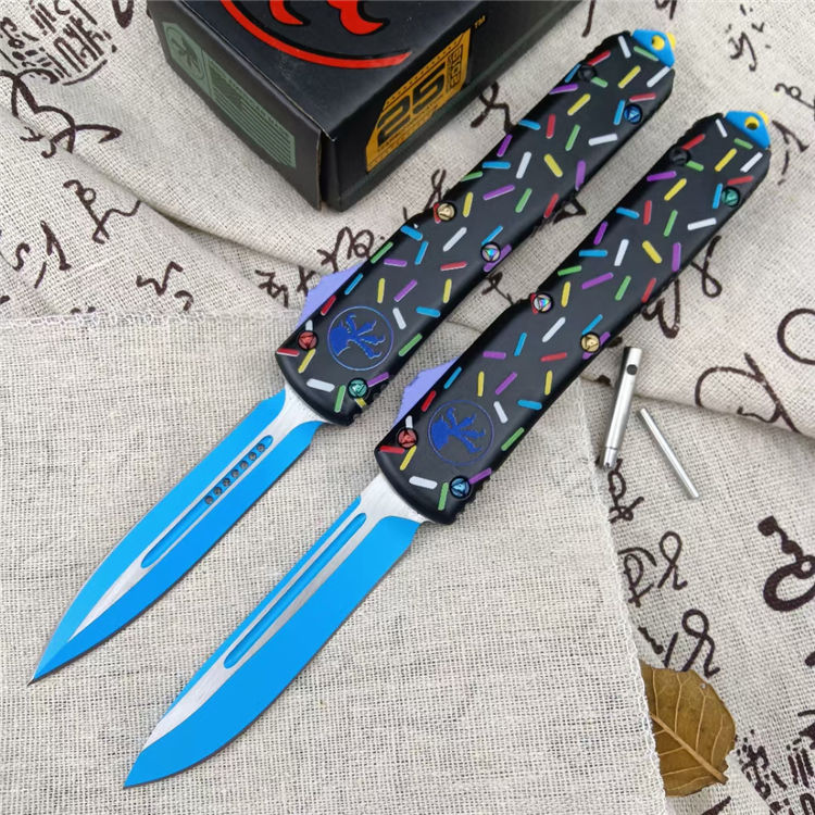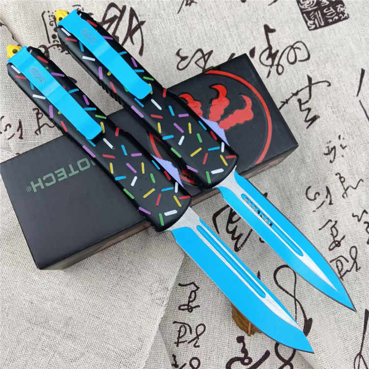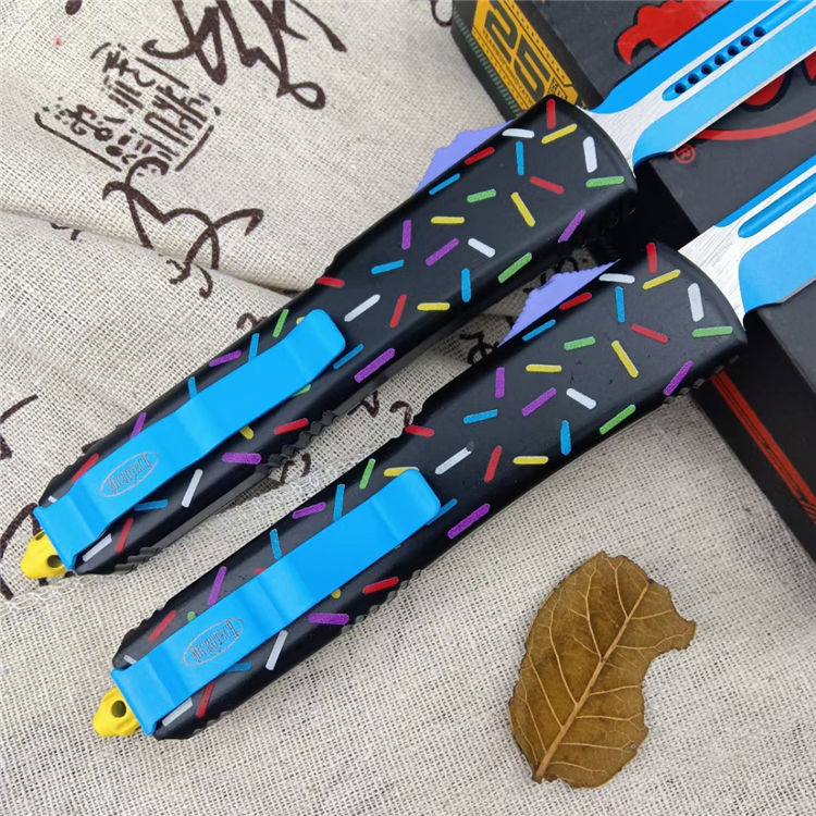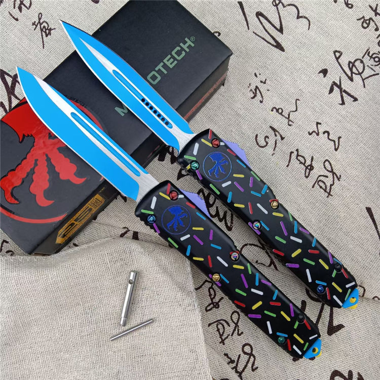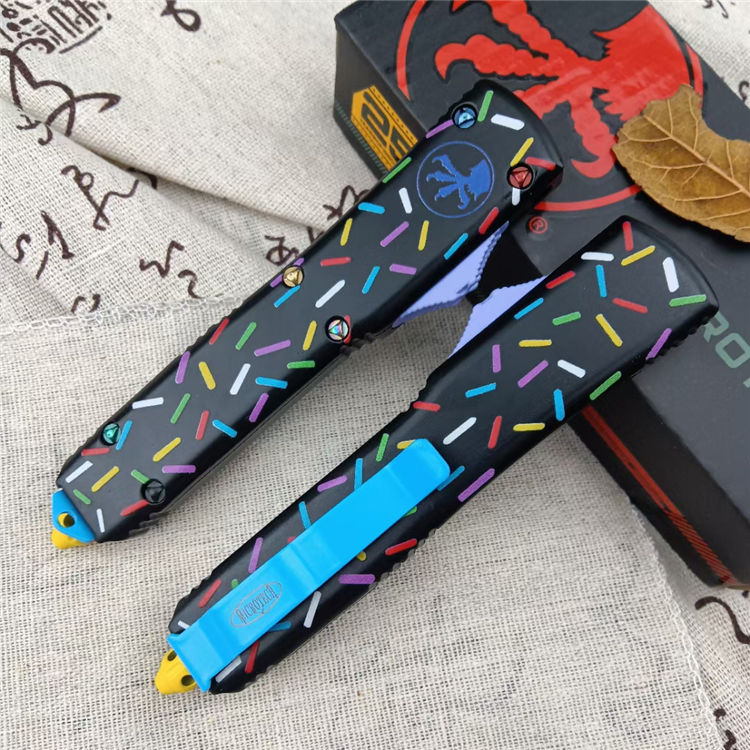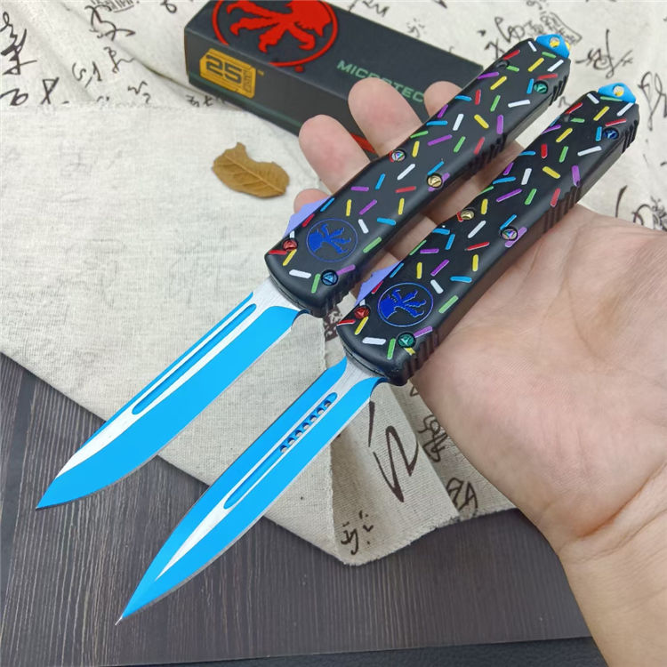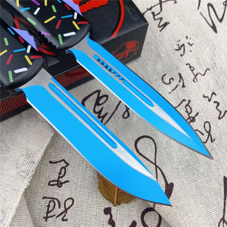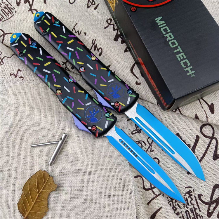 微技术UT85甜甜圈直出跳刀 总长:22.2CM 刃长:8.8CM 刃宽:1.6CM 刃厚: 2.5MM 刃材:440C 柄材:锌合金 柄长:13.4CM 柄宽:22MM 柄厚:10MM 重量:180G 刀鞘:尼龙套