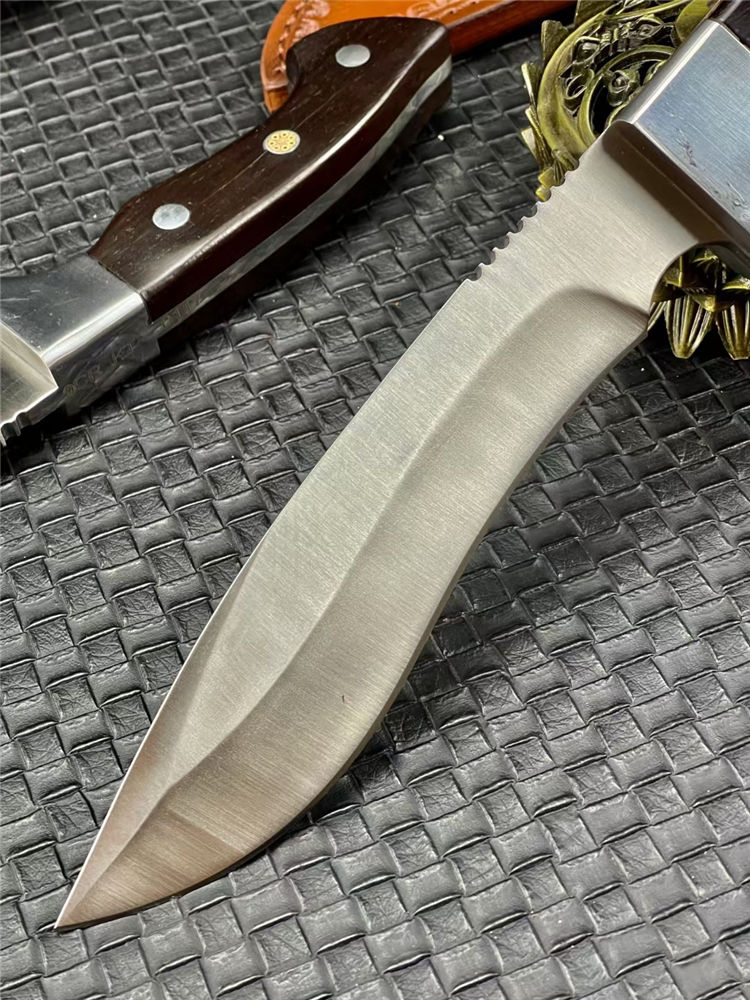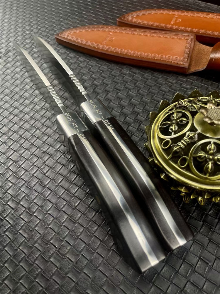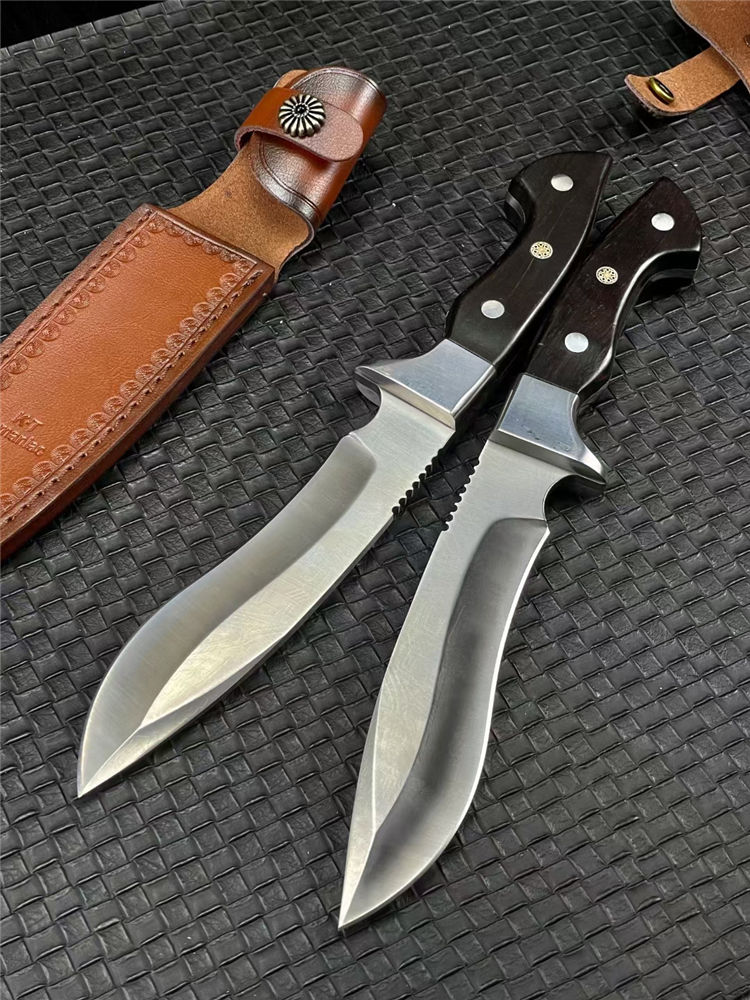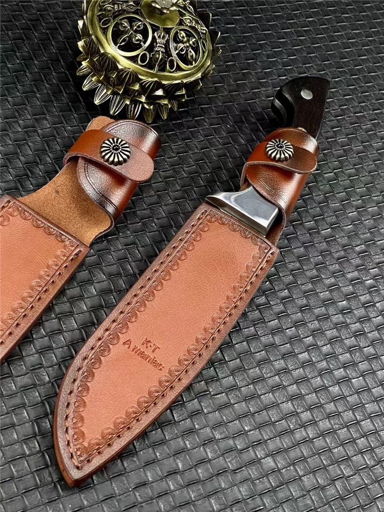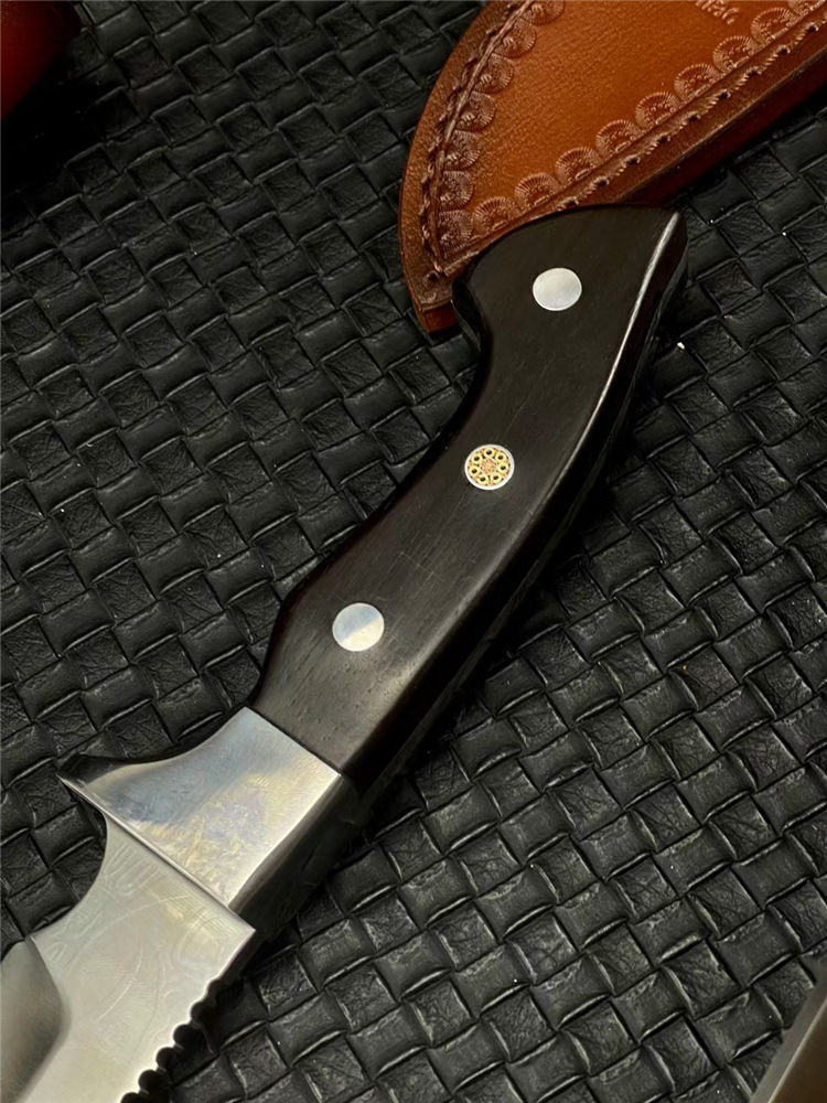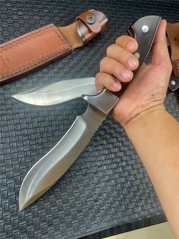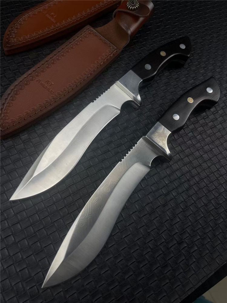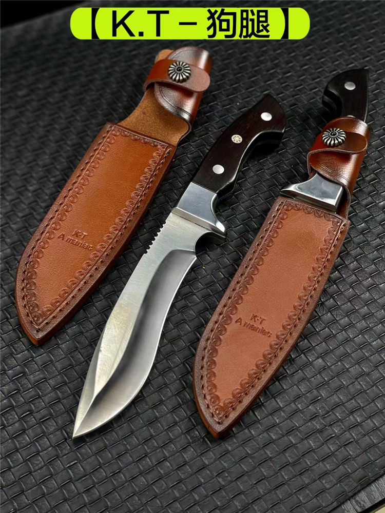 KT狗腿弯刀 全长:320mm 刃长:182mm 柄长:138mm 刃宽:38mm 刃厚:5mm 刃材:9Cr18Mov钢 深冷处理 刀重:462g 毛重:540g (含鞘) 硬度:60HRC 表面:超镜光 柄材:进口黑彩木 结构:一体龙骨 配套:手工压花牛皮套 包装:黑色礼品盒