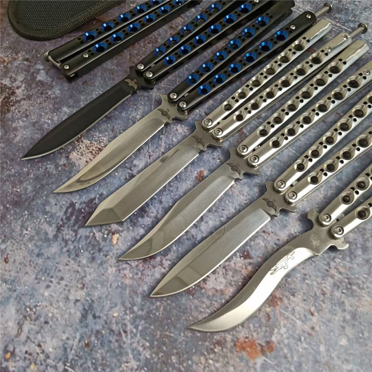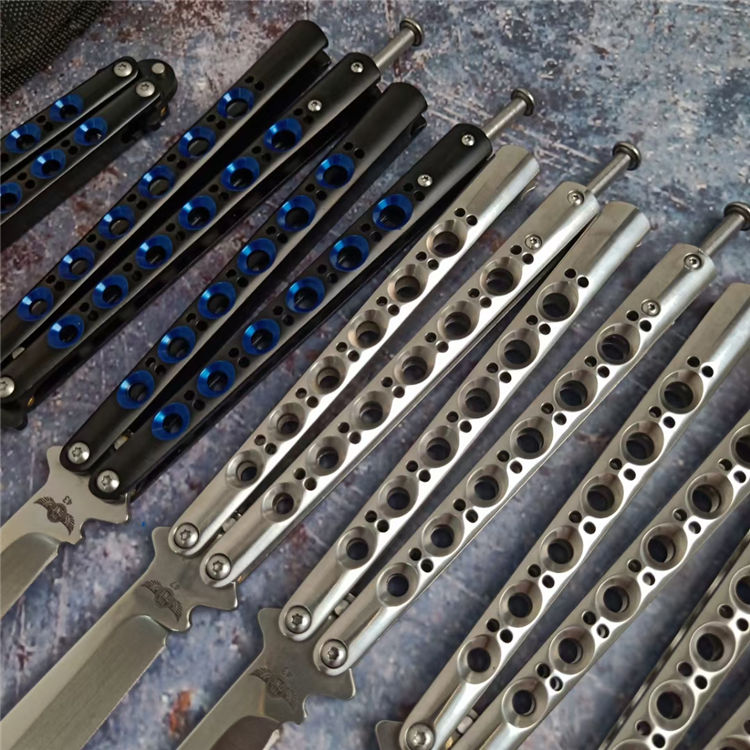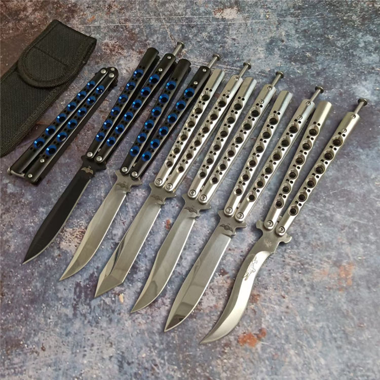 THE ONE镜面款BM系列蝴蝶甩刀 全长:24CM(打开) 刃长:9.5CM 刃厚:0.3CM 刃材:440C 硬度:59 重量:150克 刀鞘:刺绣尼龙刀鞘 铸钢柄镂空,压弹出刀