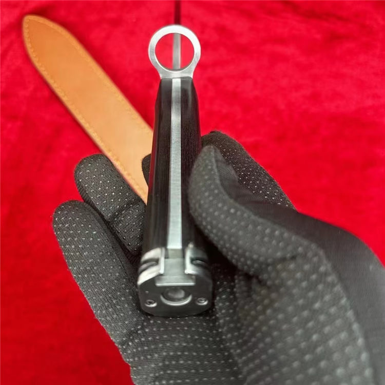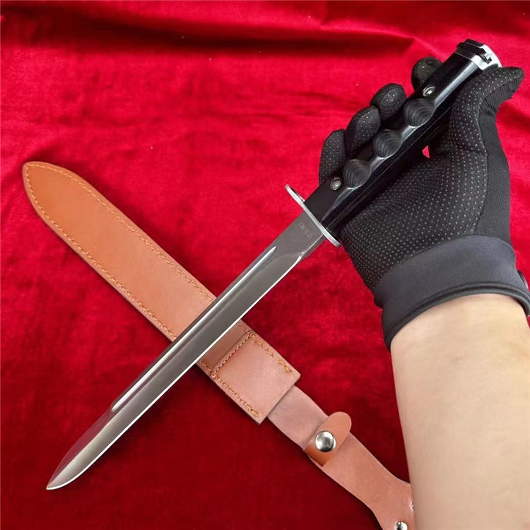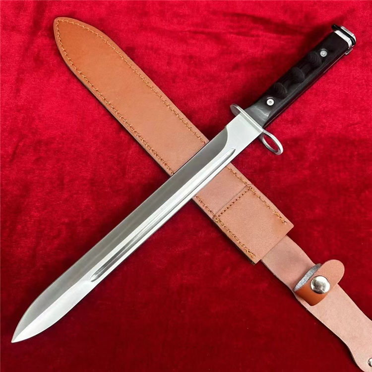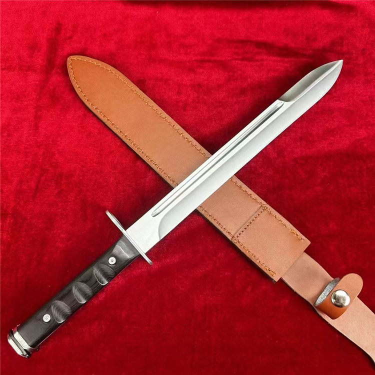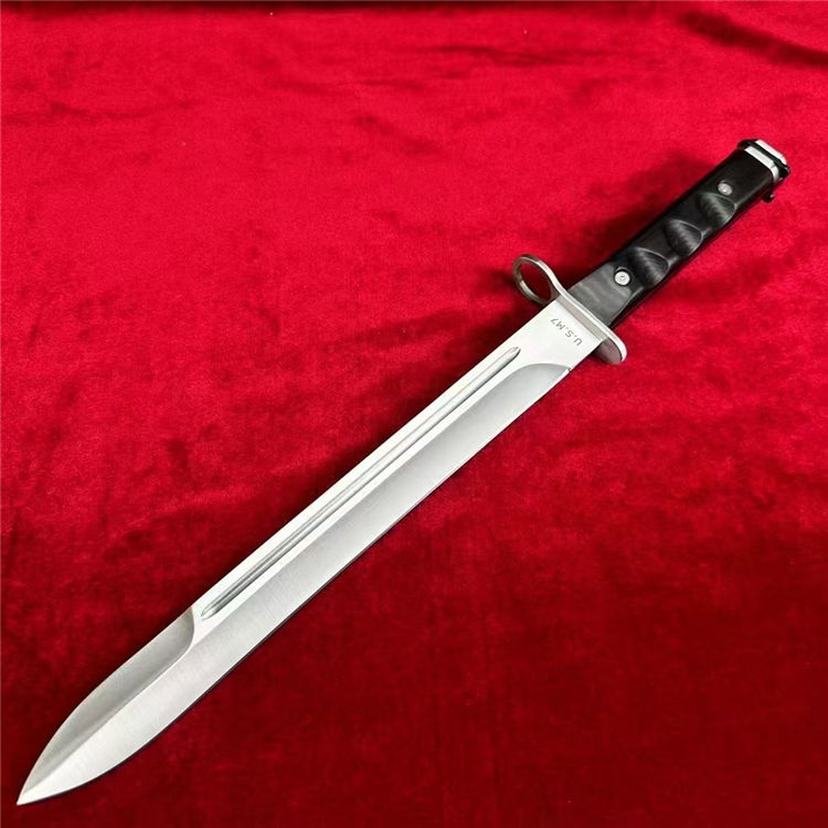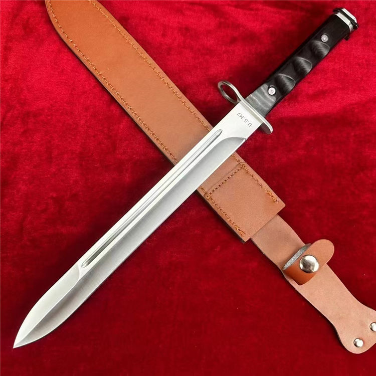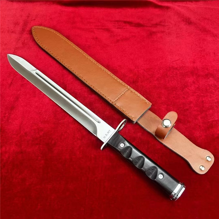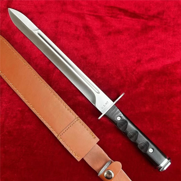 仪仗队加长版美军越战M7制式刺刀 全长:44CM 柄长:14CM 刃材:1095高碳钢 硬度:58-60HRC 表面:砂光 刃厚:0.45cm 柄材:越南黑檀木 鞘材:头层牛皮套 重量:300g 包装:礼盒
