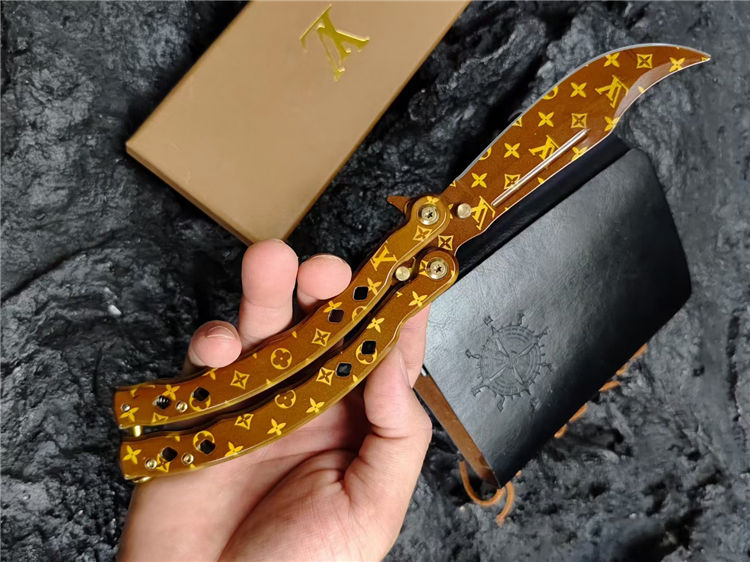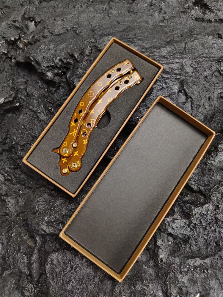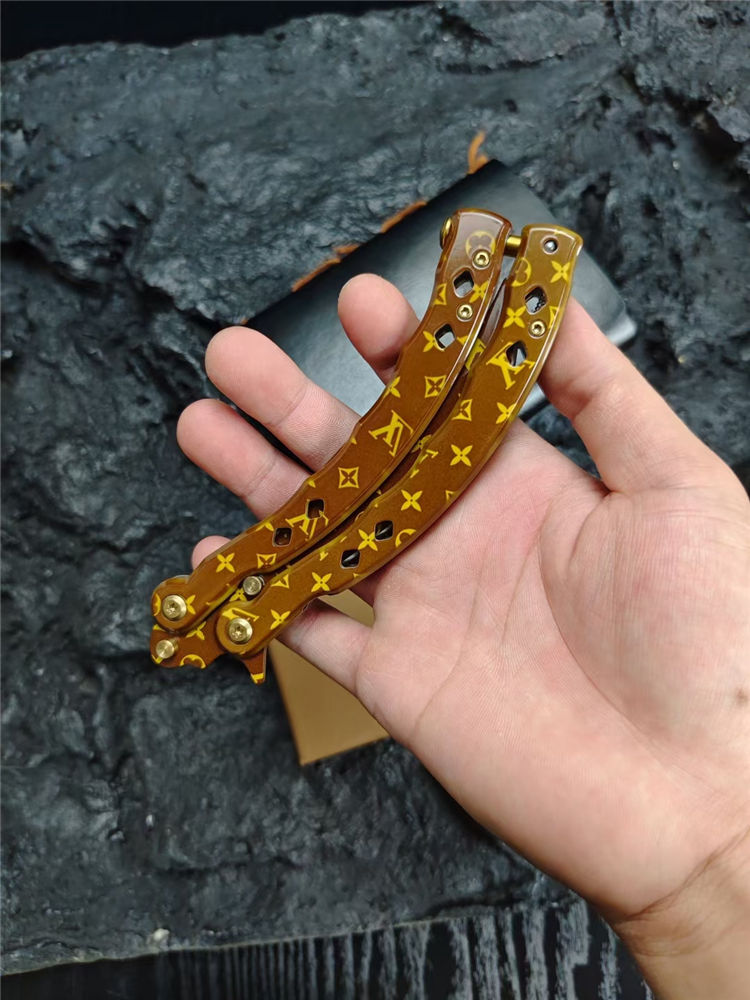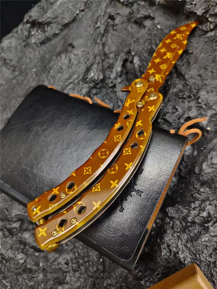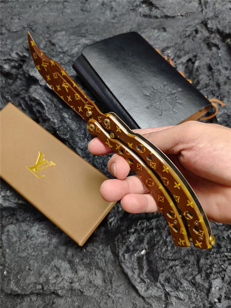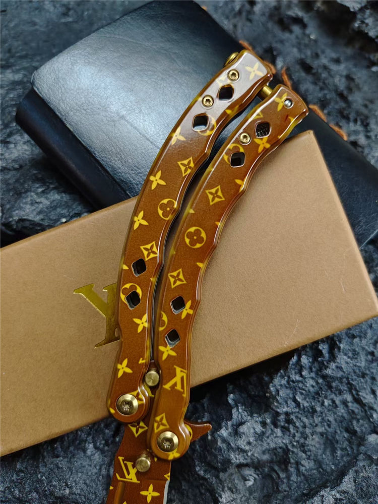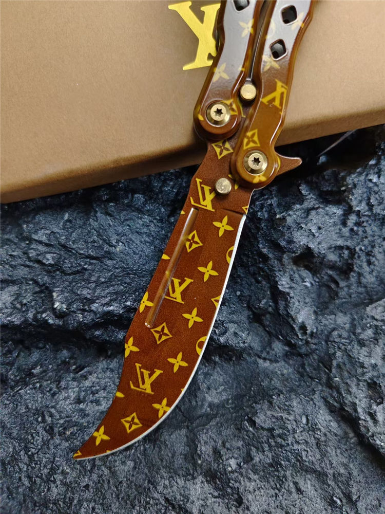 LV彩色甩刀 全长:24cm 刃长:9.5cm 柄长:14.5cm 刃宽:2.4cm(最宽处) 刃厚:2.8mm 刃材:440C 硬度:58HRC 表面:特殊涂层 重量:215克(含包装) 配原厂包装+礼品盒