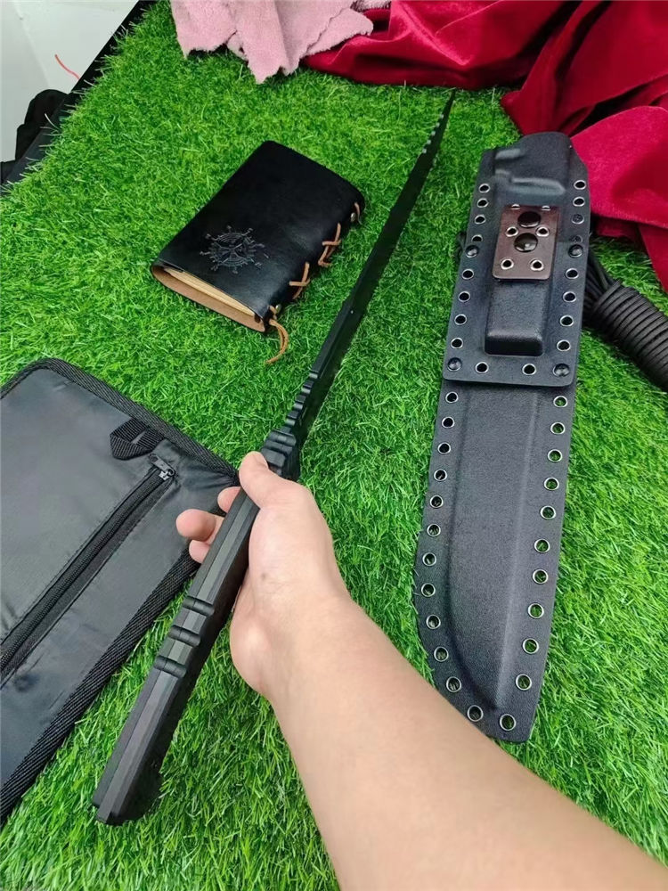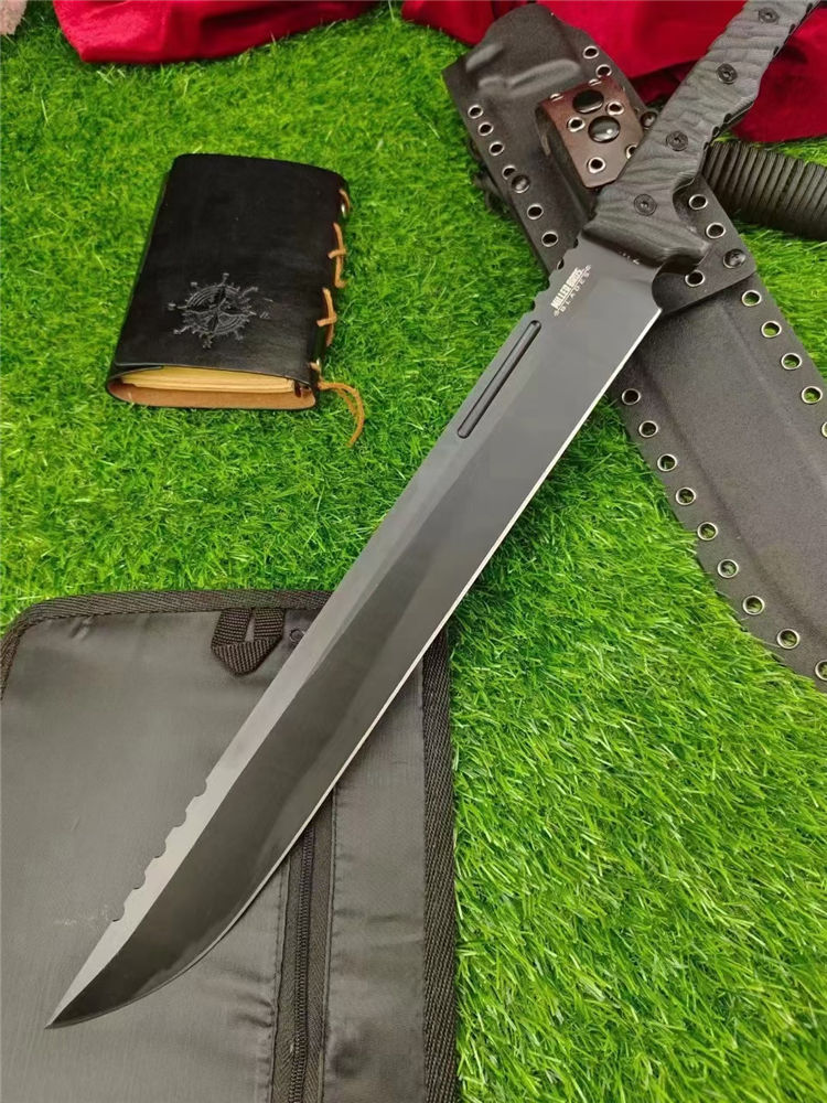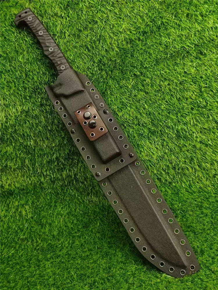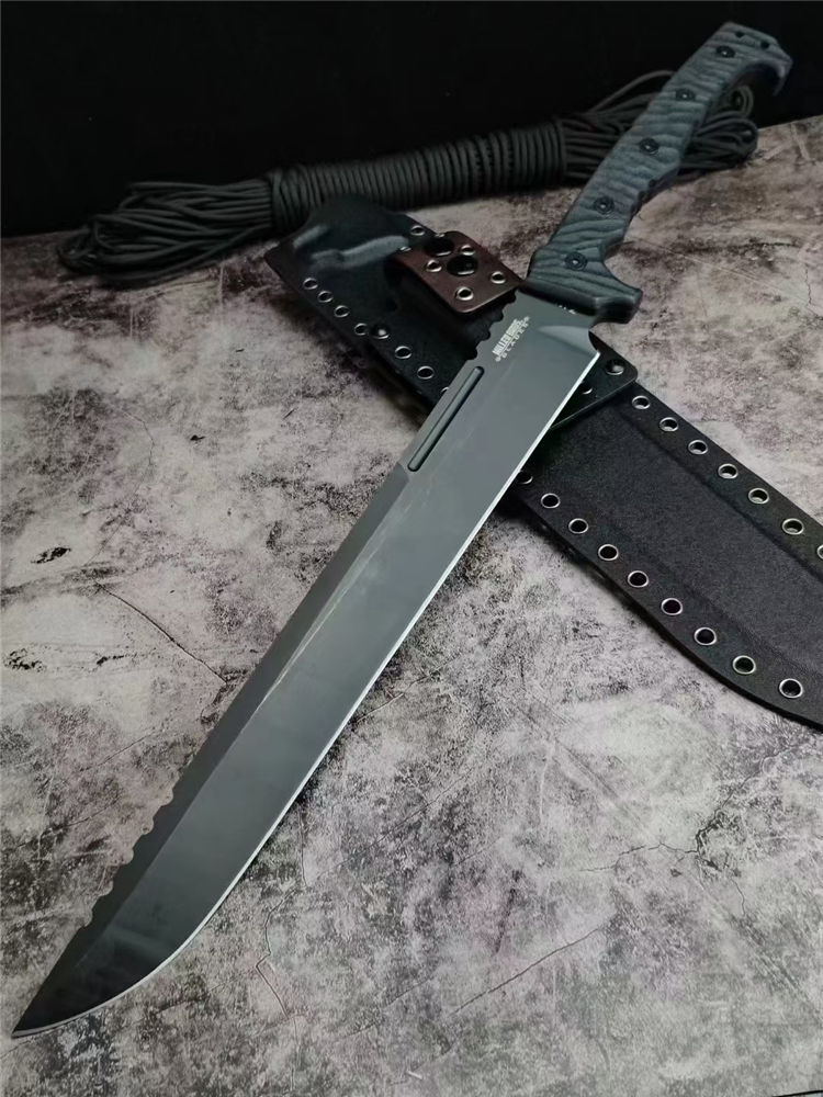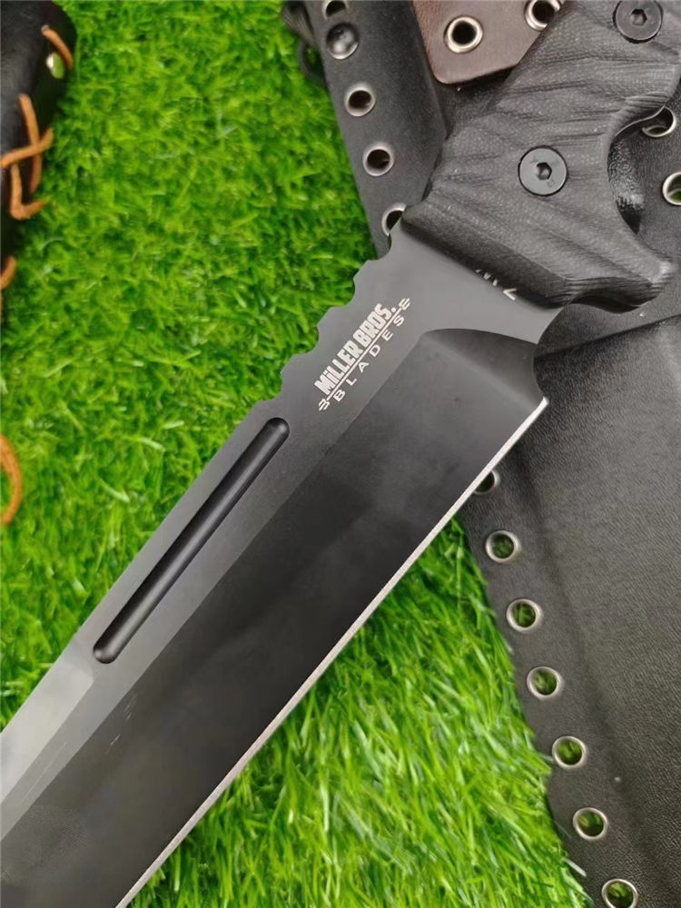 米勒屠龙双手大砍刀 总长:580mm 刃长:350mm 刃厚:6.2mm 刃宽:4.5cm 炳长:215 钢材:Z-wear 硬度:62-63HRC 手柄:黑G10色 重量:1189g含鞘 裸刀:862g 刀鞘:手工进口K版鞘+意大利进口植鞣手皮工制作 包装:黄色子盒
