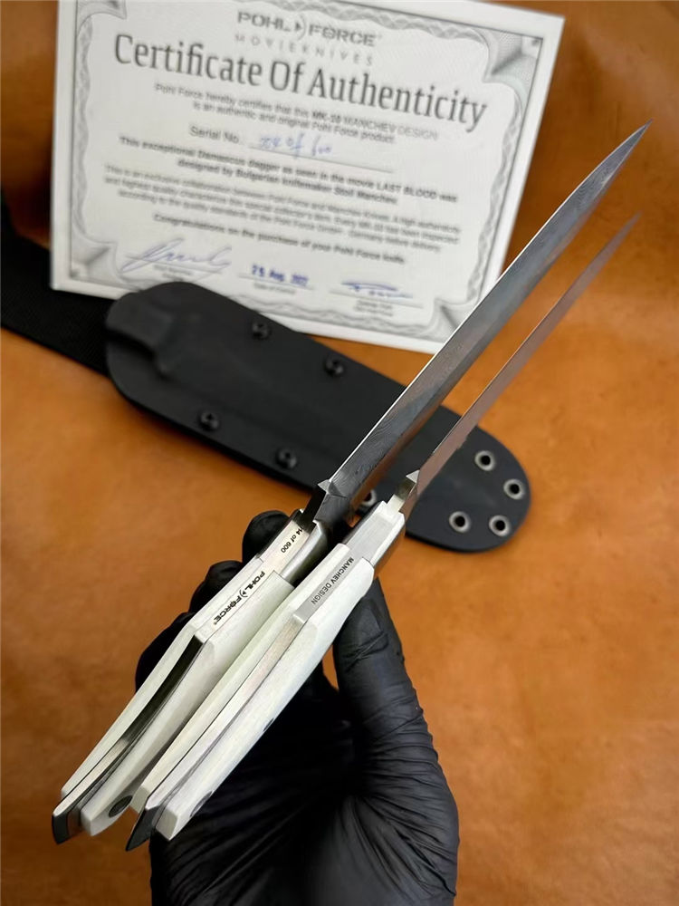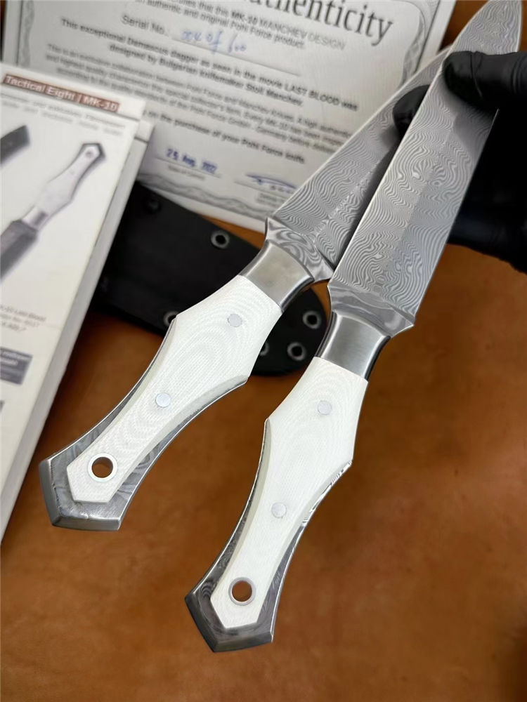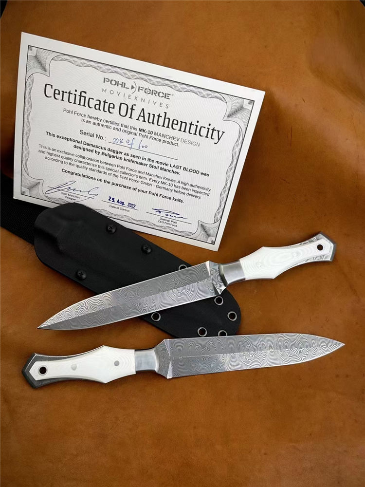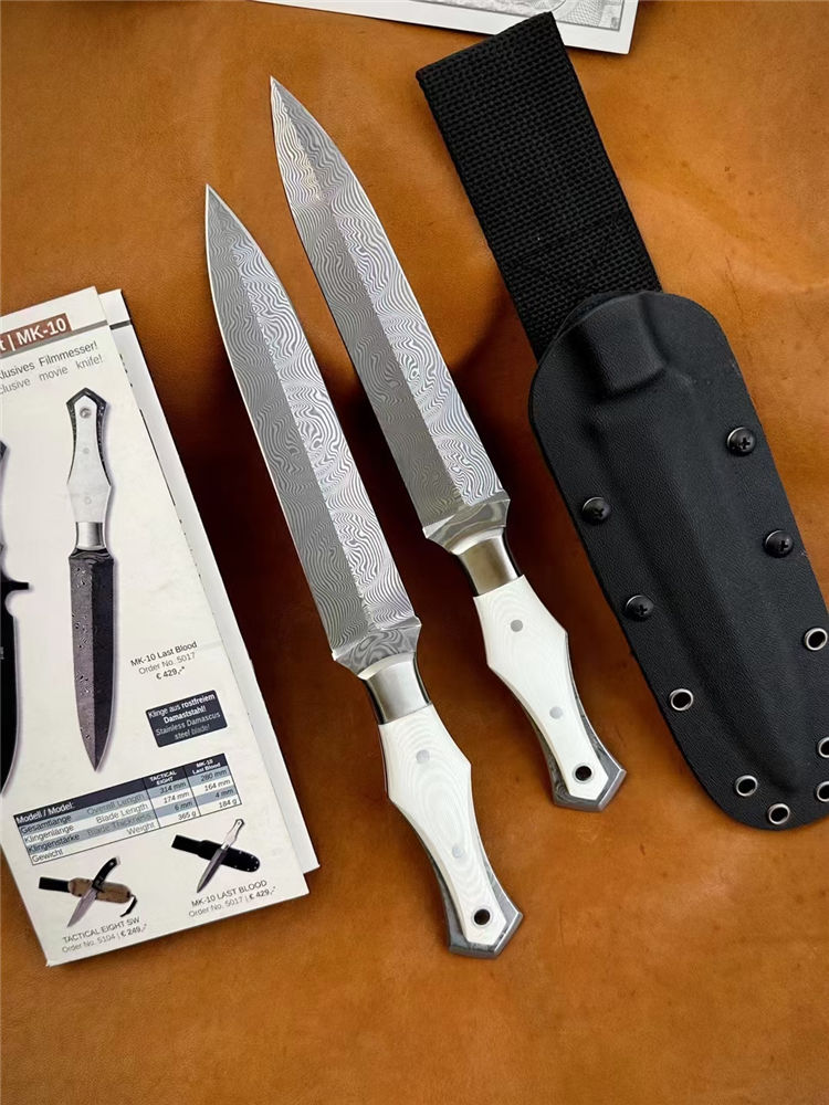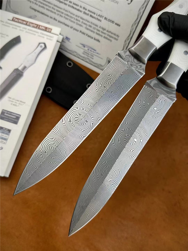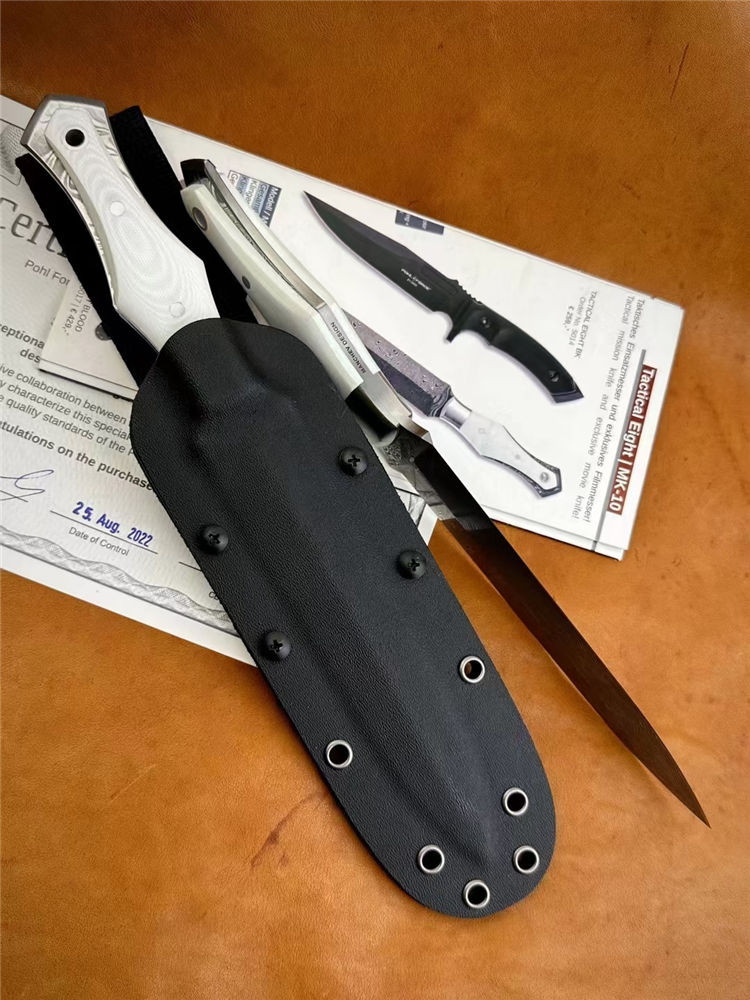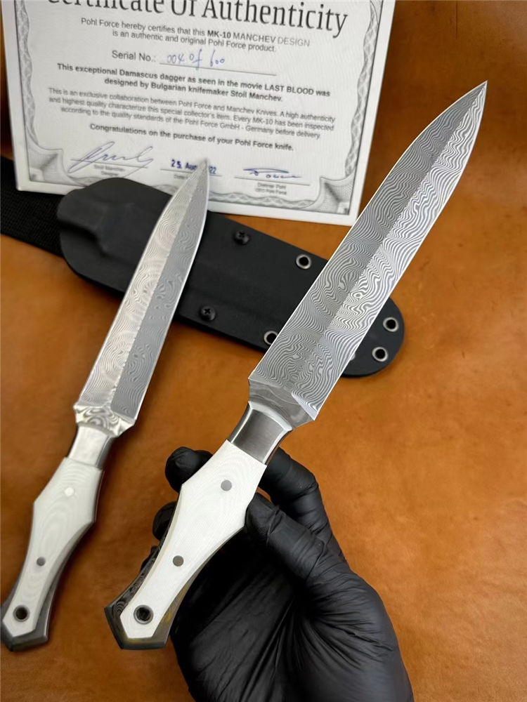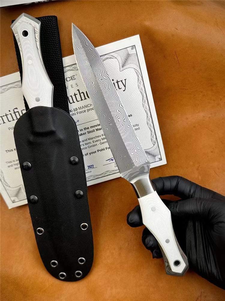 大马士革波尔武力MK10直刀 总长:280mm 刃长:164mm 刃厚:4mm 重量:185克 材钢:大马士革大玫瑰纹 硬度:60-61HR 手柄:G-10/爱德尔斯塔尔 刀鞘:Kydex®-带适配器(适合腰带宽达55mm)套装包含 配件:MK-10最后的血Kydex®-剪纸,收藏袋,照片