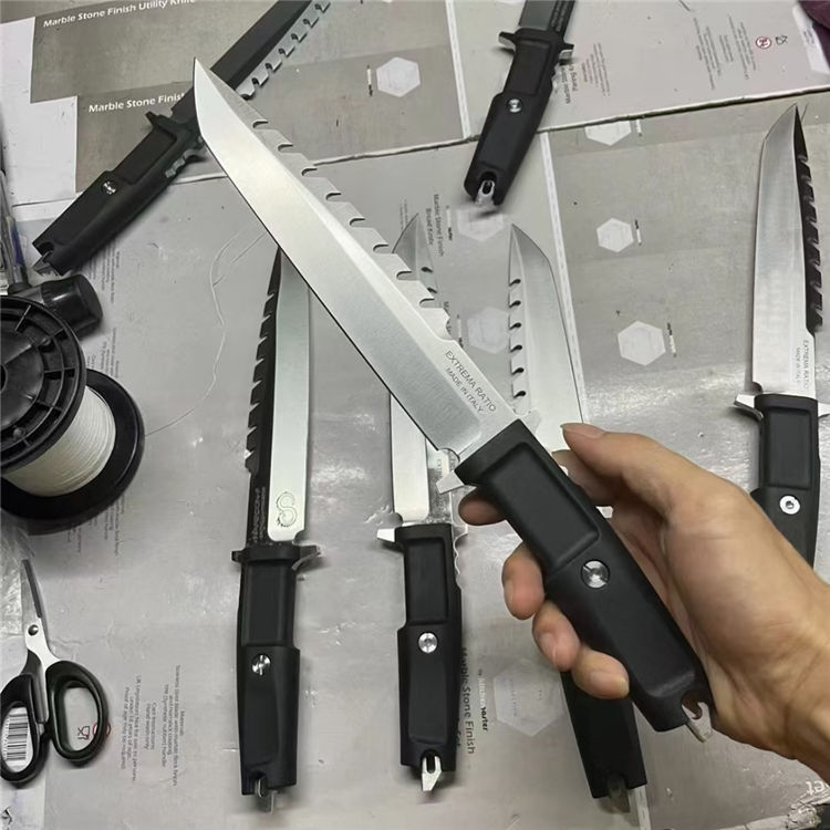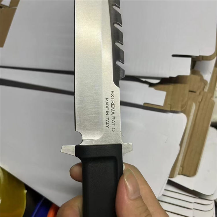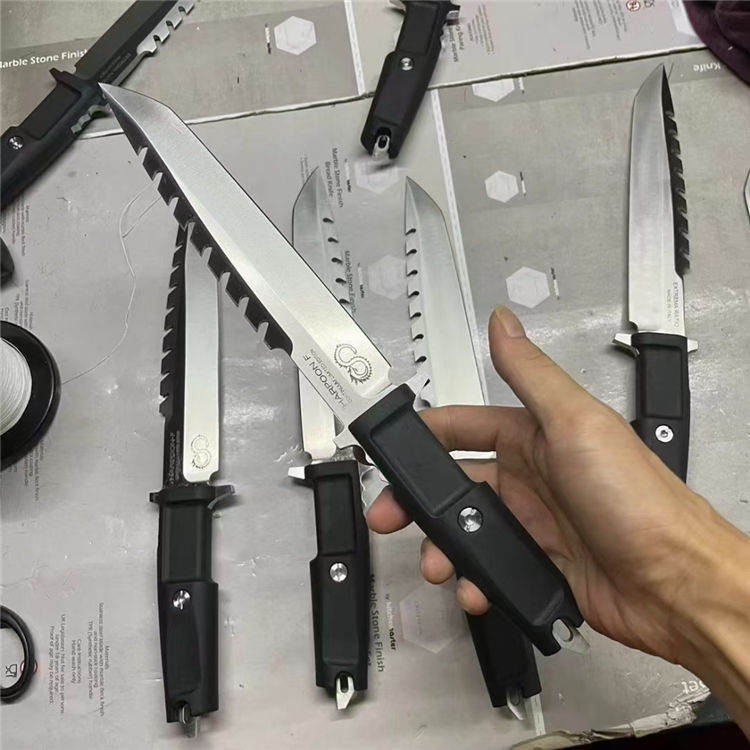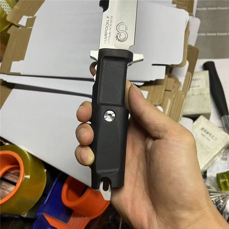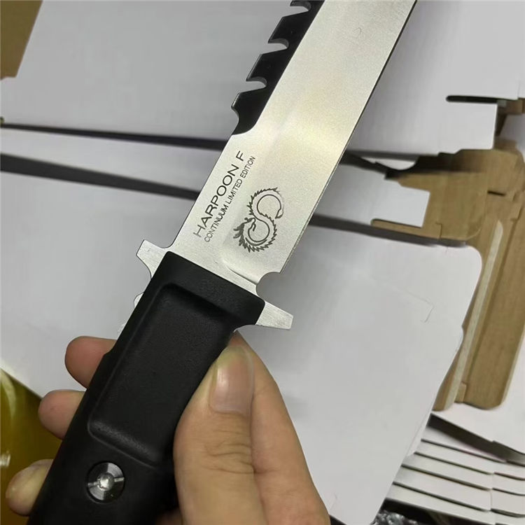 复刻版极端武力捕鲸叉直刀 全长:34mm 刃长:200mm 刃厚:6mm 刃宽:38mm 刃材:A8 硬度:60HRC 柄材:Forprene 重量:350g