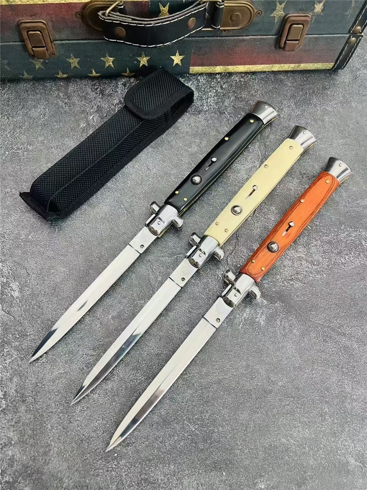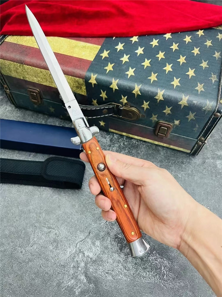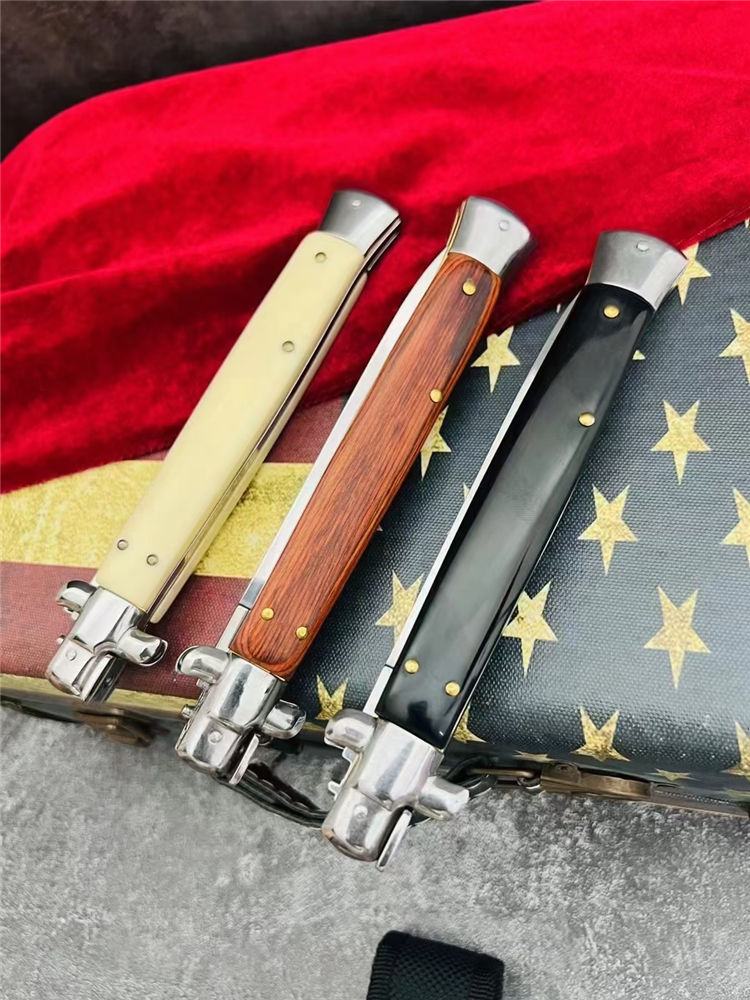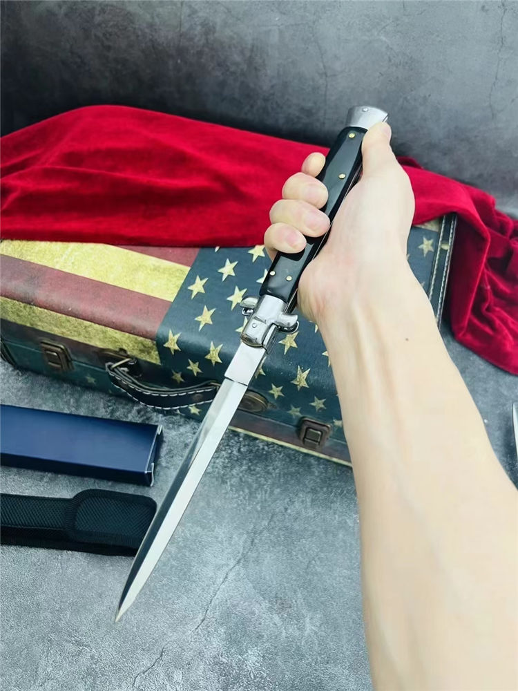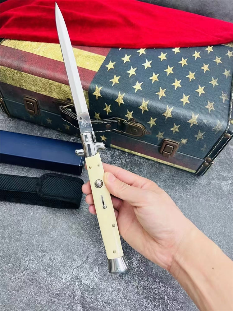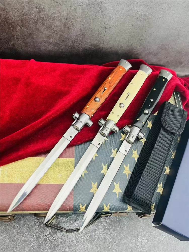 13寸黑手党跳刀 全长:33.1CM 刃长:14.8CM 刃宽:1.5CM 刃材:440C 刃厚:3MM 柄长:18.3CM 柄材:彩木柄,黑色树脂柄,白色树脂柄 净重:172G