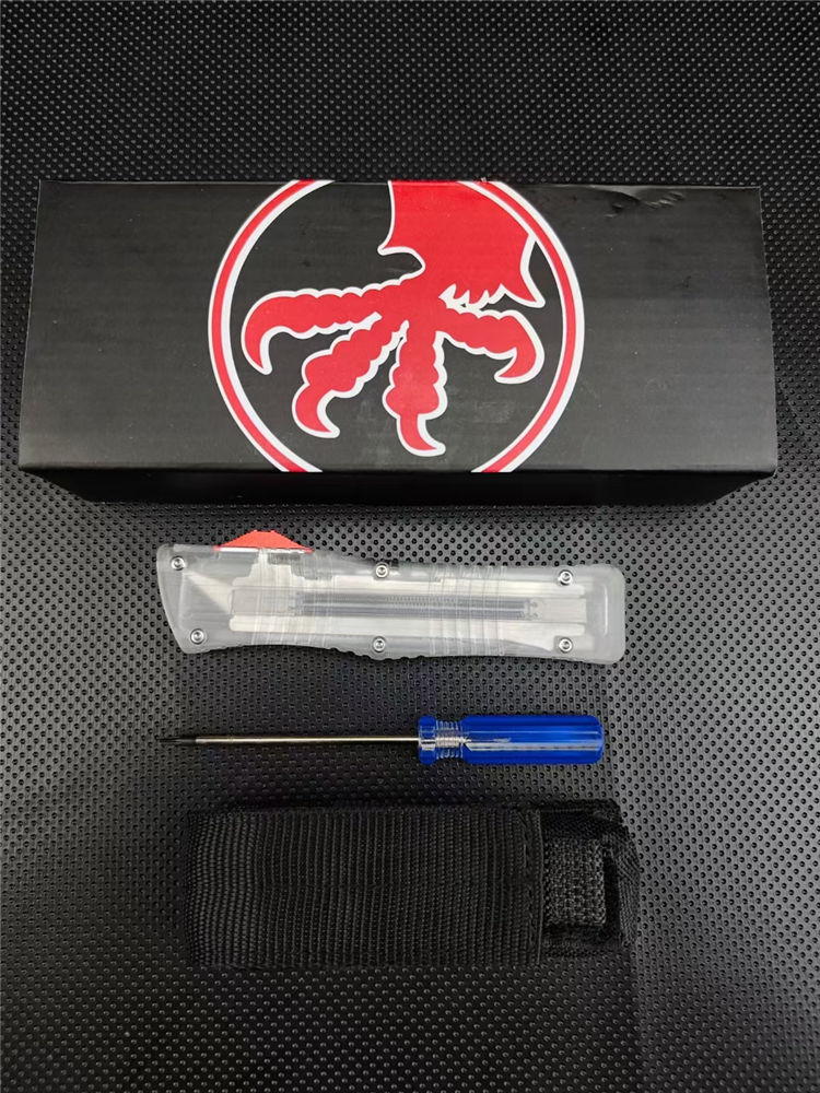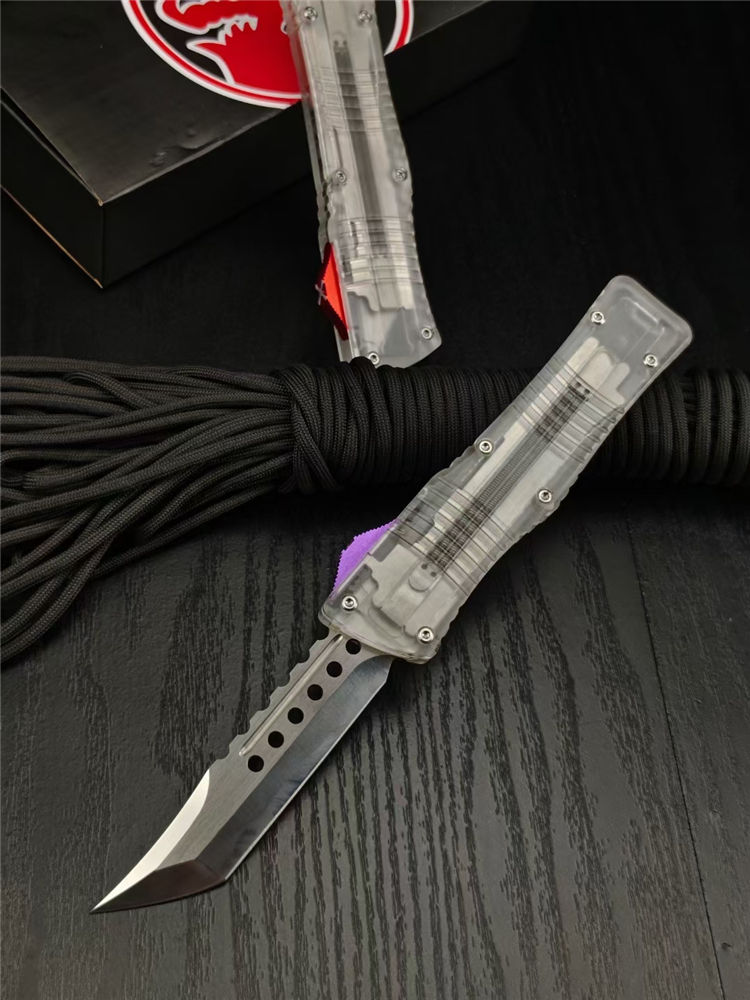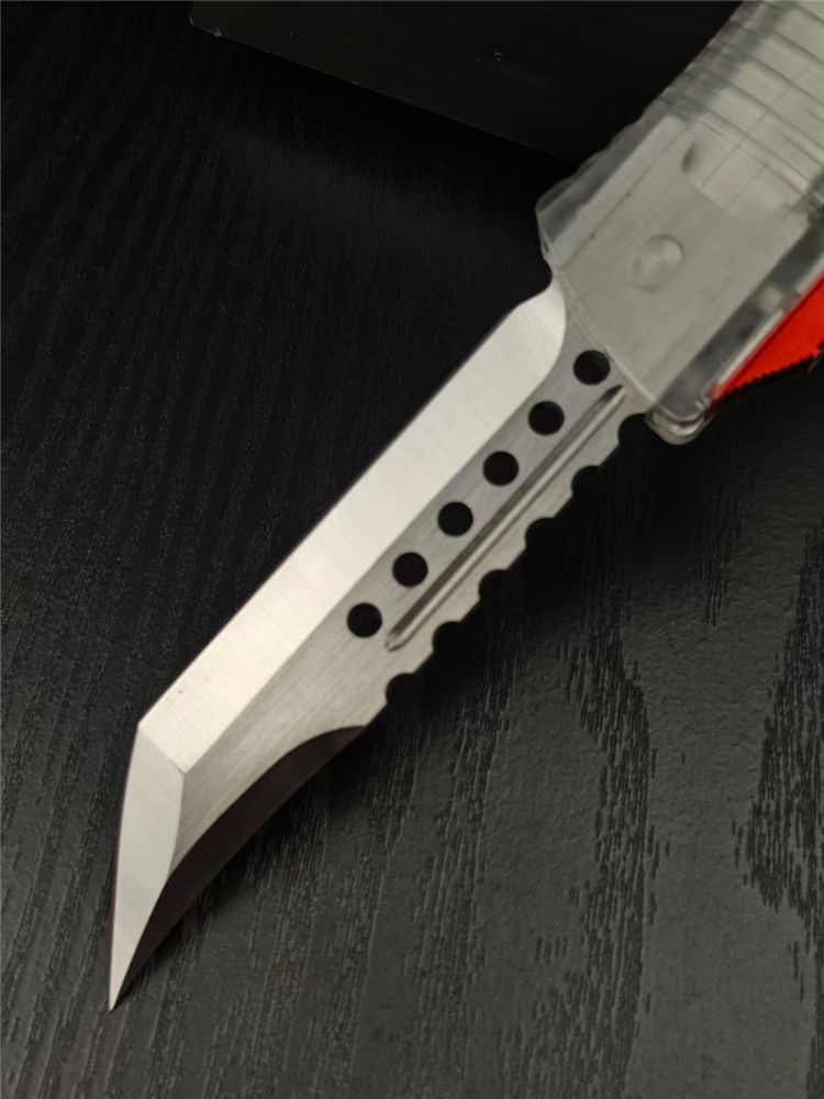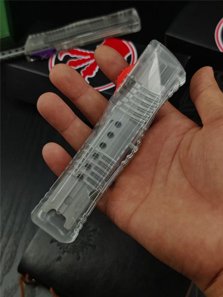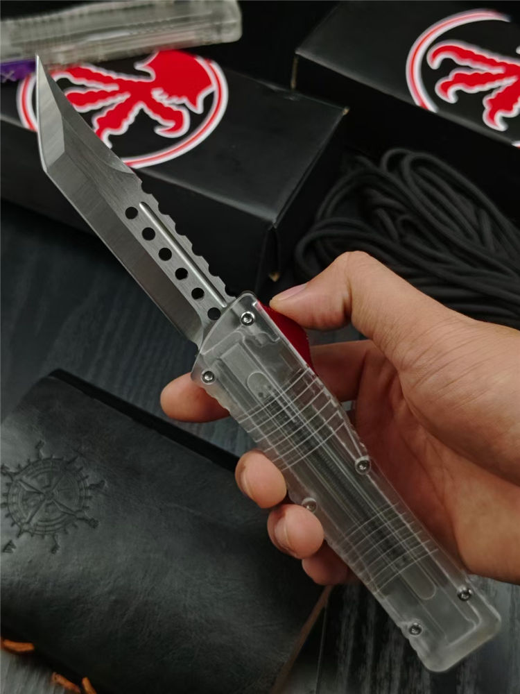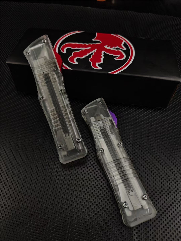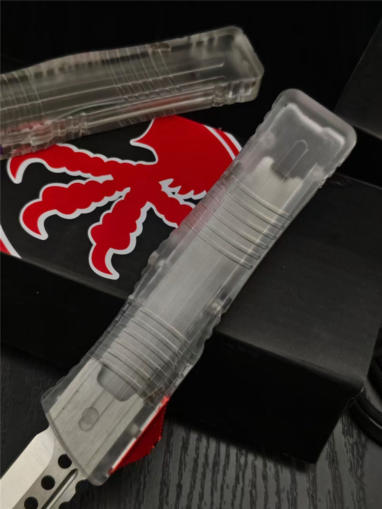 微技术透明版大龙直出跳刀 总长:23CM 刃长:9.2CM 厚度:3.3MM 刃材:440C 硬度:59HRC 锁定:按钮锁 柄材:树脂 净重:94克 包装:彩盒刀套 附件:尼龙套,彩盒,送拆工刀具