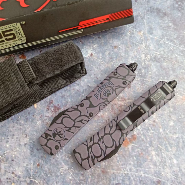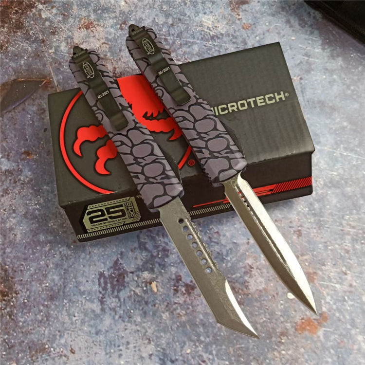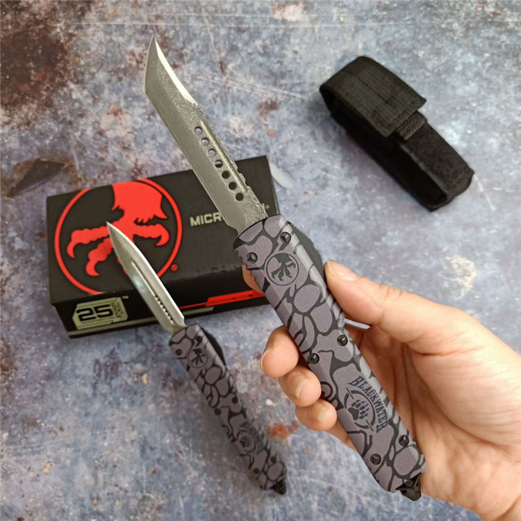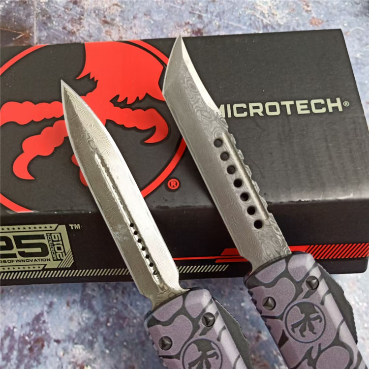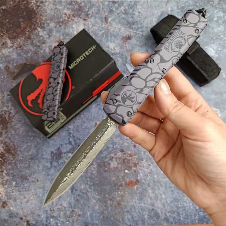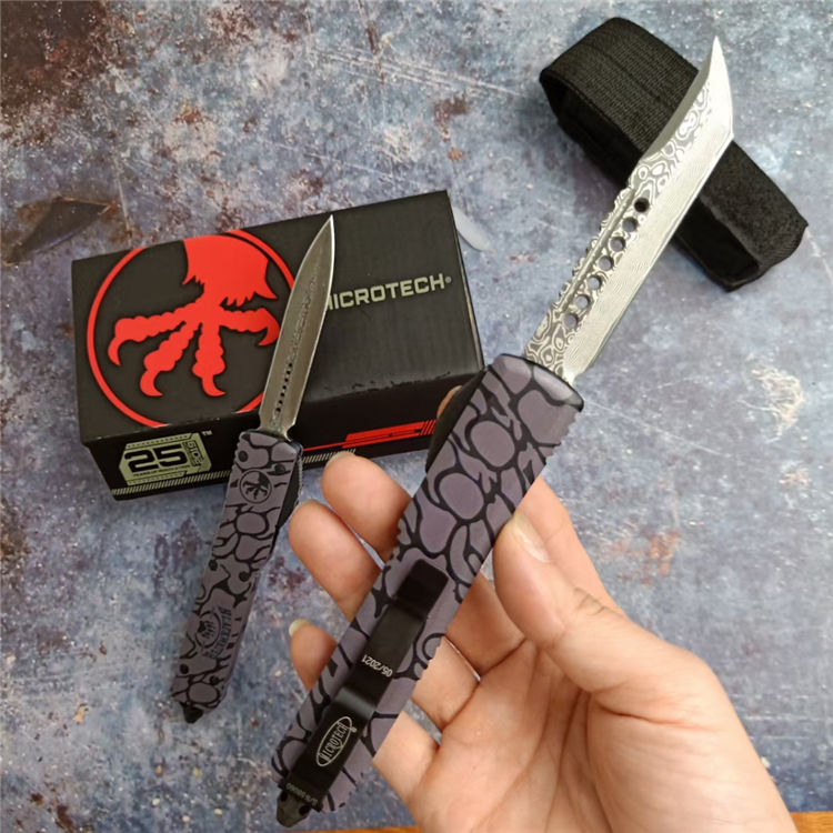 大马士革微技术ELMAX直出跳刀 全长:21.5CM 刃长:8.5CM 柄长:12.5CM 刃宽:1.5CM 刃厚:0.32CM 刃材:vg10大马士革 柄材:铝合金三D打印图案 刀型:直跳 锁定:按钮锁 刀重:97克 重量:164克(含包装) 附件:尼龙套,说明书,彩盒,送拆刀工具