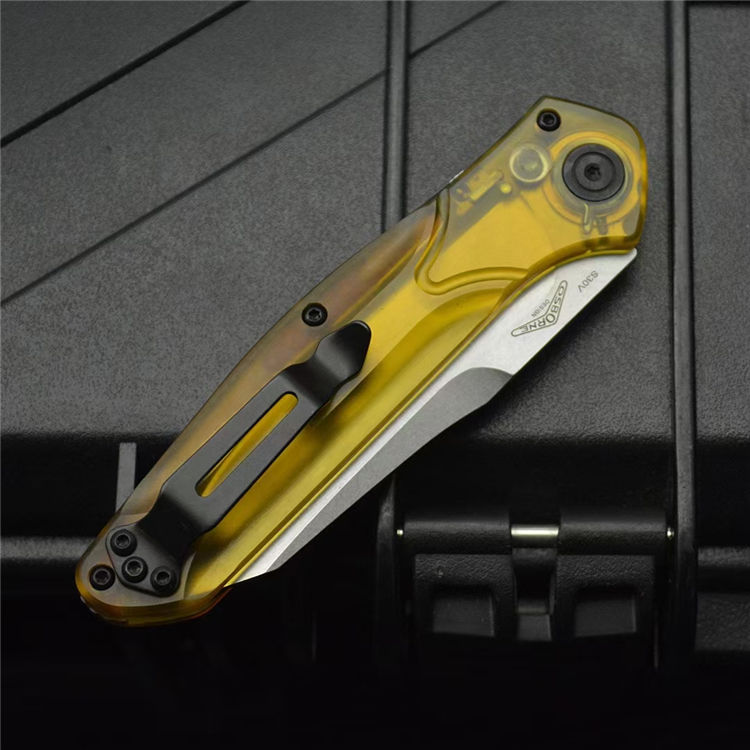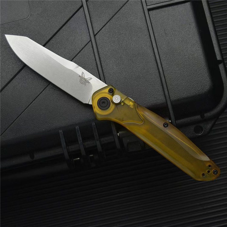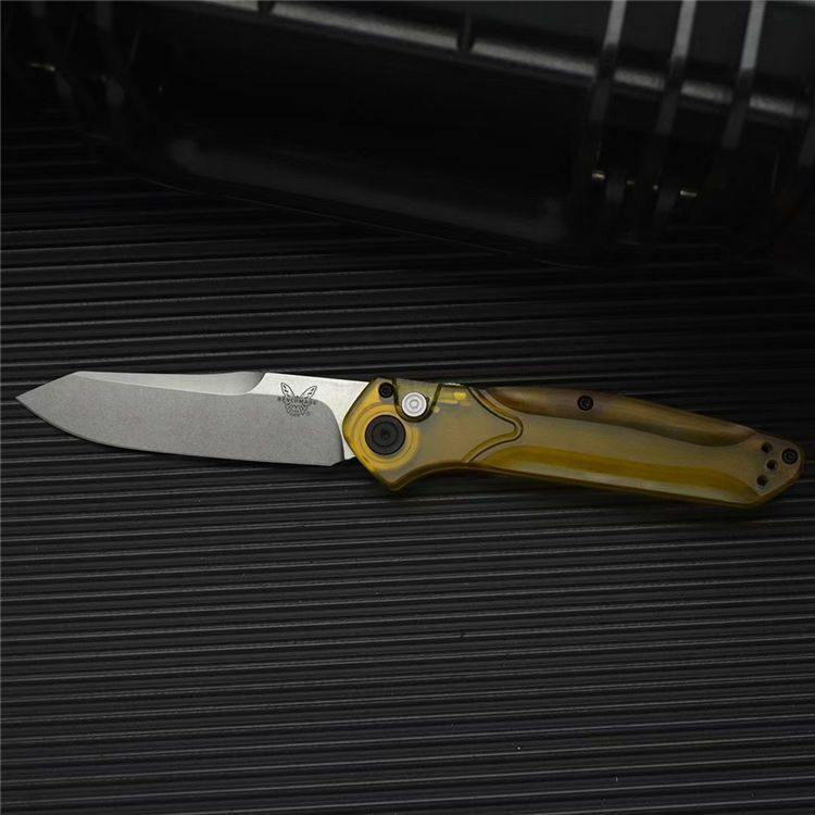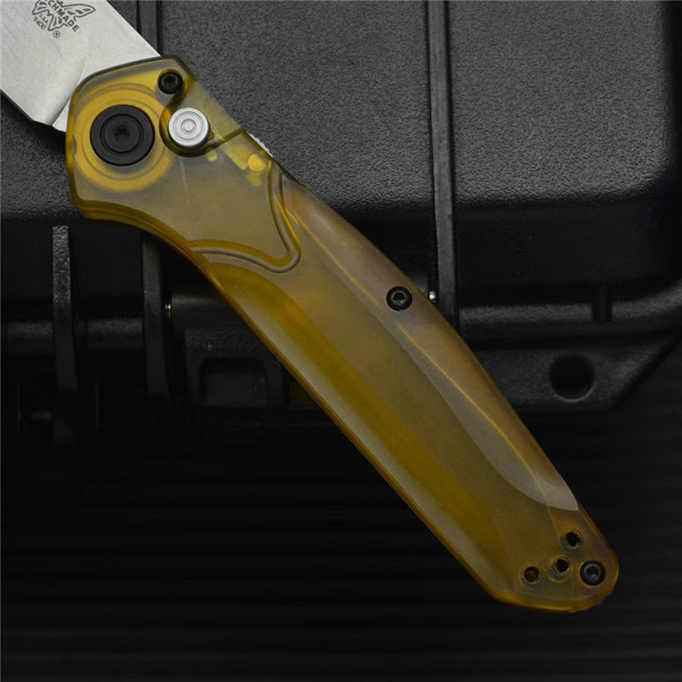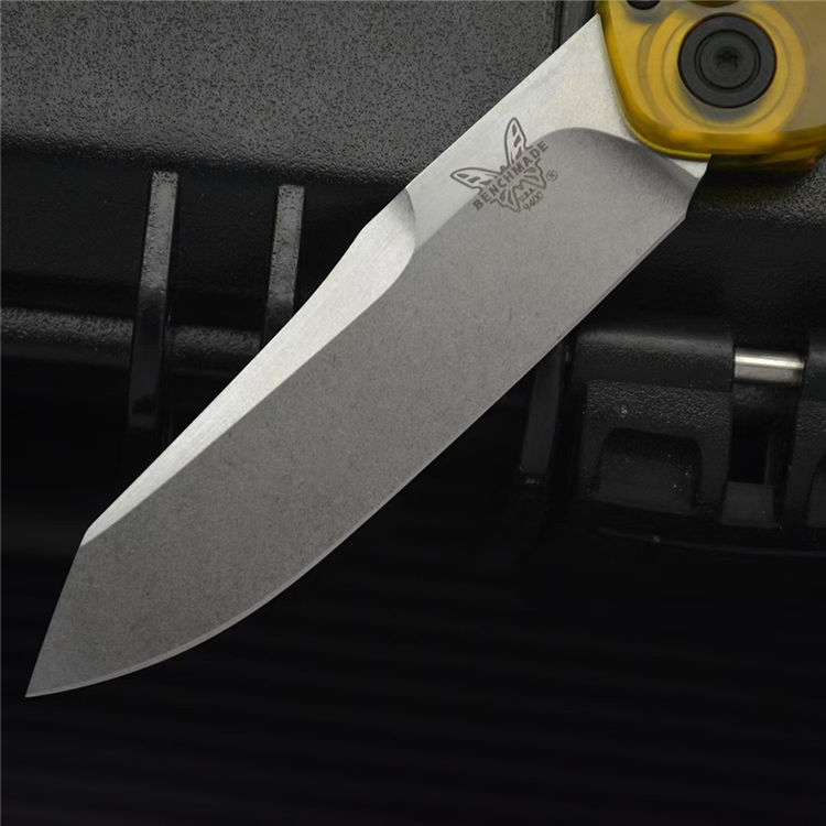 蝴蝶BM9400侧开跳刀 全长:198mm 刃长:83mm 闭合:115mm 钢材:D2钢 刃厚:3mm 表面:石洗 净重:59g 硬度:60HRC 柄材:PEA透明材料 包装:原装黑彩盒,说明书,绒布袋