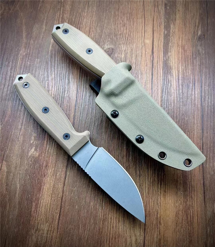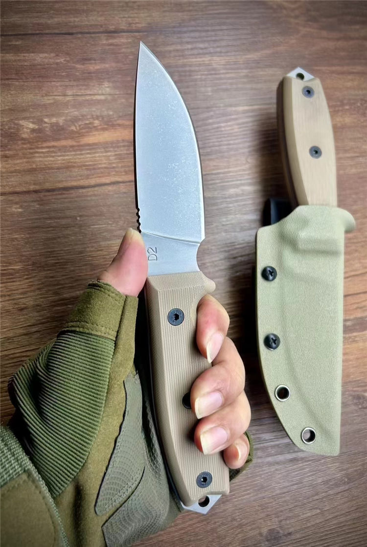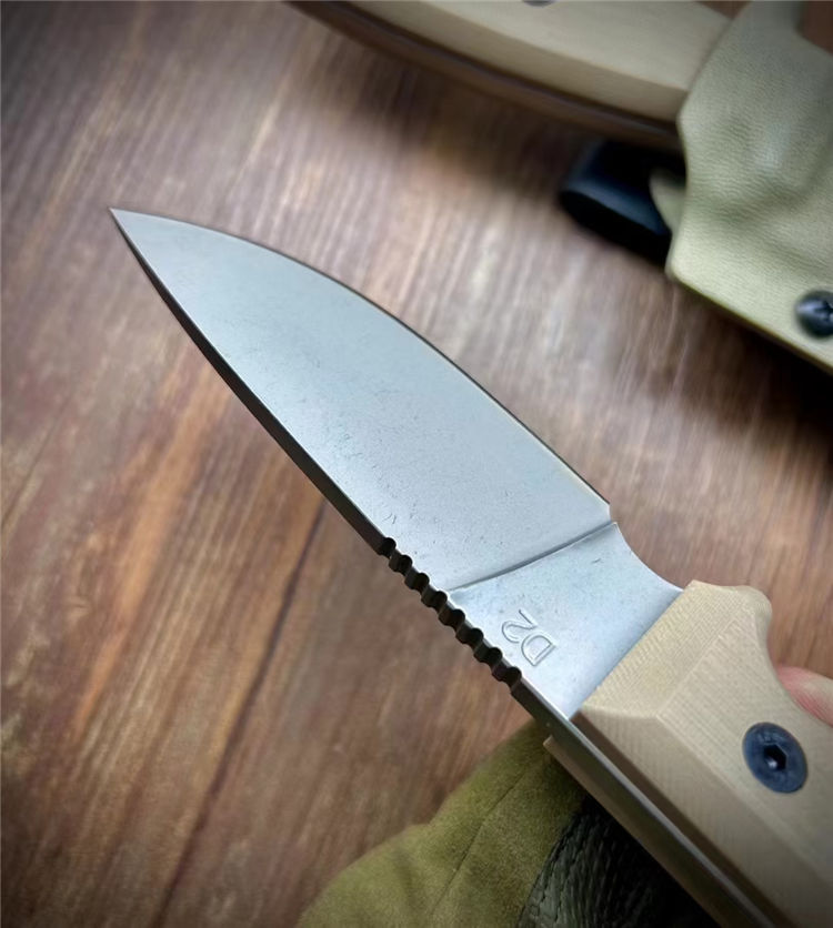 安大略RAT系列生存直刀 全长:225mm 刃长:95mm 刃厚:5mm 材质:D2钢 柄材:沙色g10手柄 硬度:60 刀鞘:沙色K料做的K鞘,真空热处理、包装精美合子